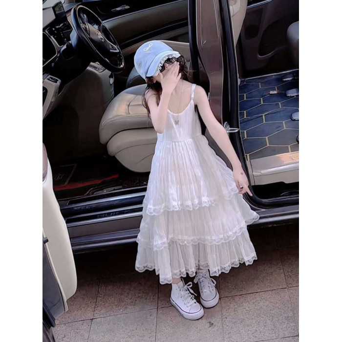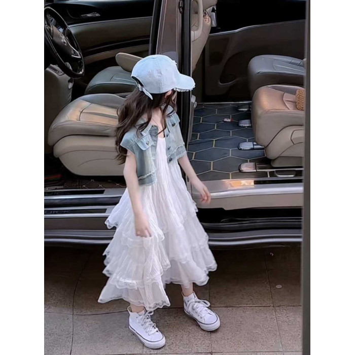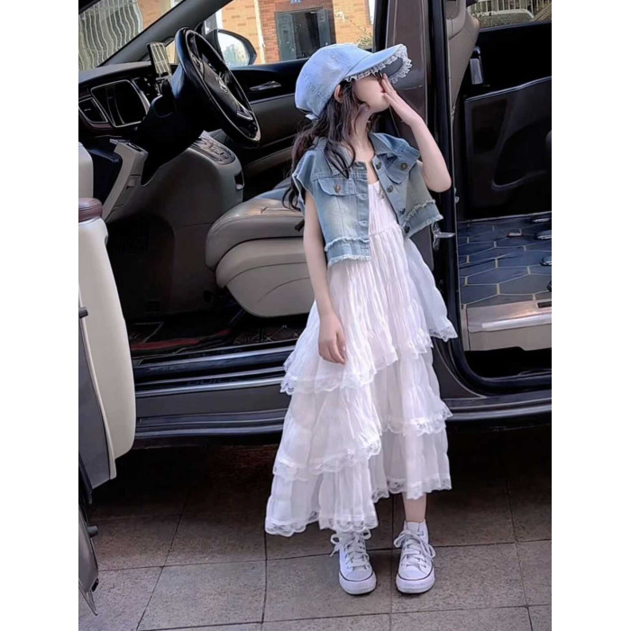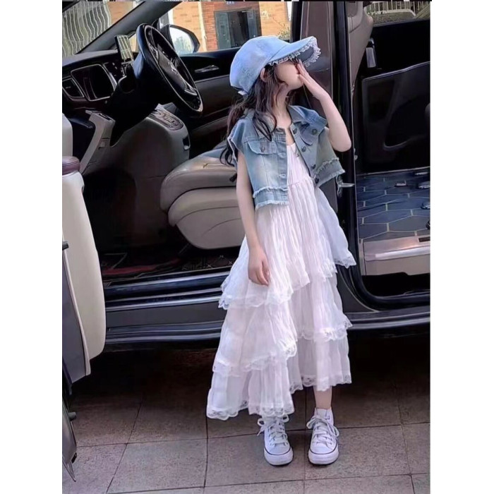 女童連衣裙夏季套裝兒童夏裝牛仔馬甲中大童吊帶蛋糕長款沙灘裙子