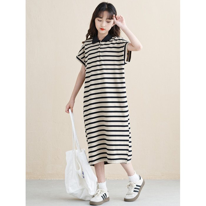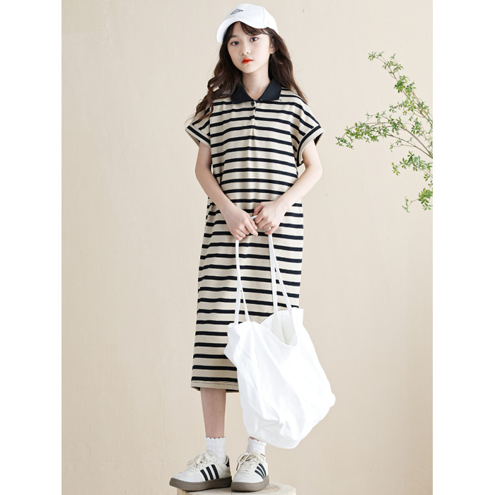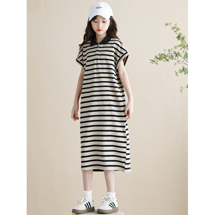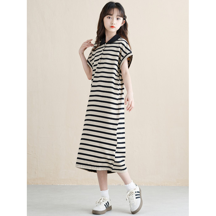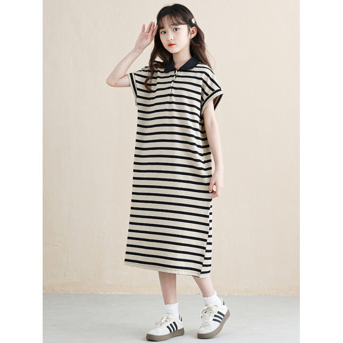 女童連衣裙夏季2025新款韓版女孩條紋裙子長款大童兒童POLO裙好看