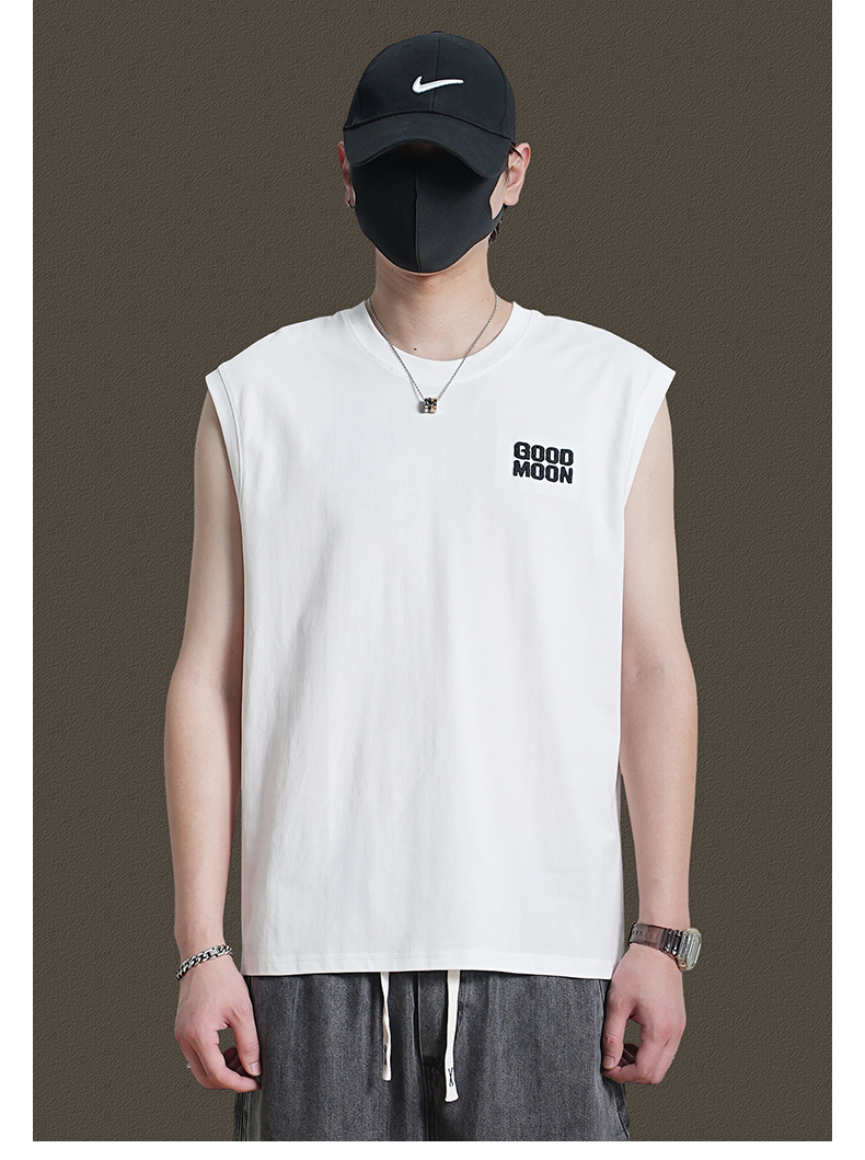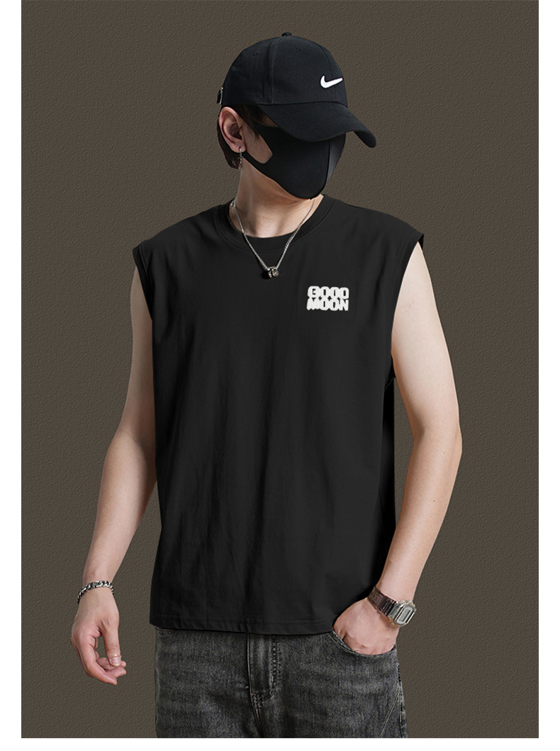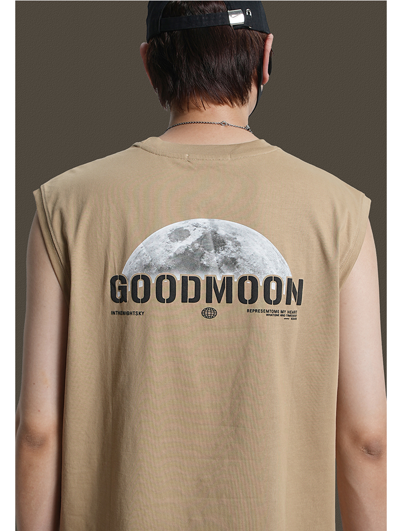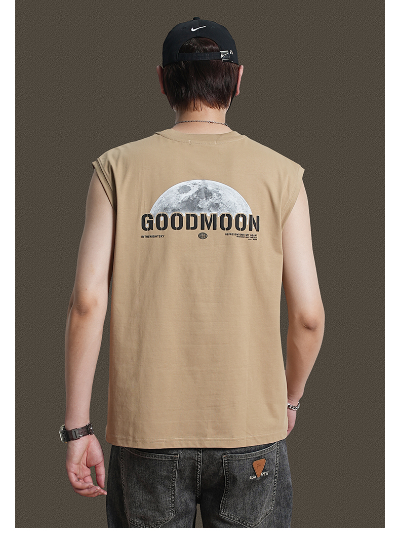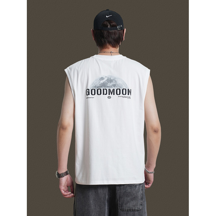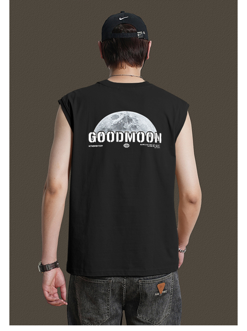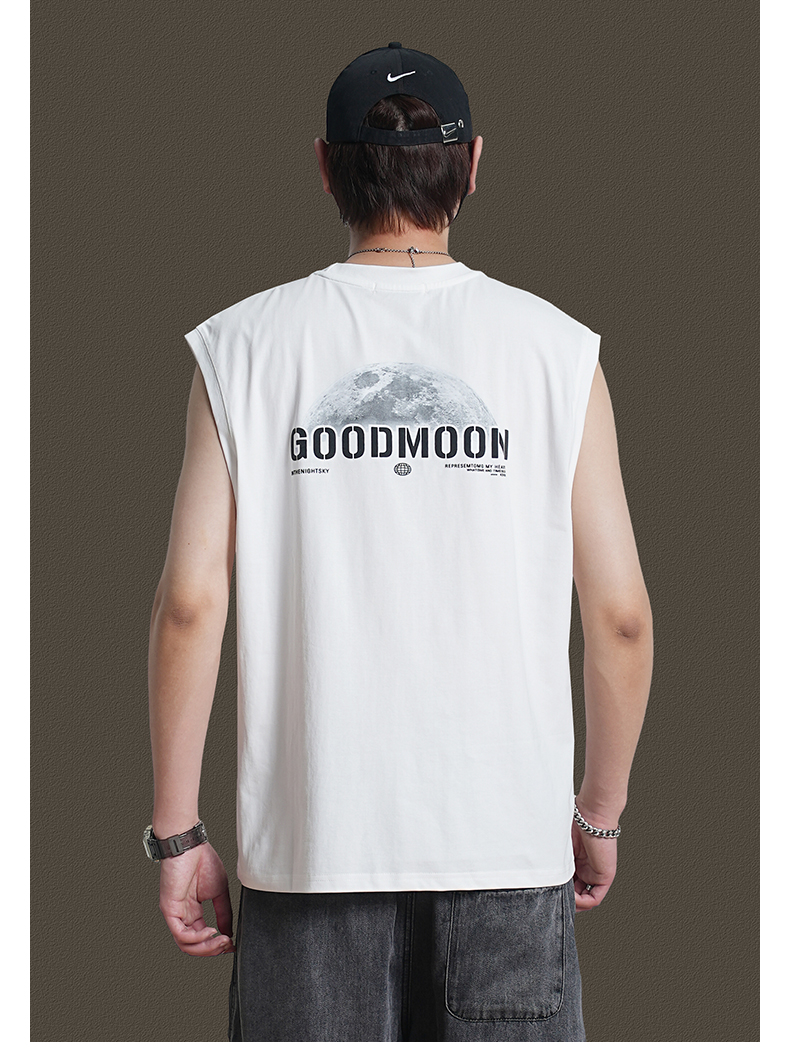 美式重磅純棉背心男士夏季圓領無袖T恤休閒背心刺綉背後月球印花