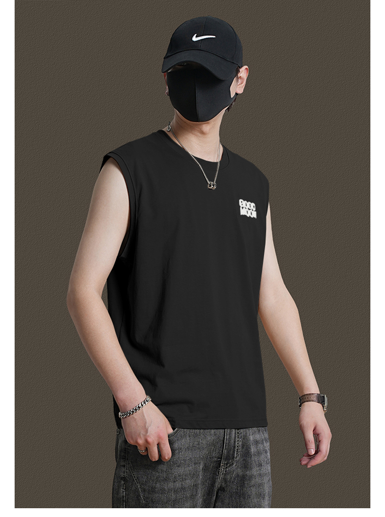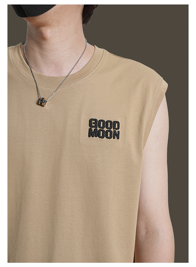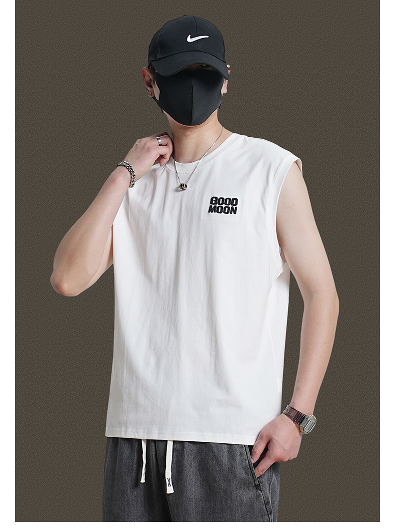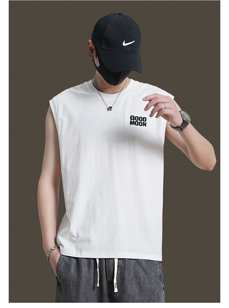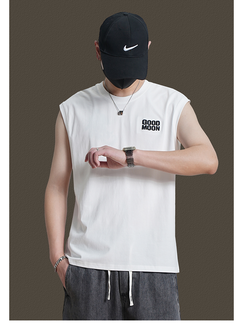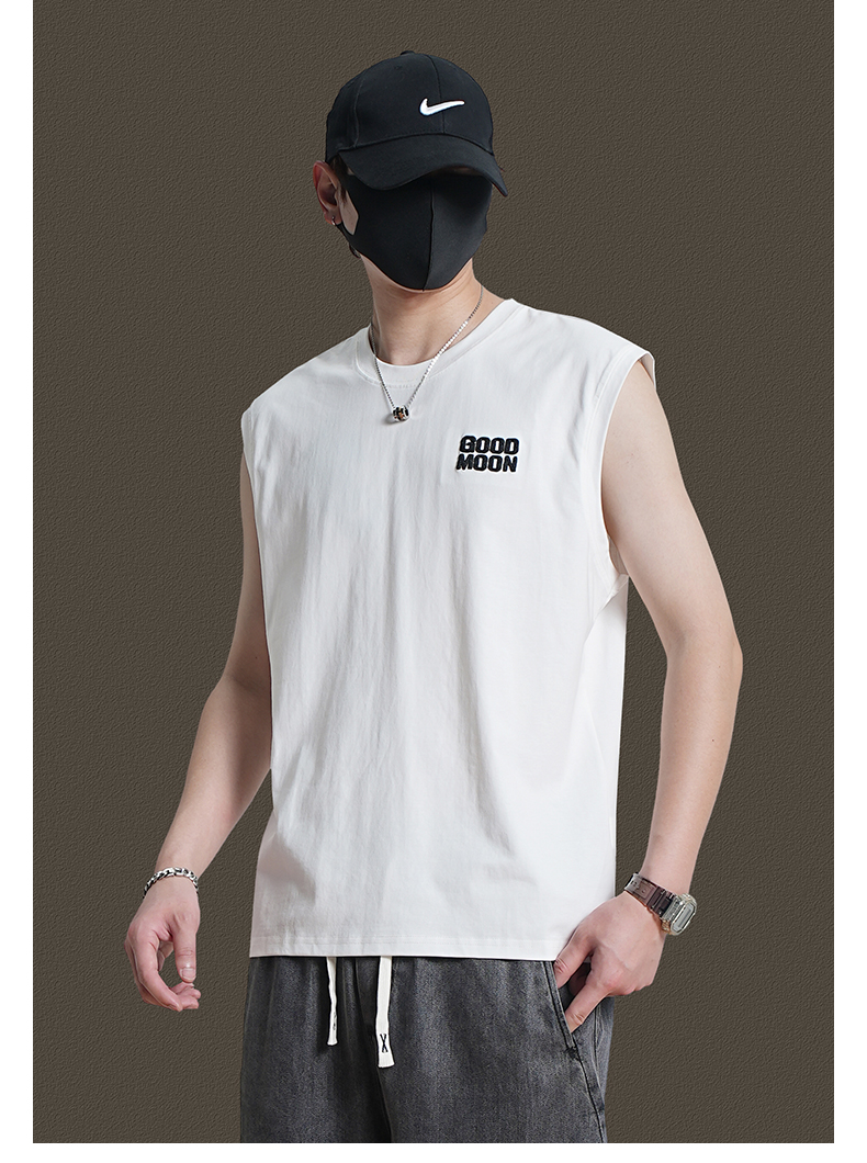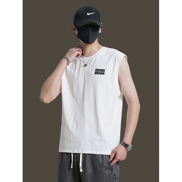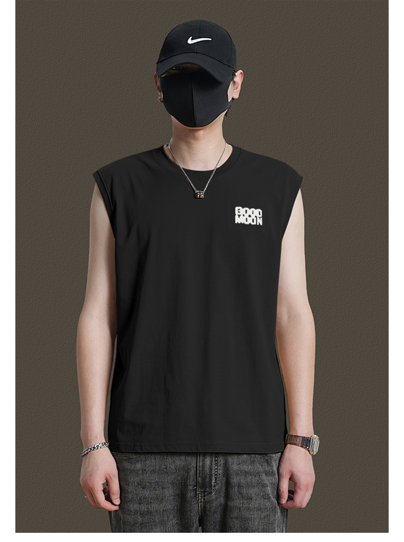 美式重磅純棉背心男士夏季圓領無袖T恤休閒背心刺綉背後月球印花