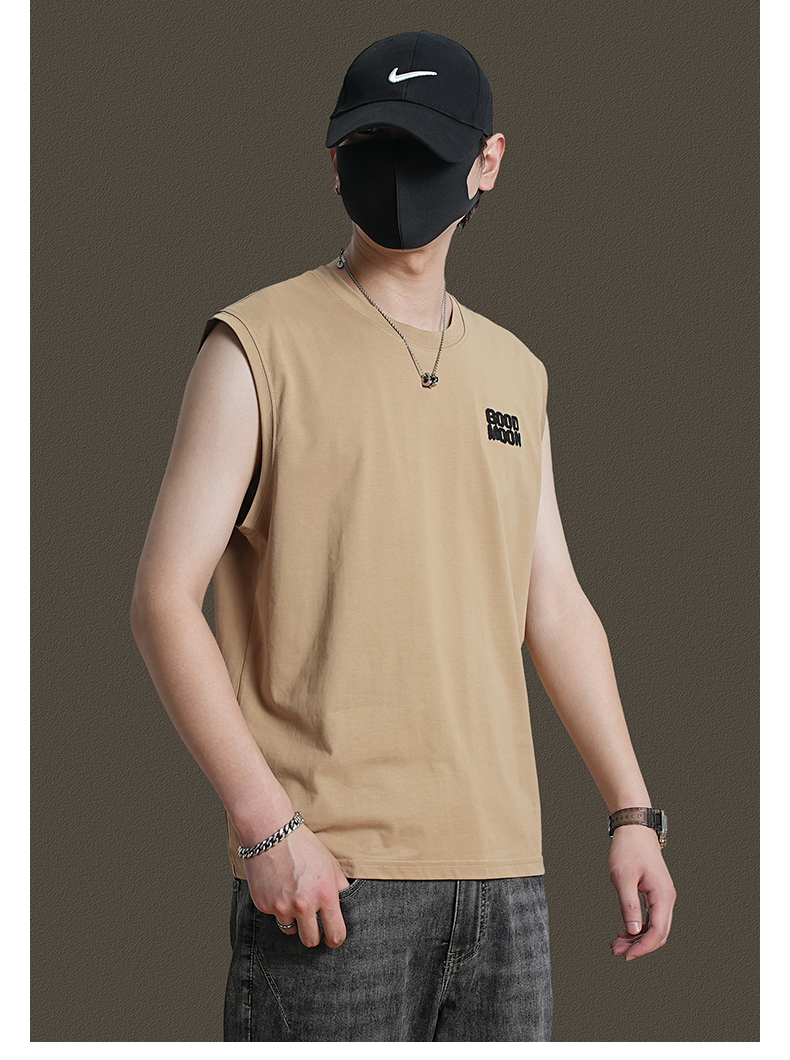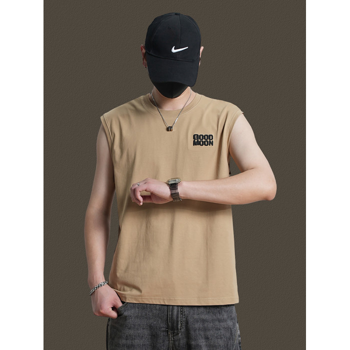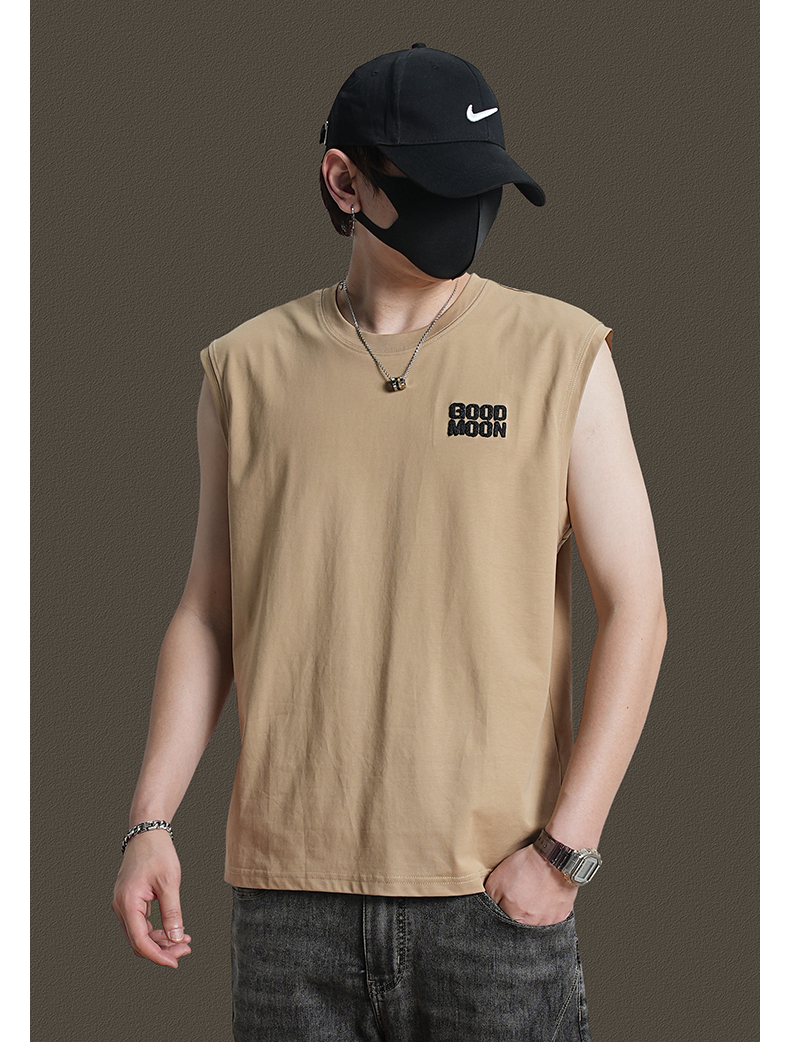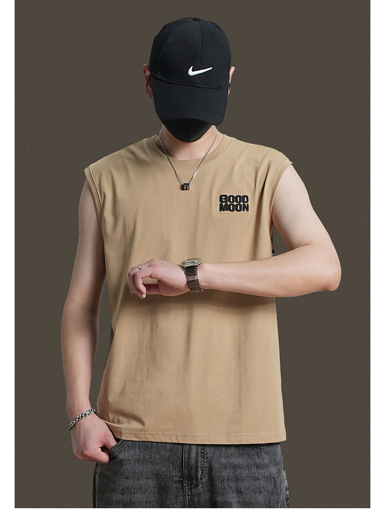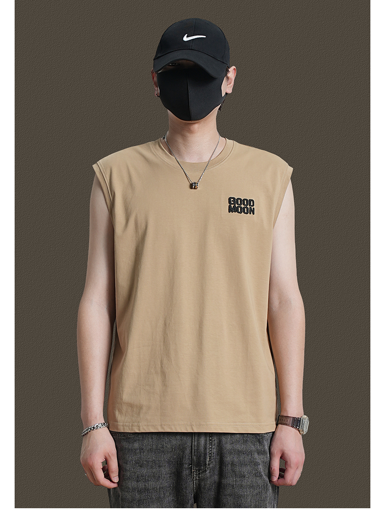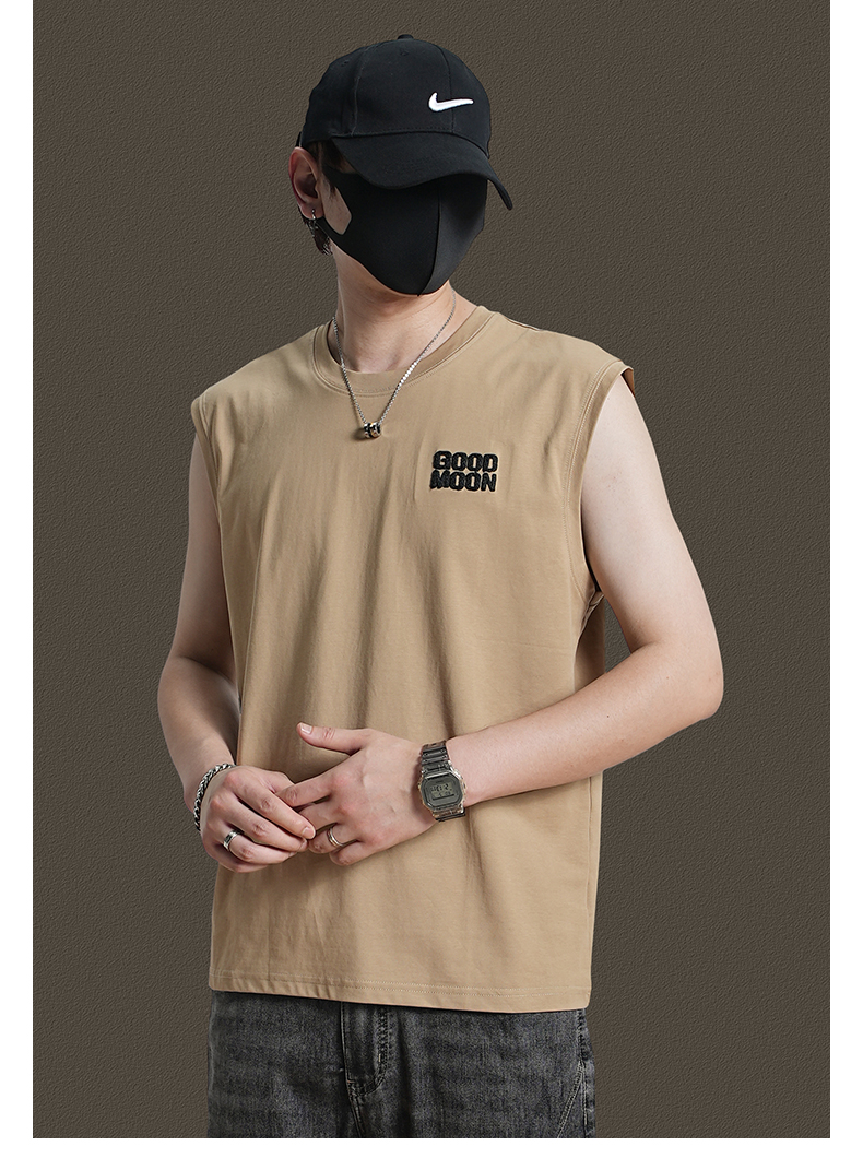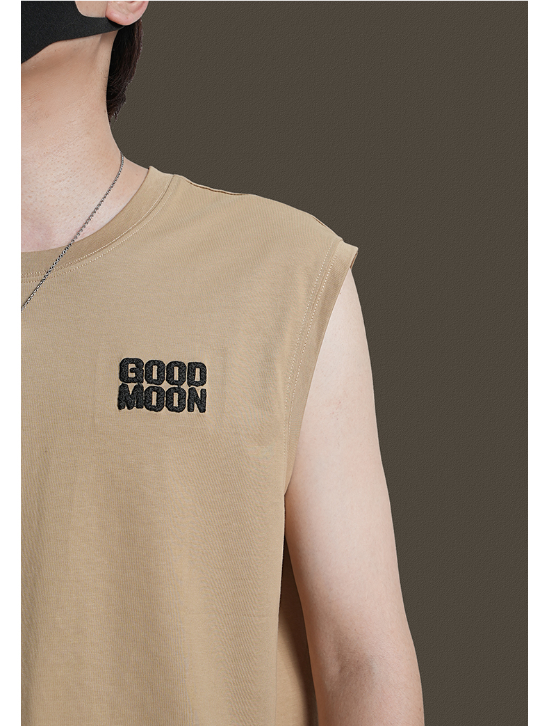 美式重磅純棉背心男士夏季圓領無袖T恤休閒背心刺綉背後月球印花