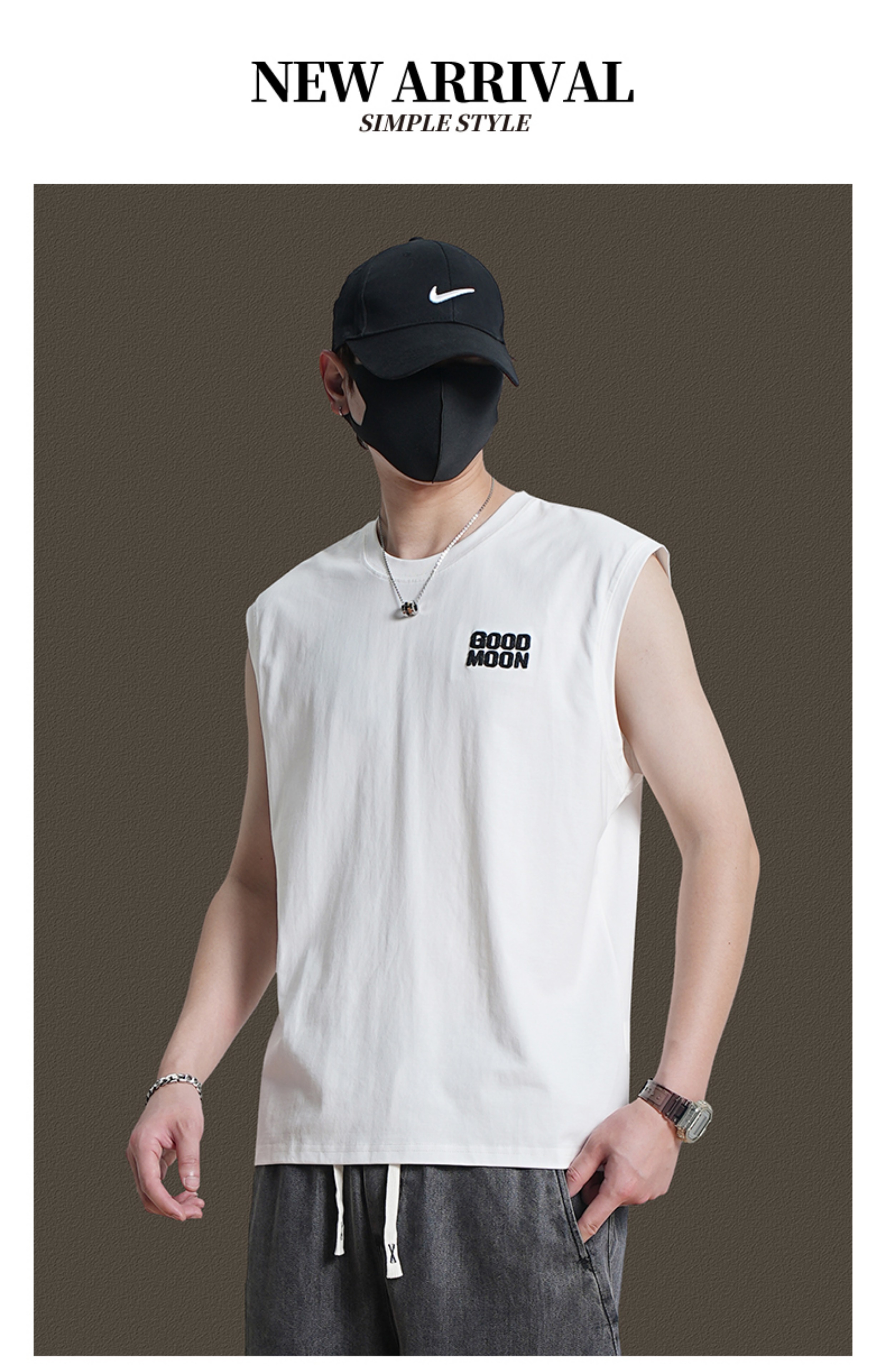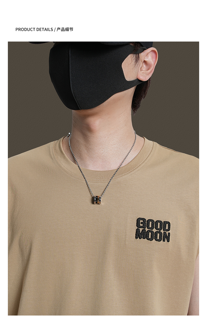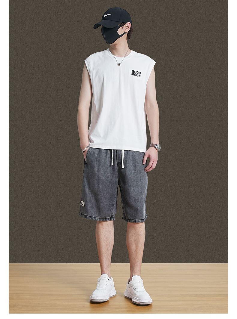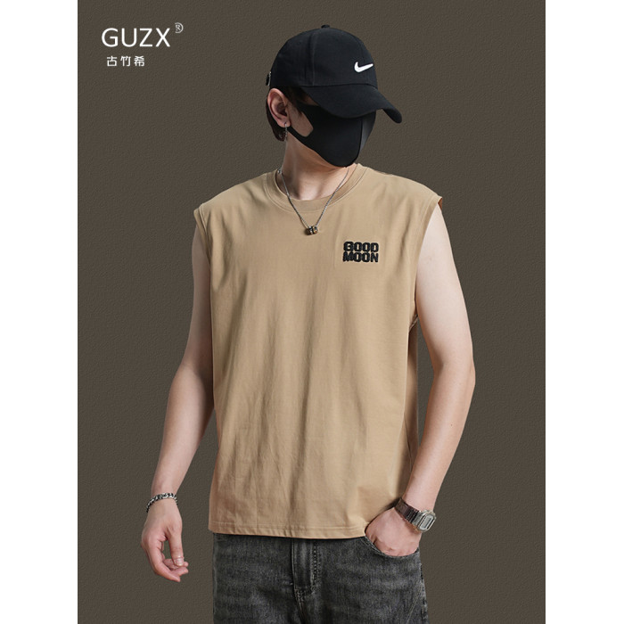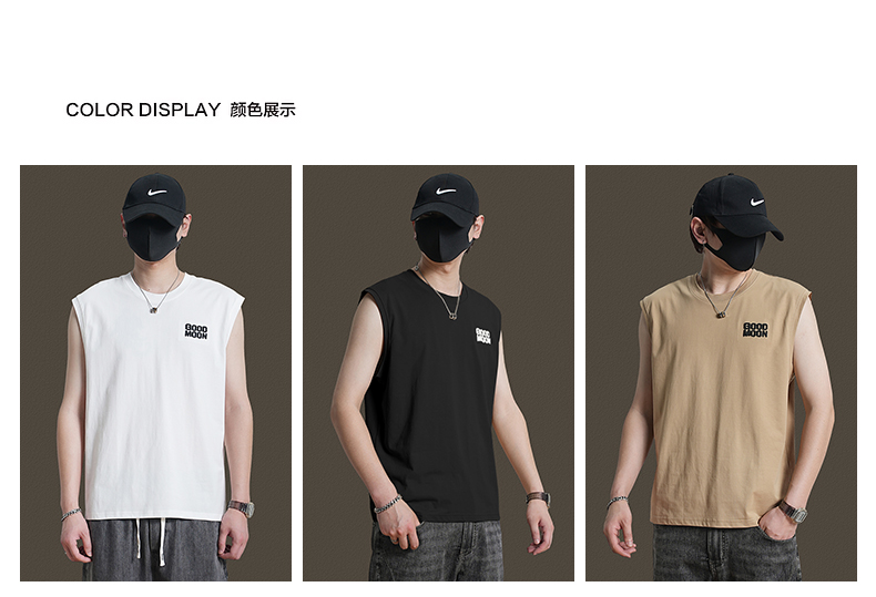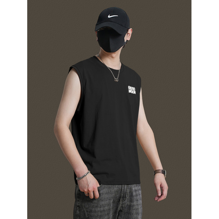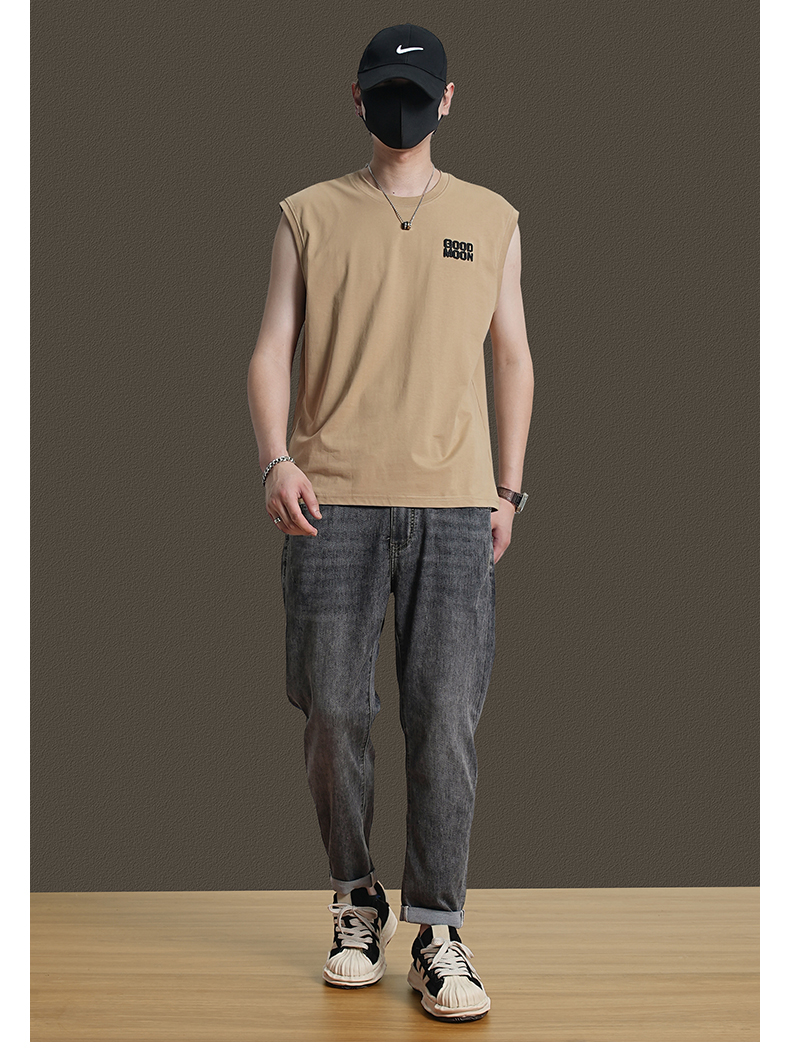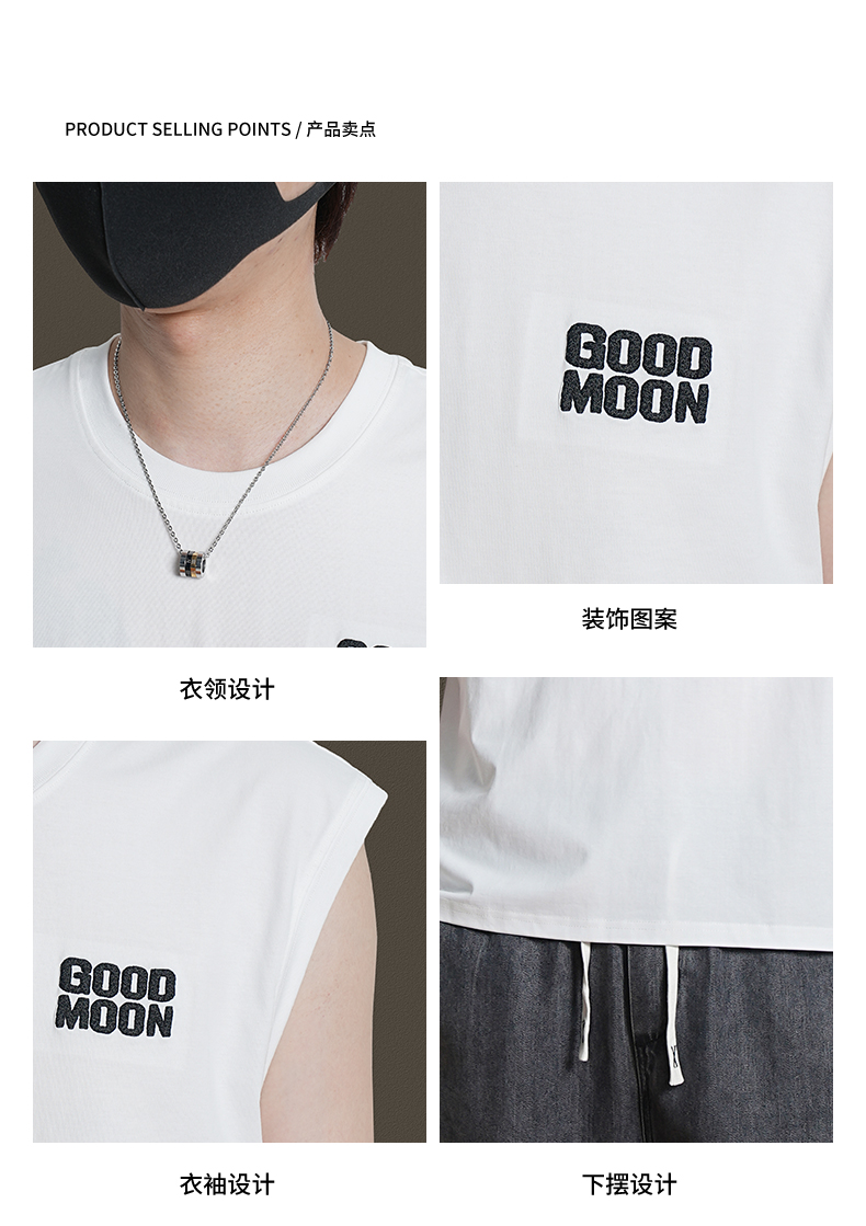 美式重磅純棉背心男士夏季圓領無袖T恤休閒背心刺綉背後月球印花