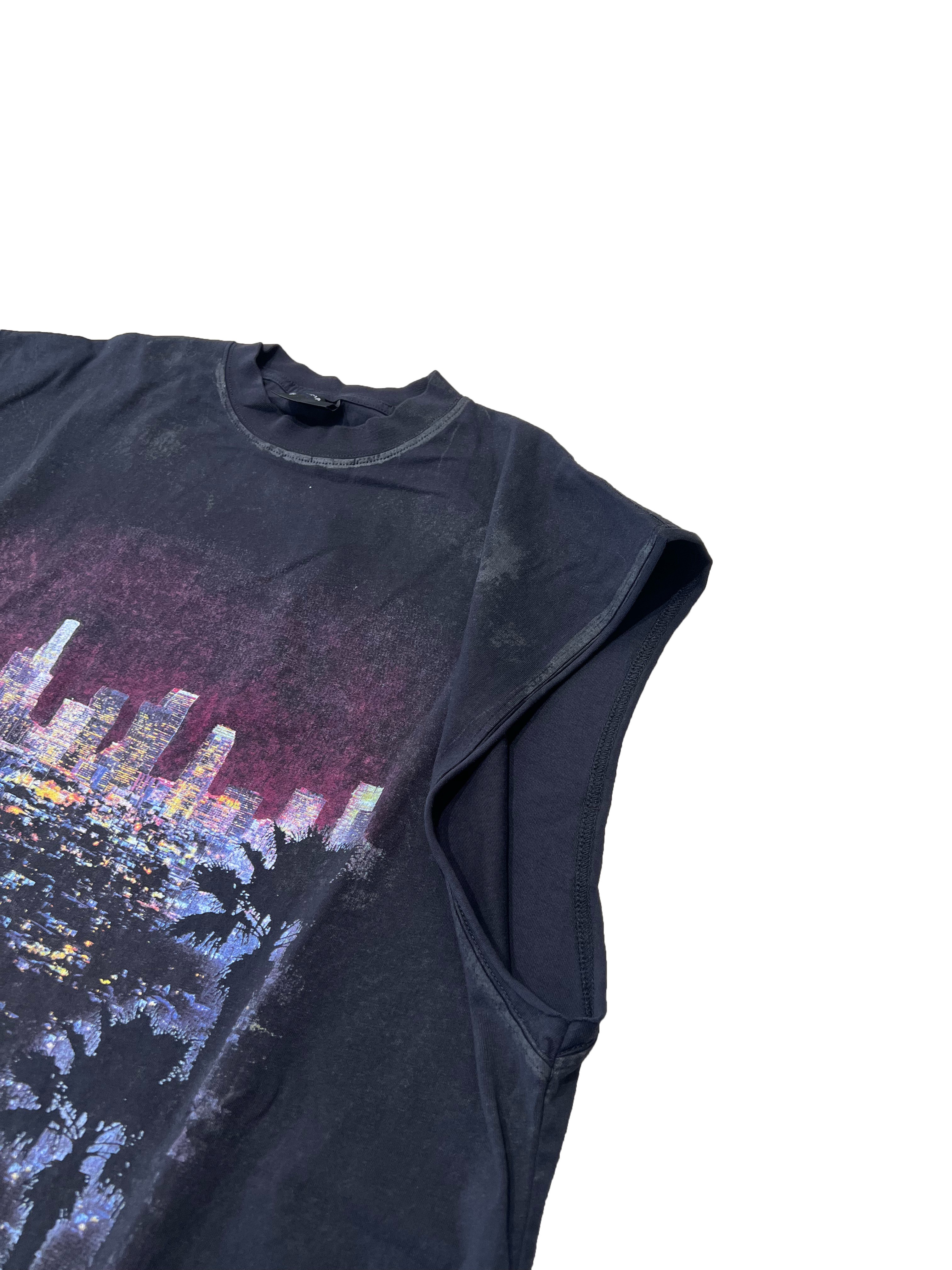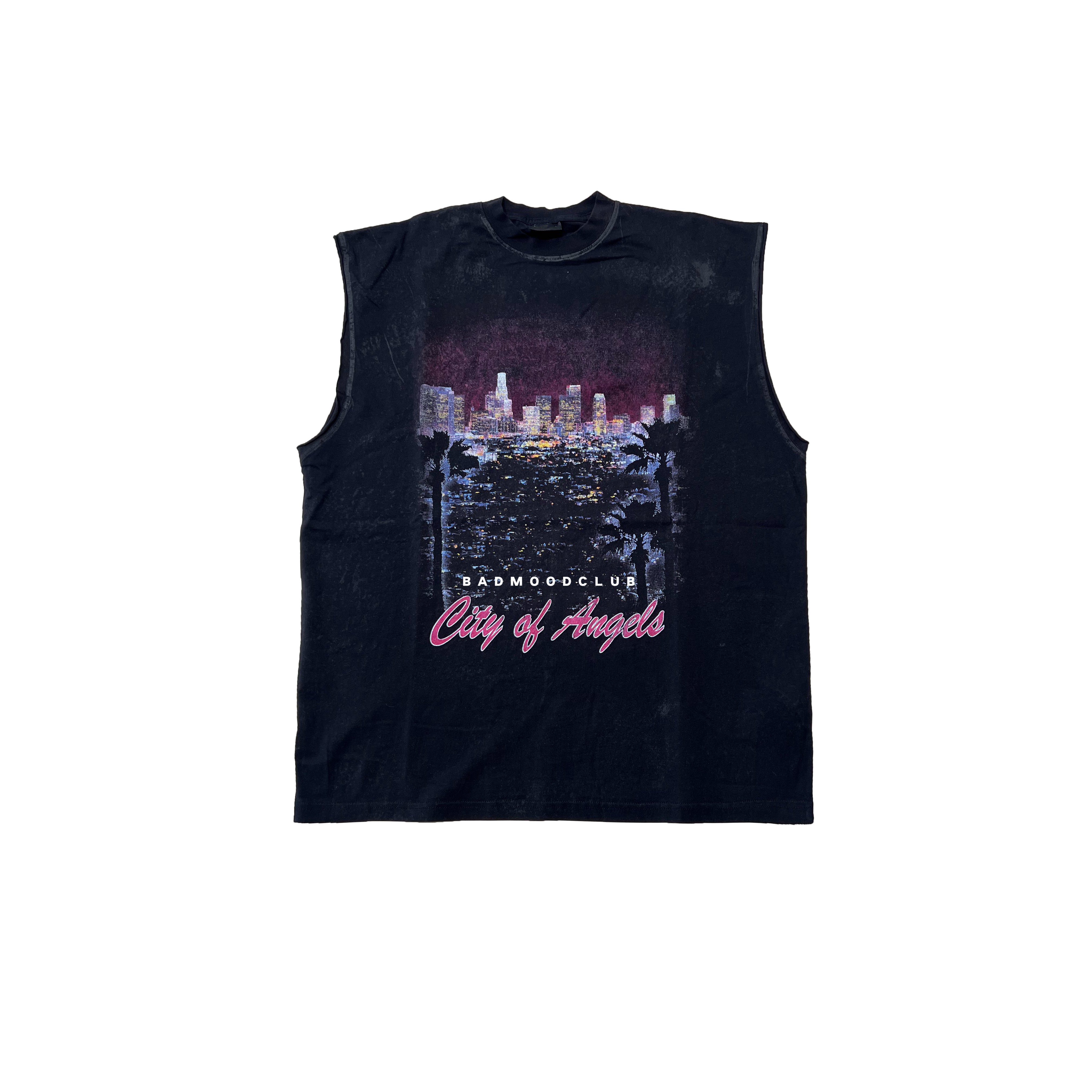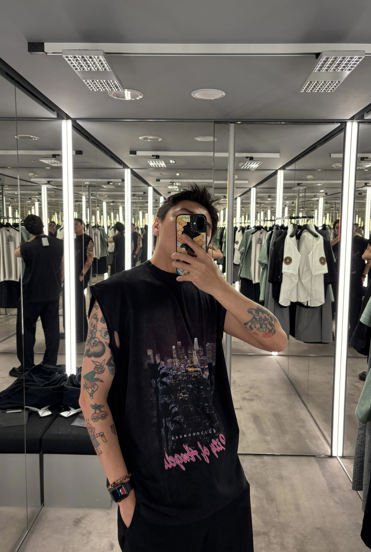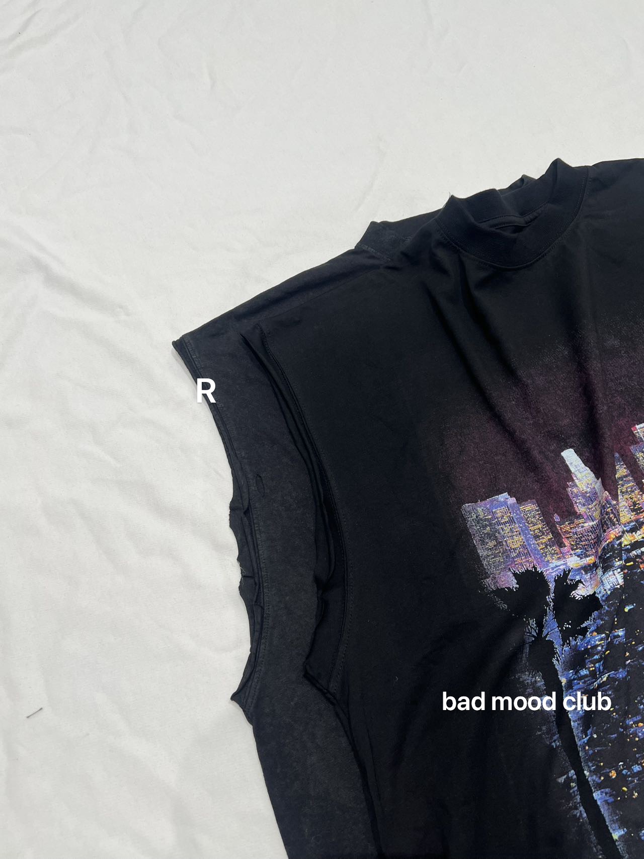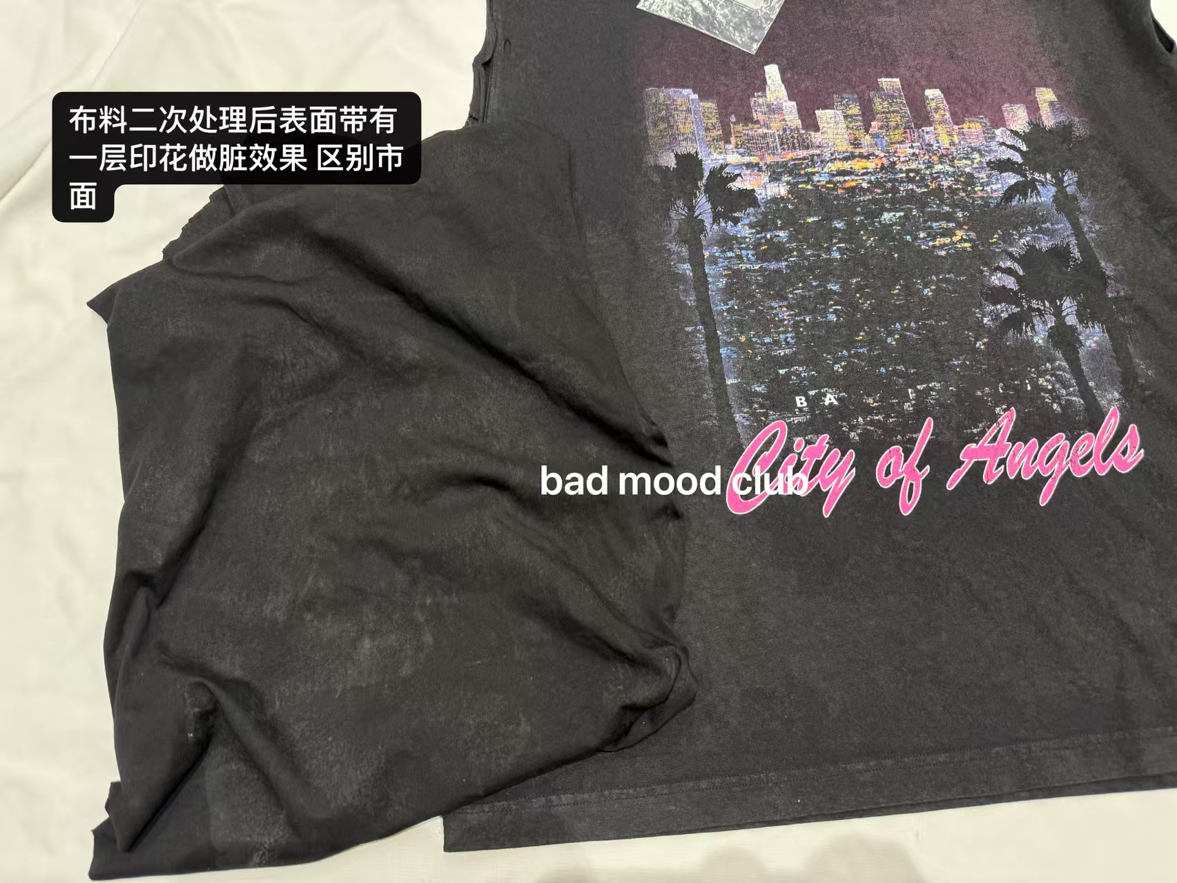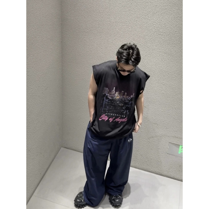 BMC天使之城洛杉磯夜景印花背心做舊泥染破壞寬松廓形無袖短袖T恤