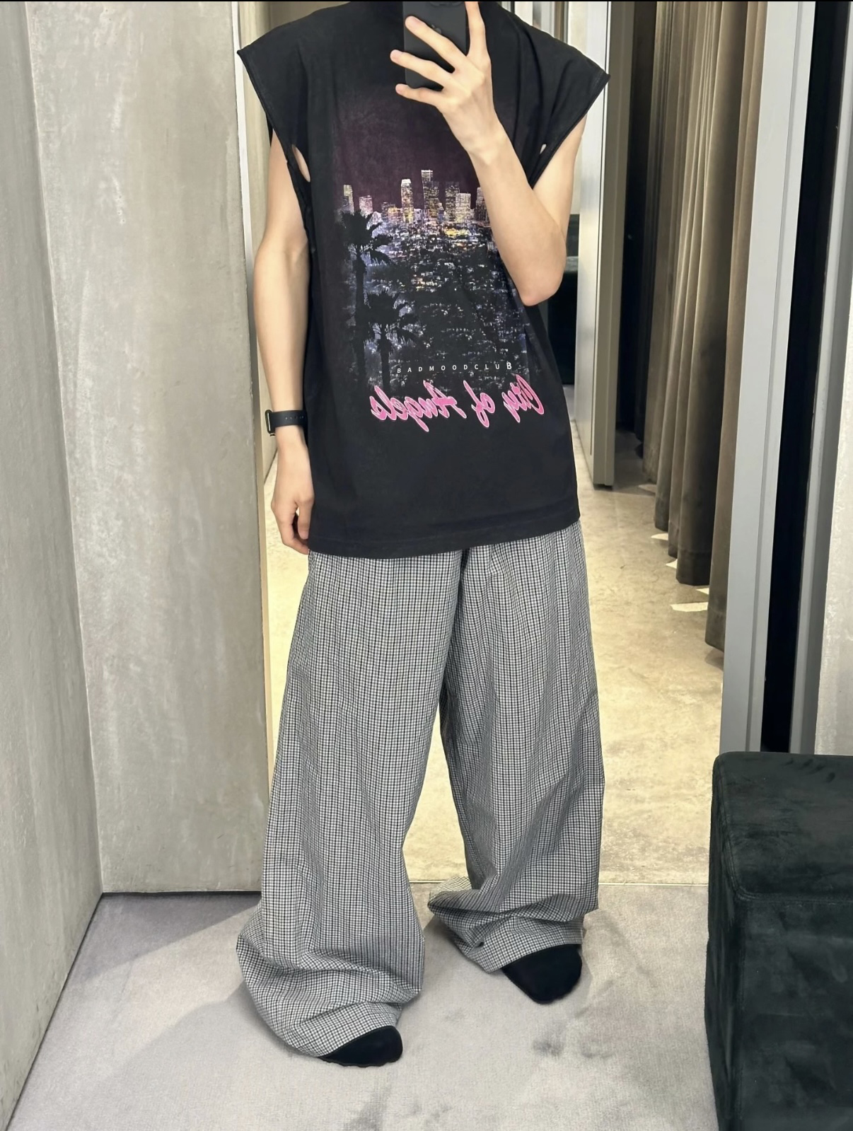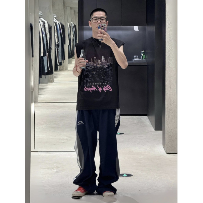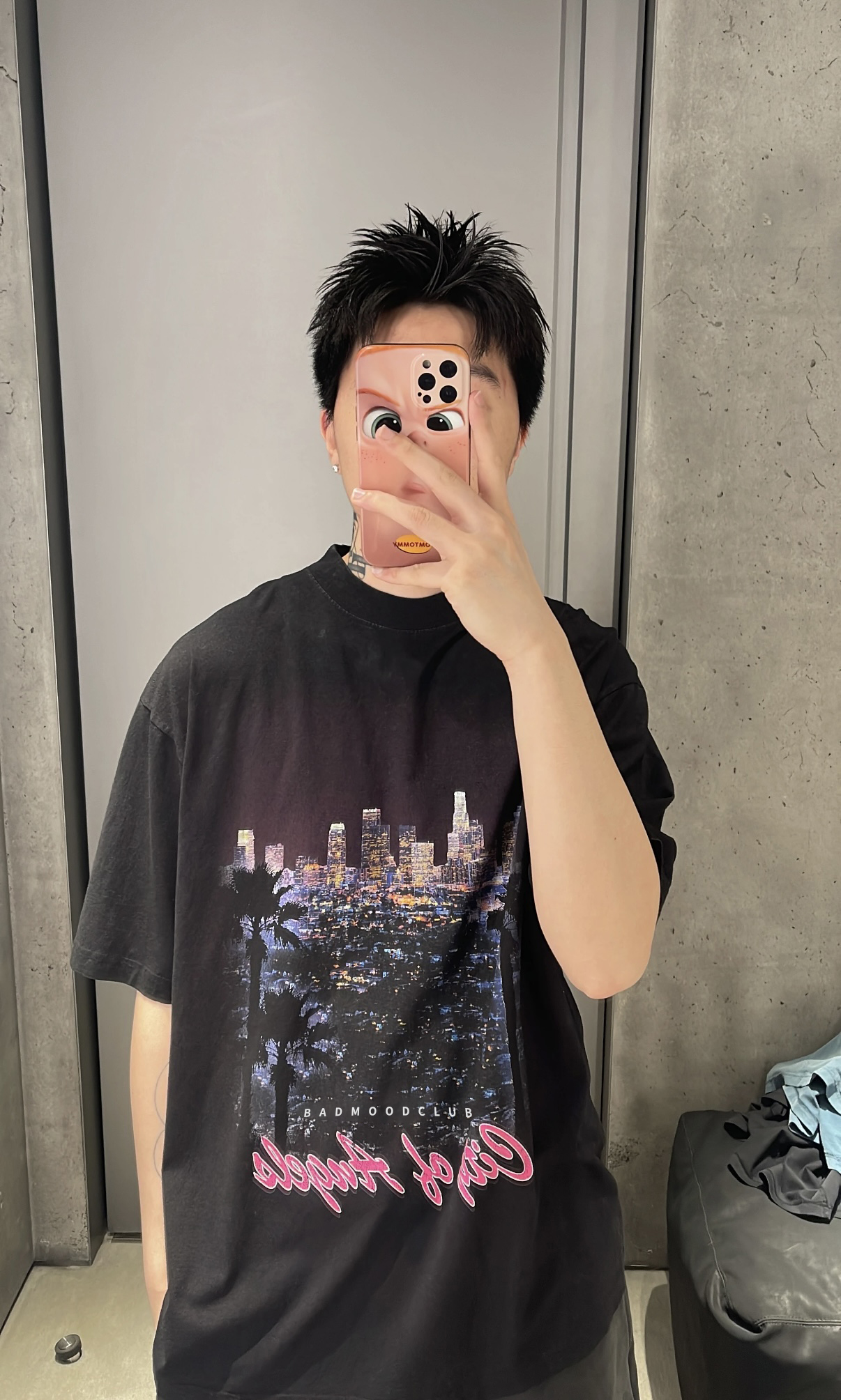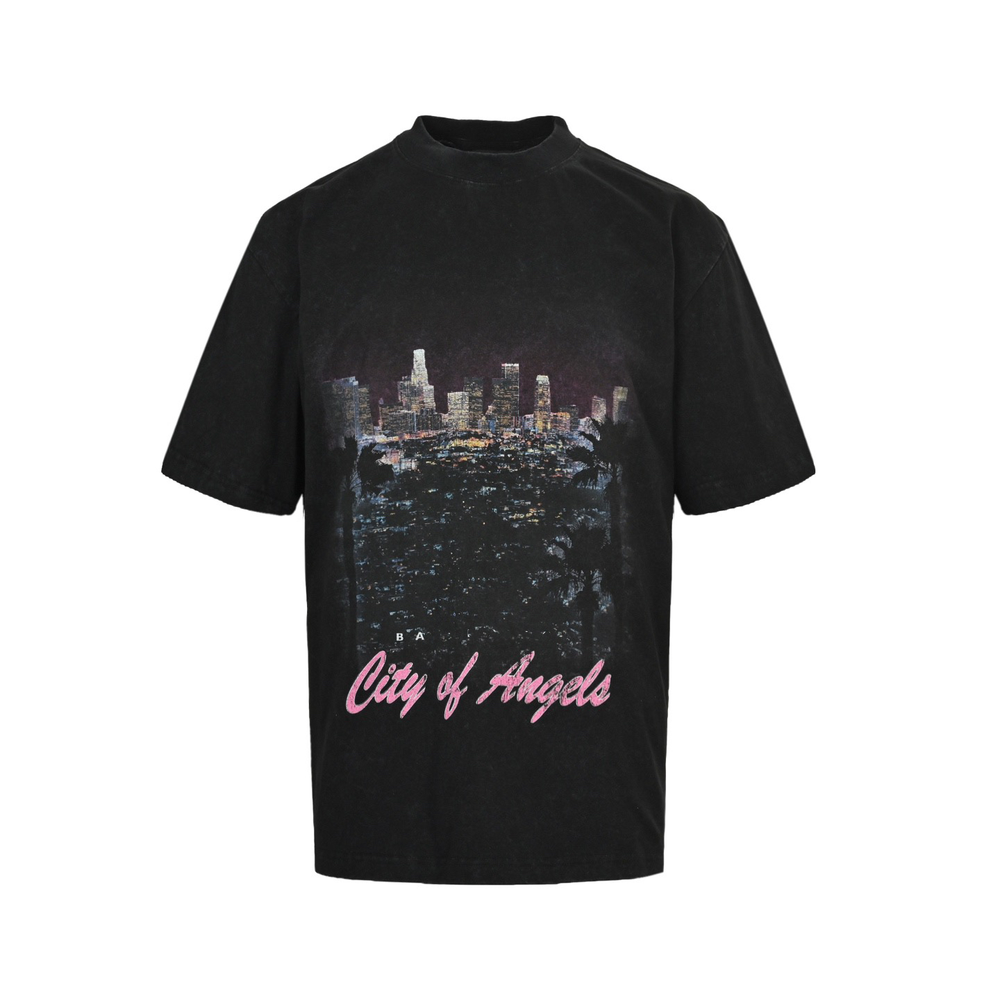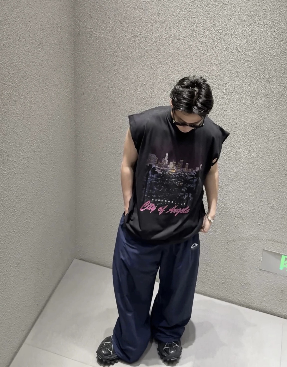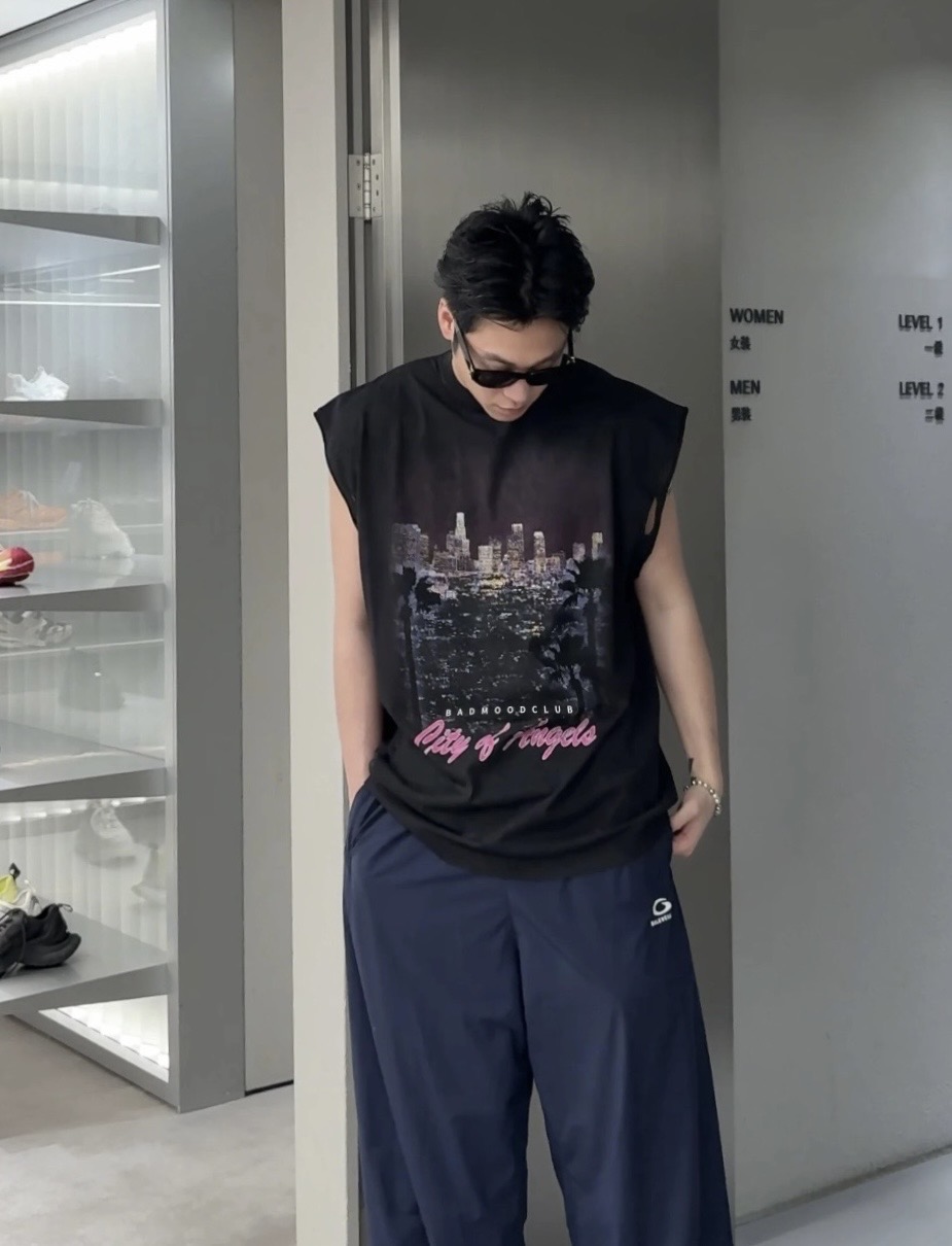 BMC天使之城洛杉磯夜景印花背心做舊泥染破壞寬松廓形無袖短袖T恤