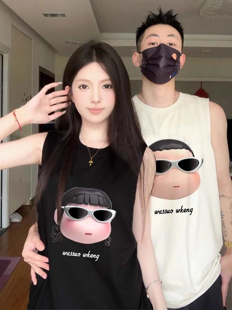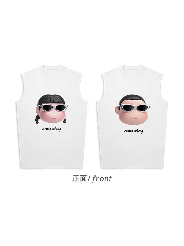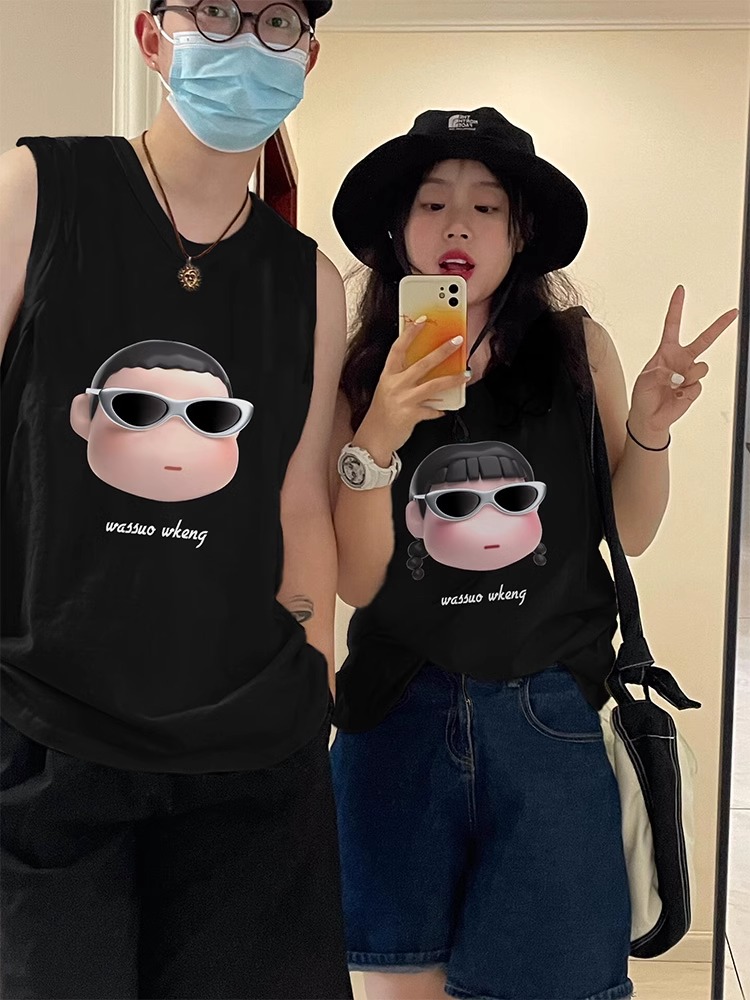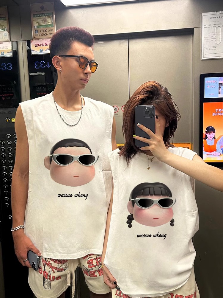 純棉情侶裝無袖背心夏季坎肩男女disoo高級感趣味大頭印花T恤兩件