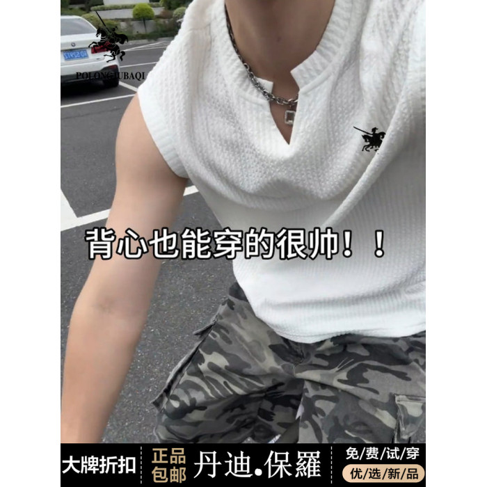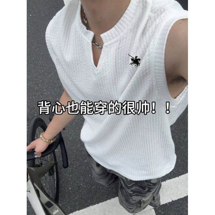 保羅刺綉背心男款夏季寬松肌理感褶皺V領無袖t恤運動汗衫坎肩上衣
