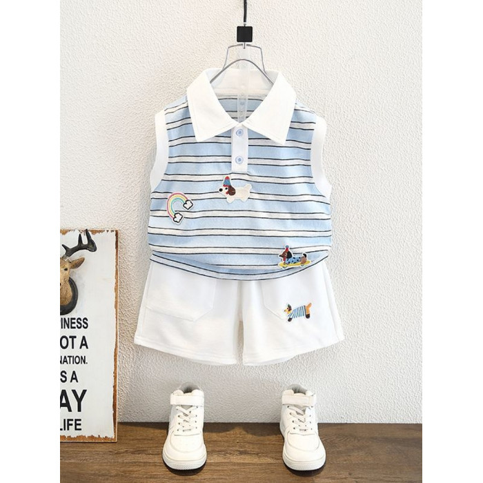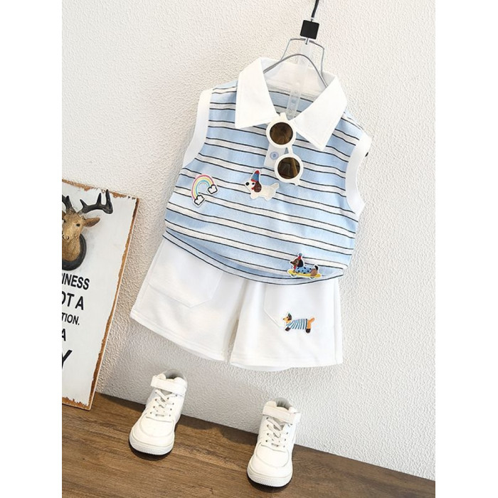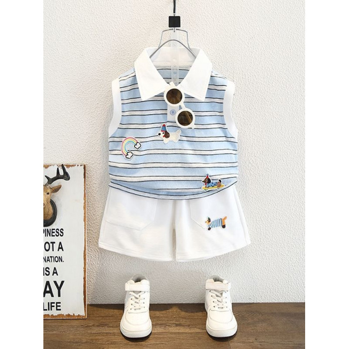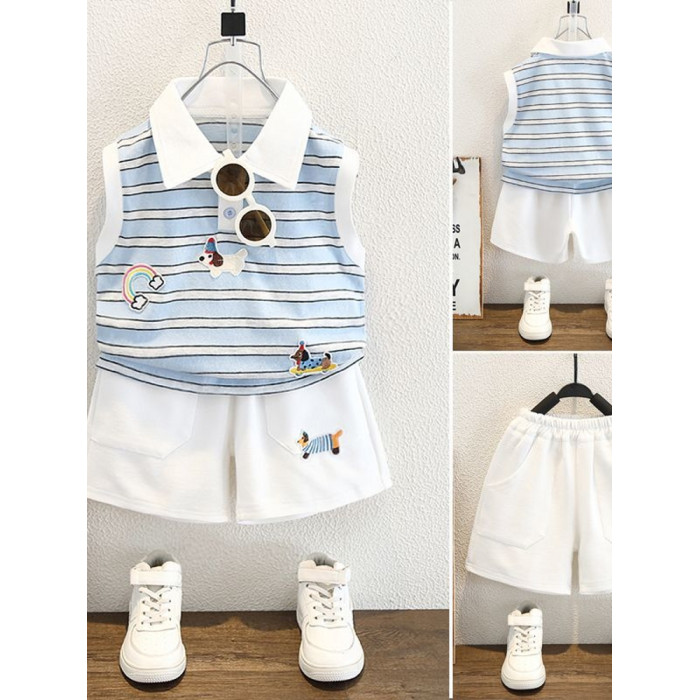 安哼安哼男童2025夏裝夏季短褲新款兒童卡通條紋背心無袖套裝短款
