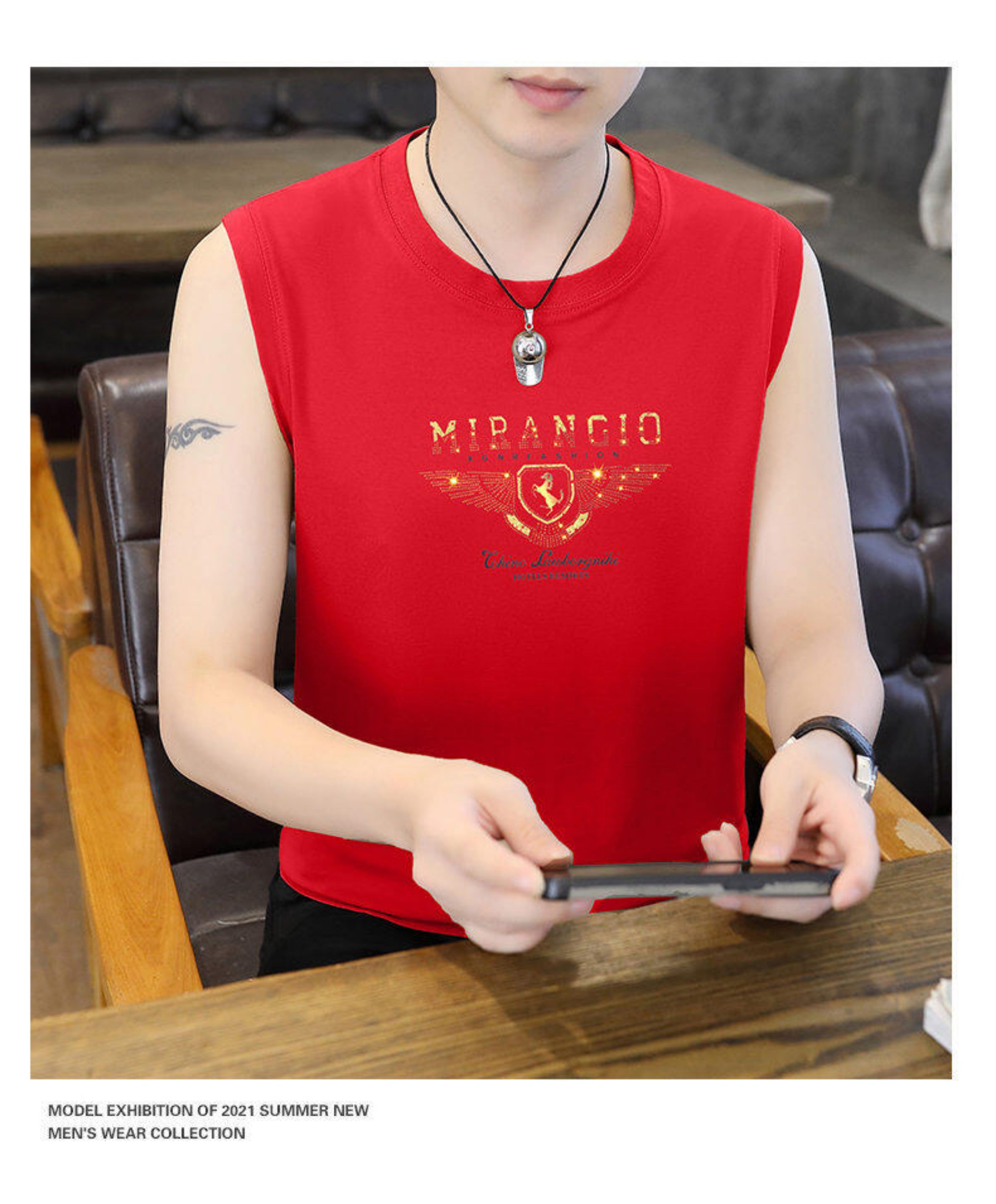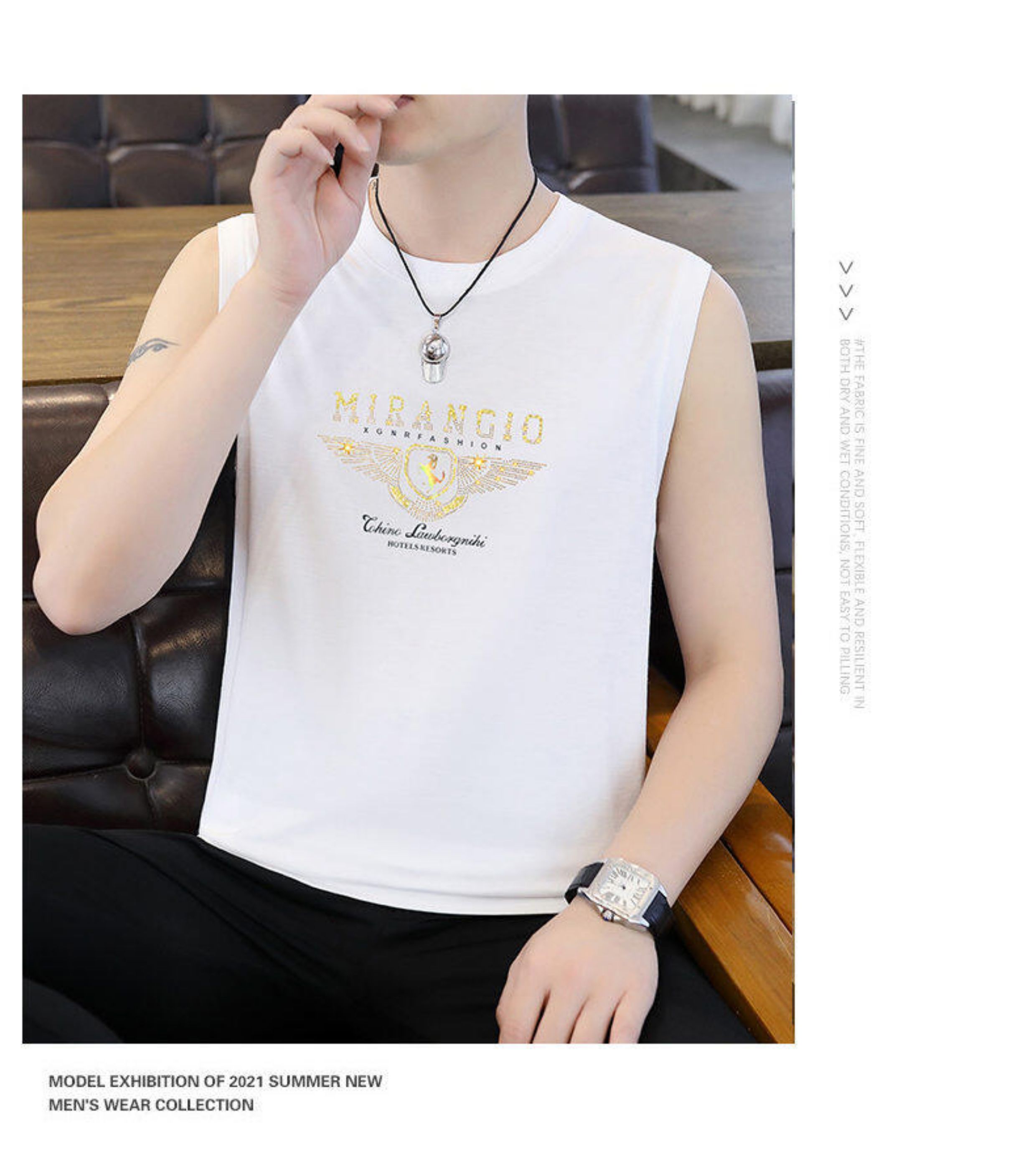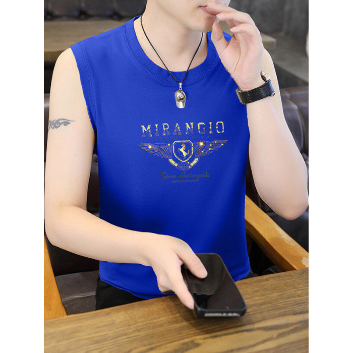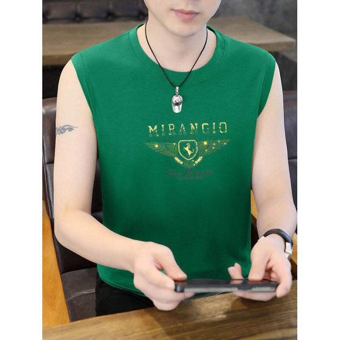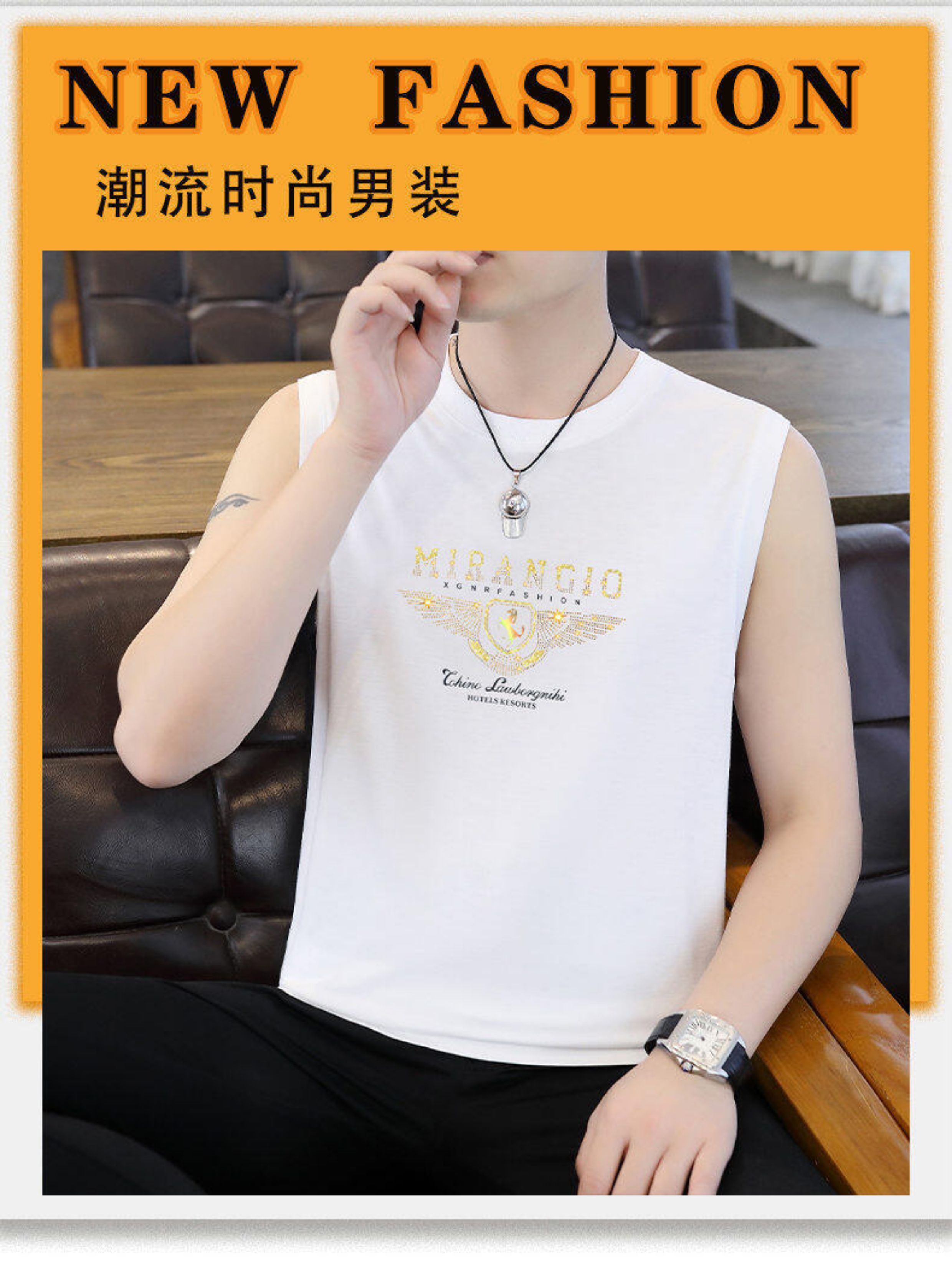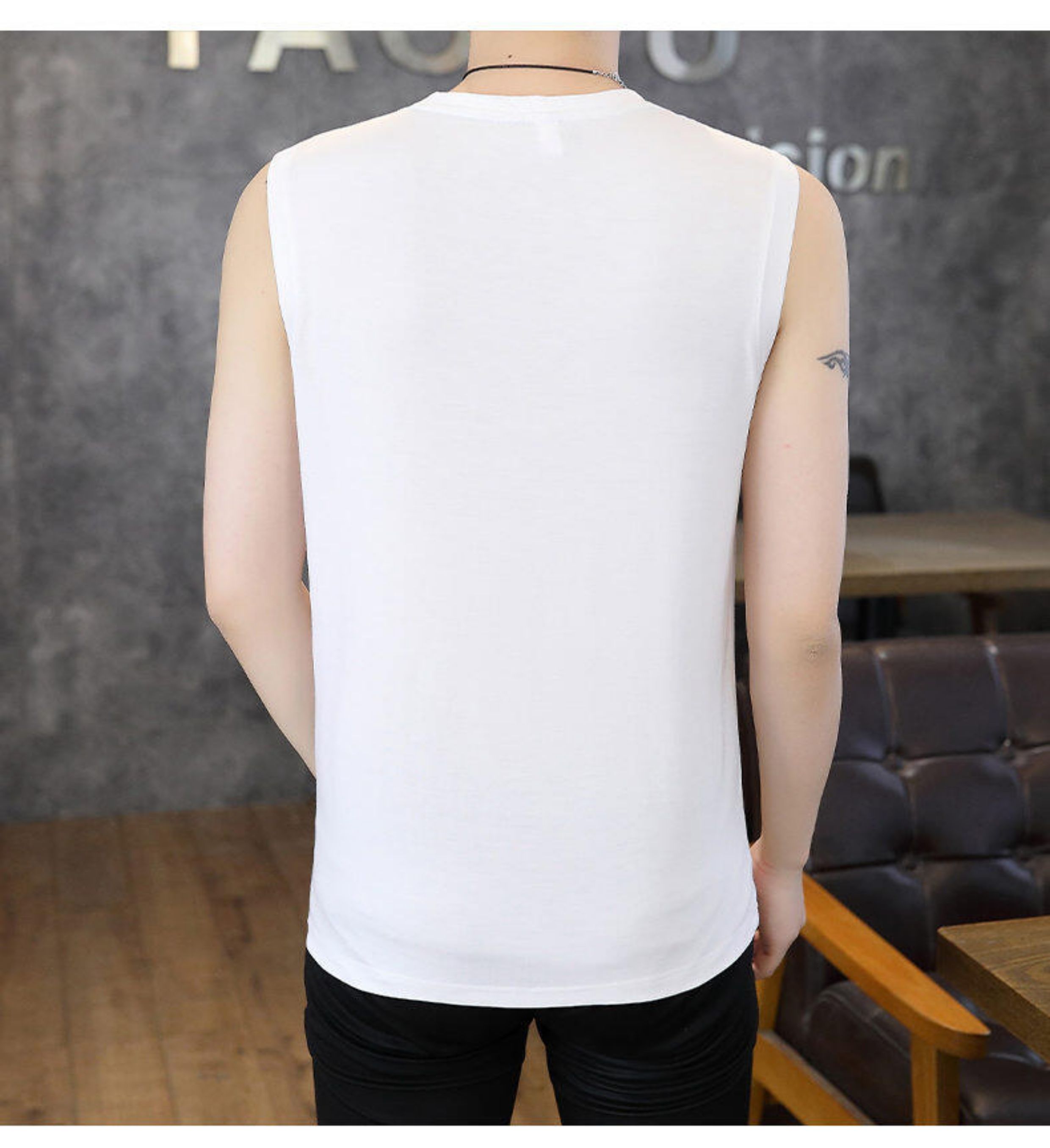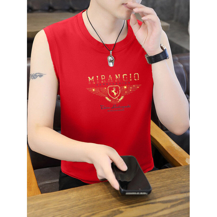 圓領絲光棉燙金透氣背心男夏季潮流白色無袖t恤男款夏裝冰絲坎肩