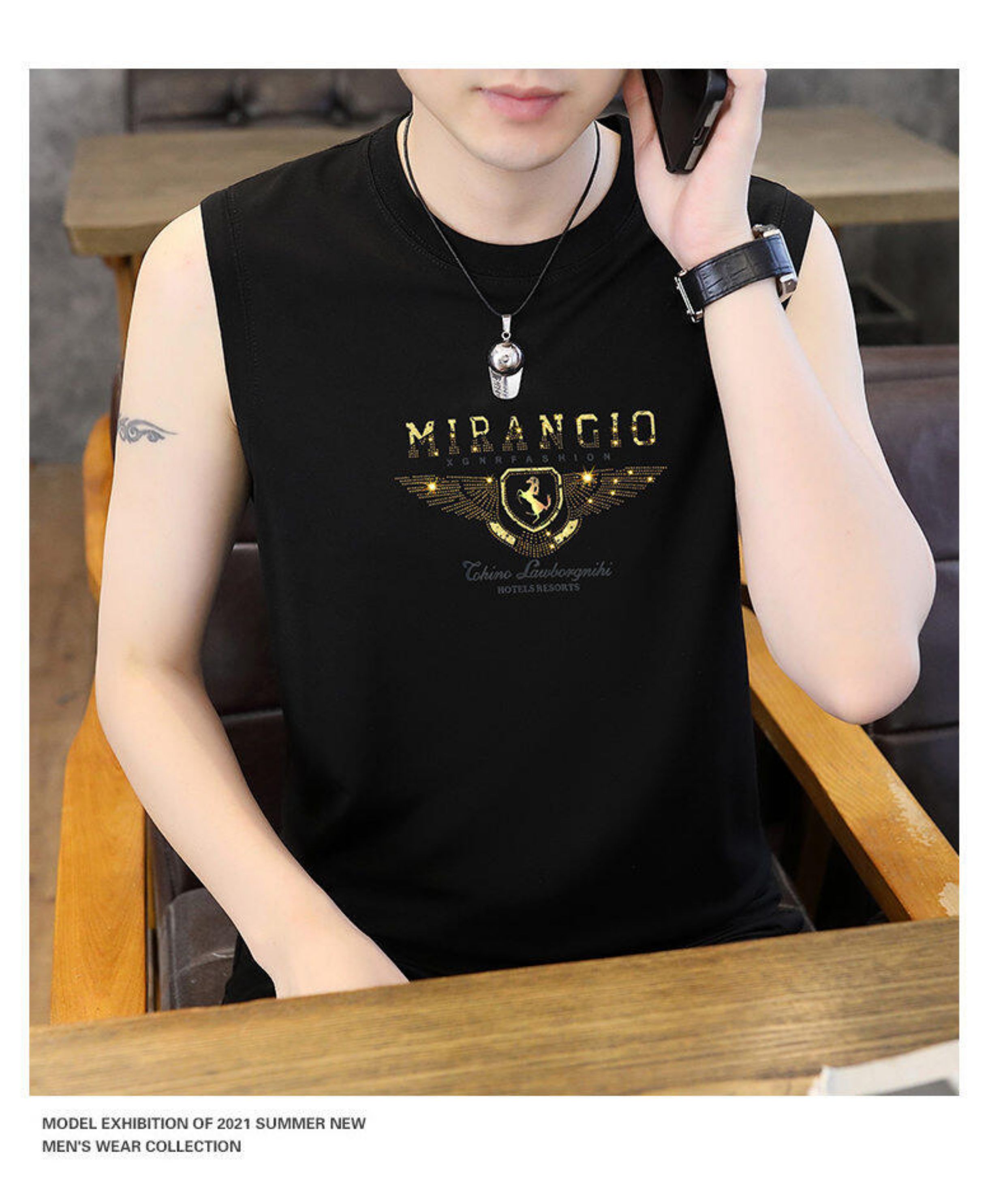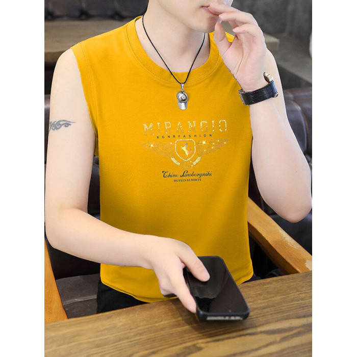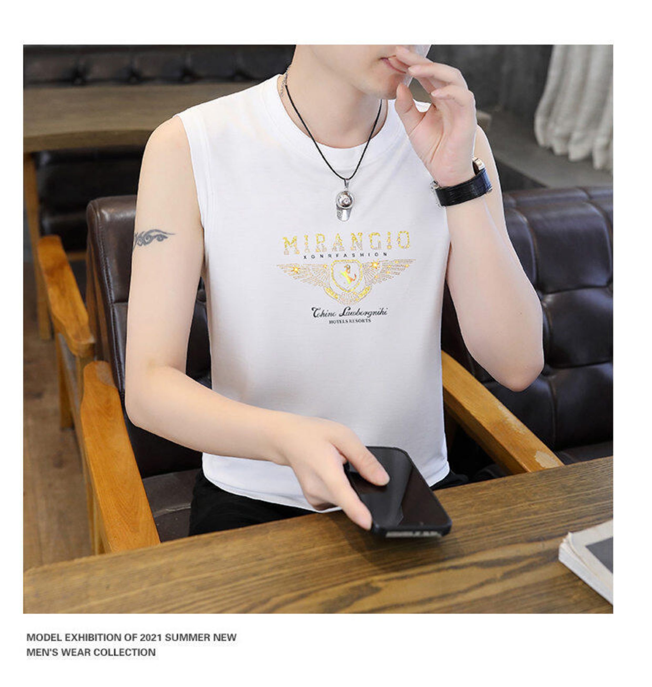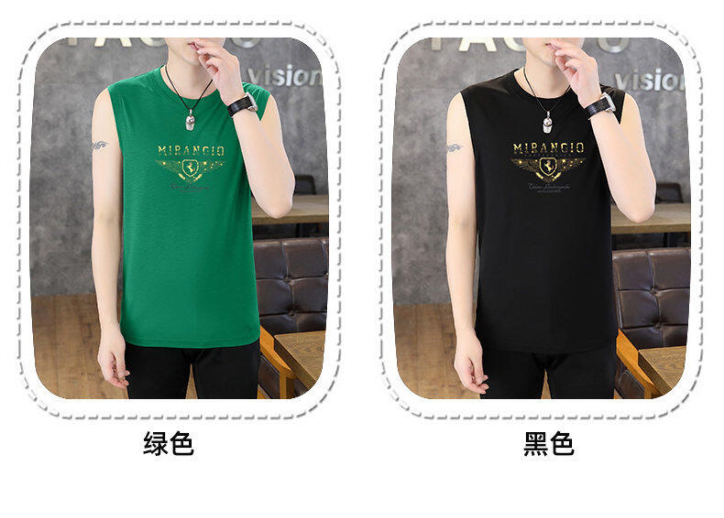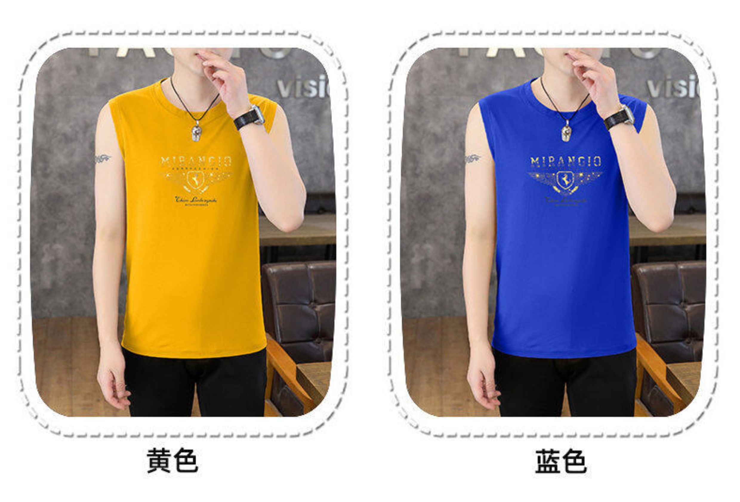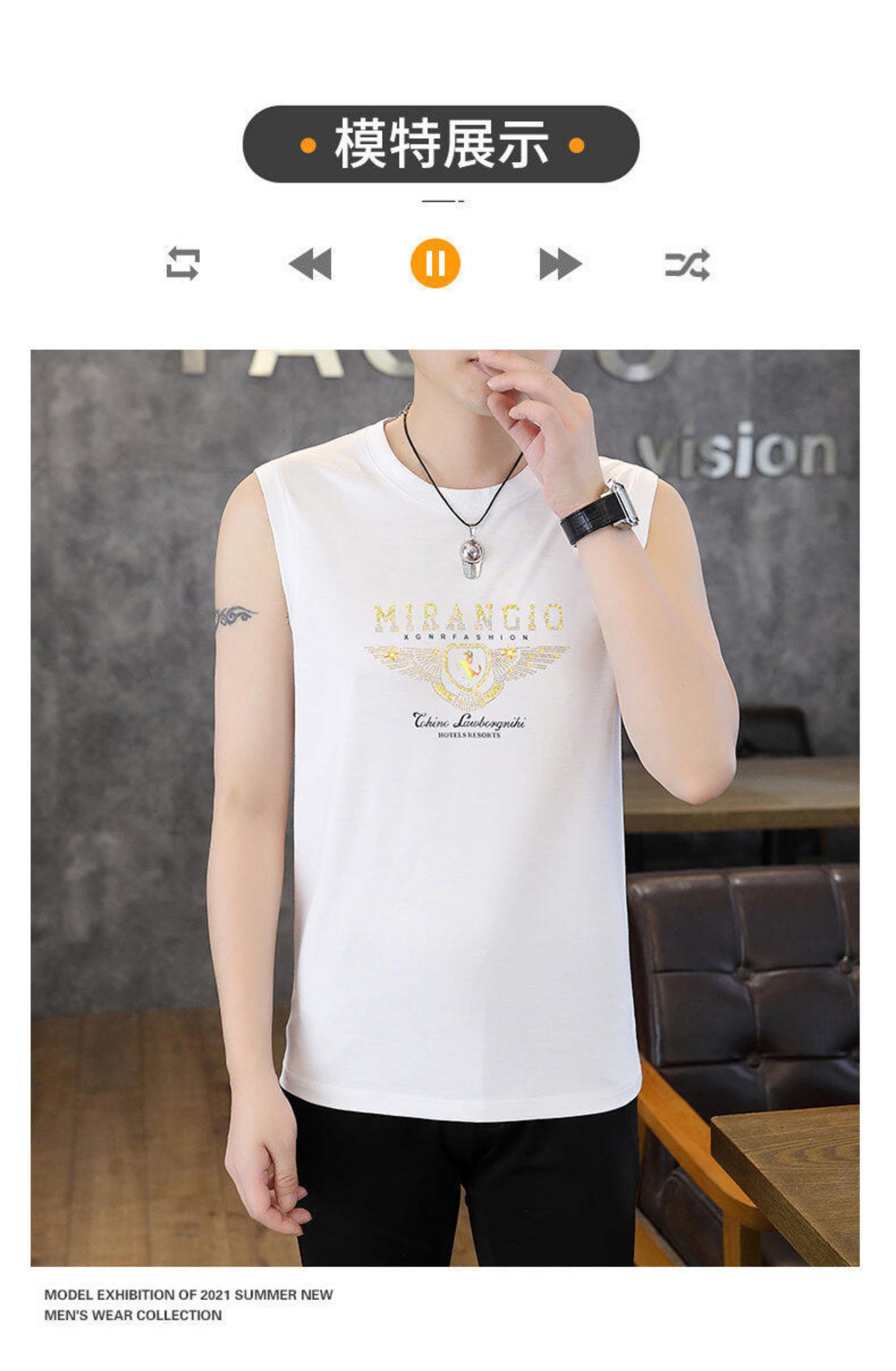 圓領絲光棉燙金透氣背心男夏季潮流白色無袖t恤男款夏裝冰絲坎肩