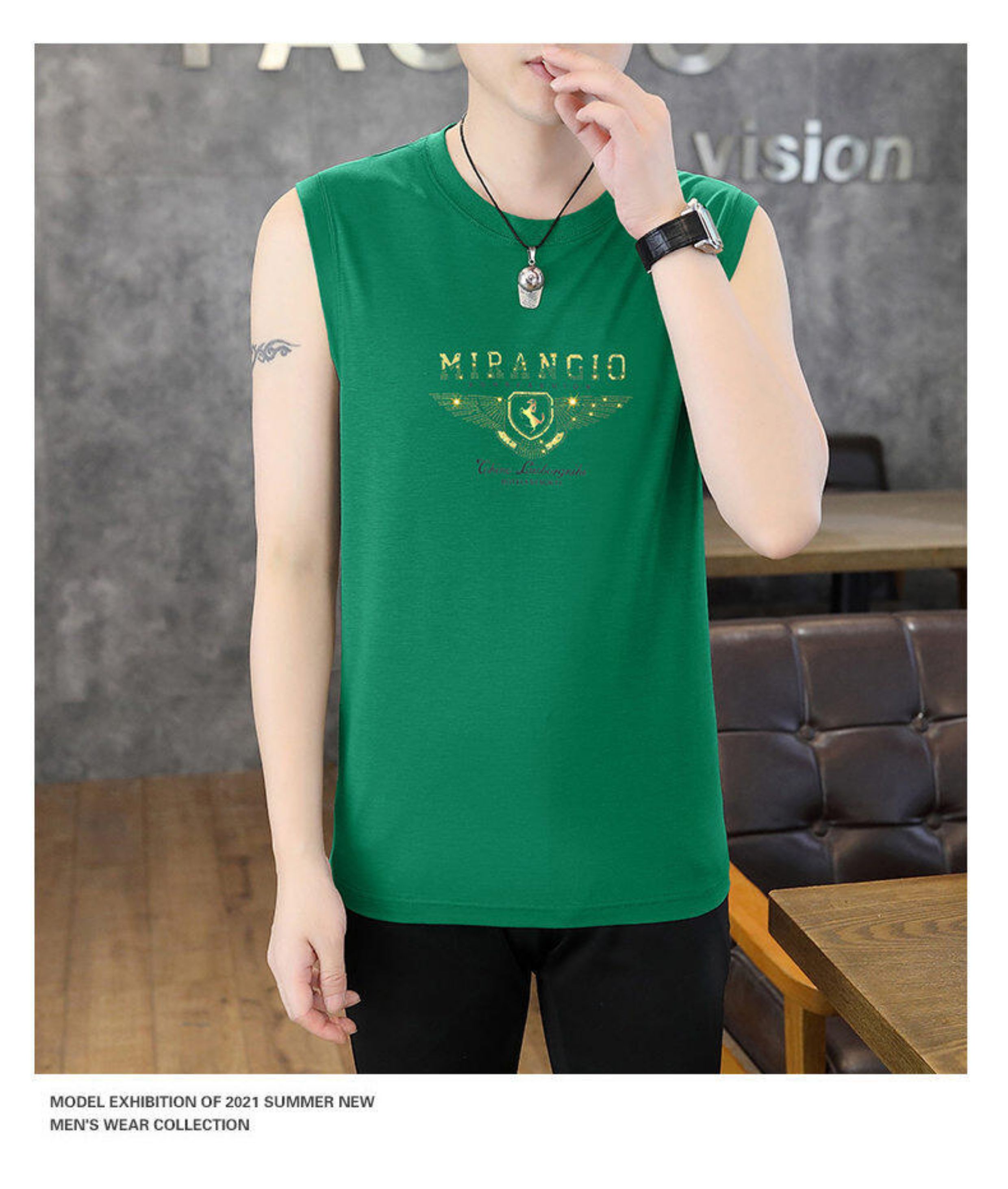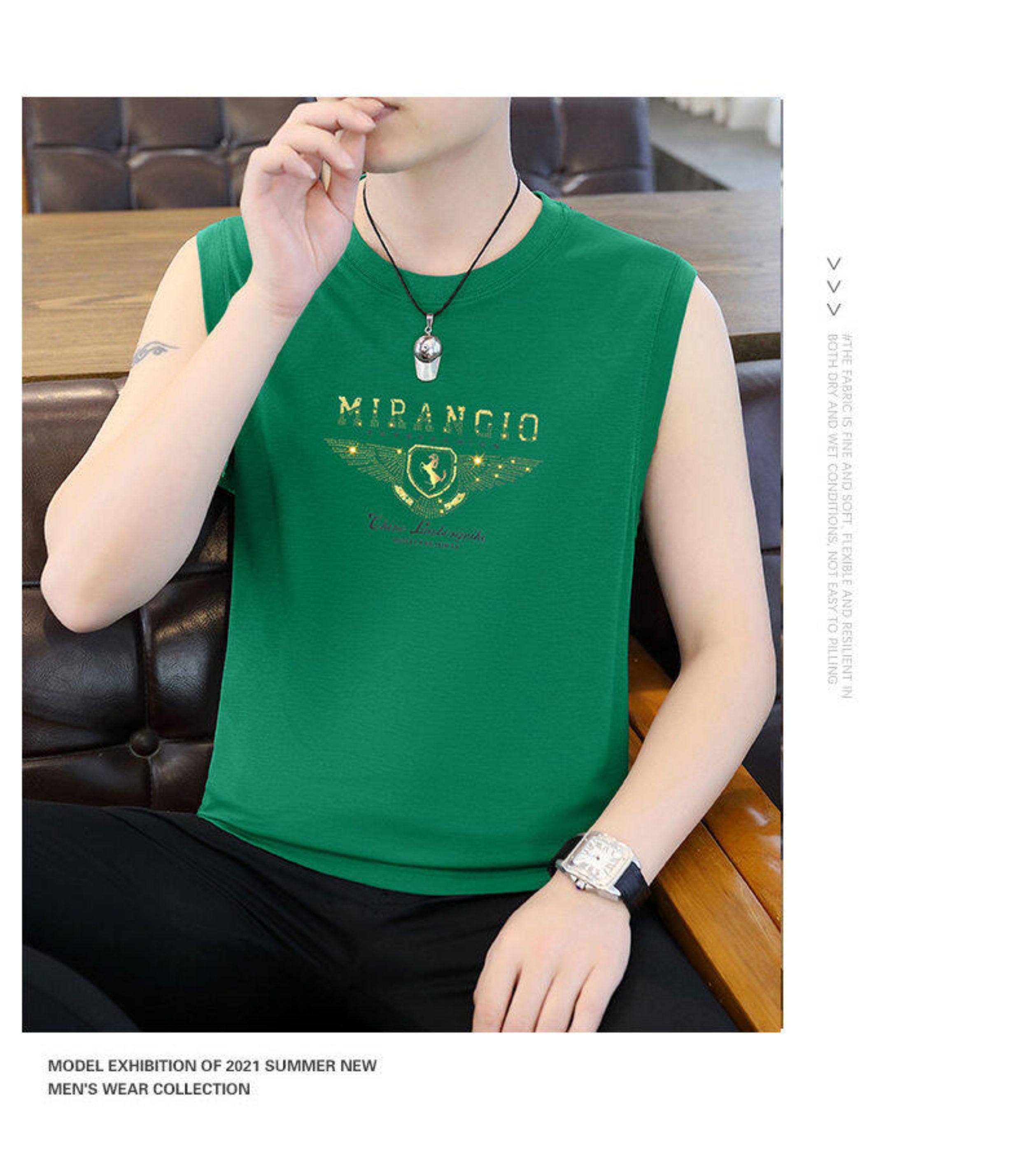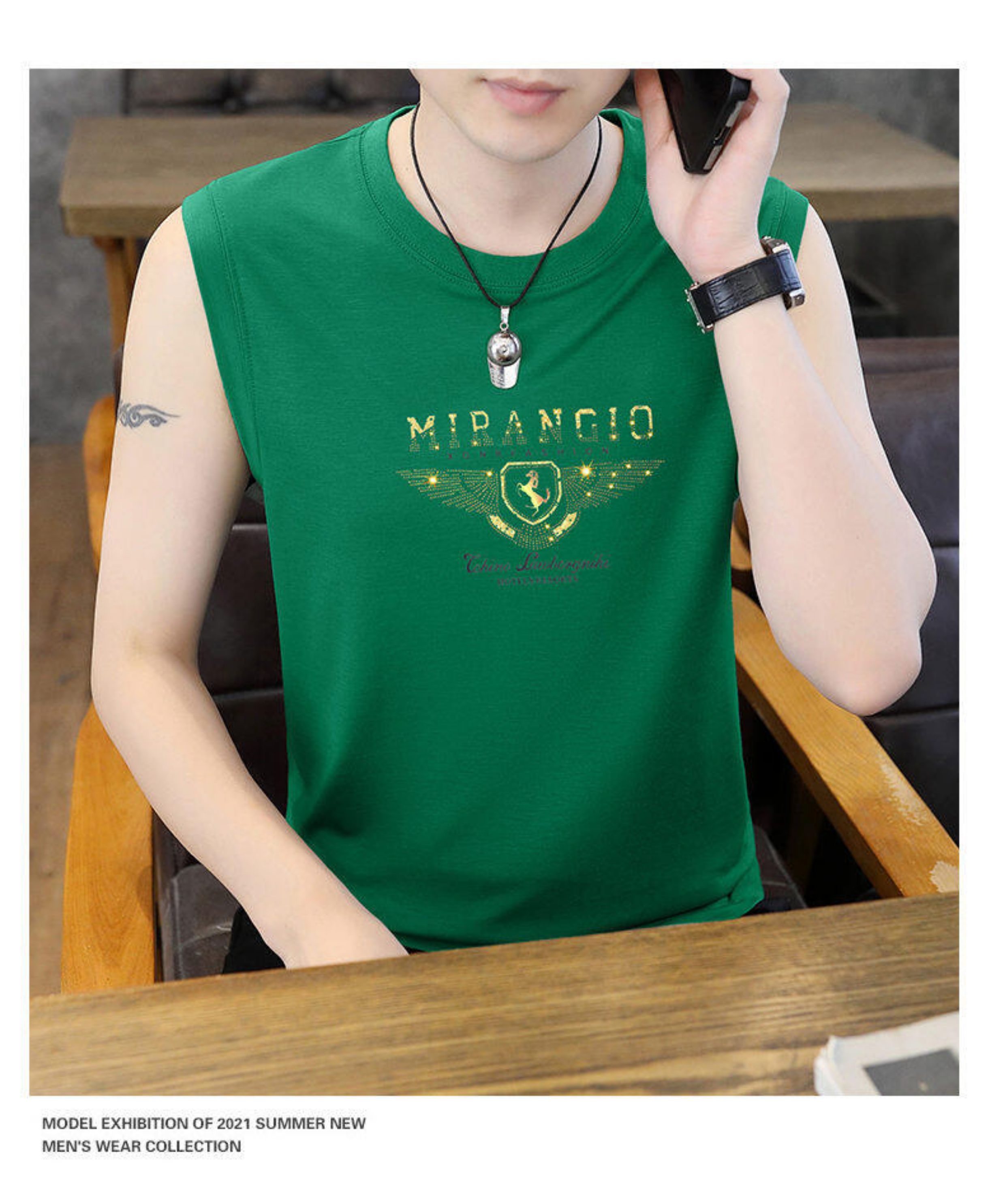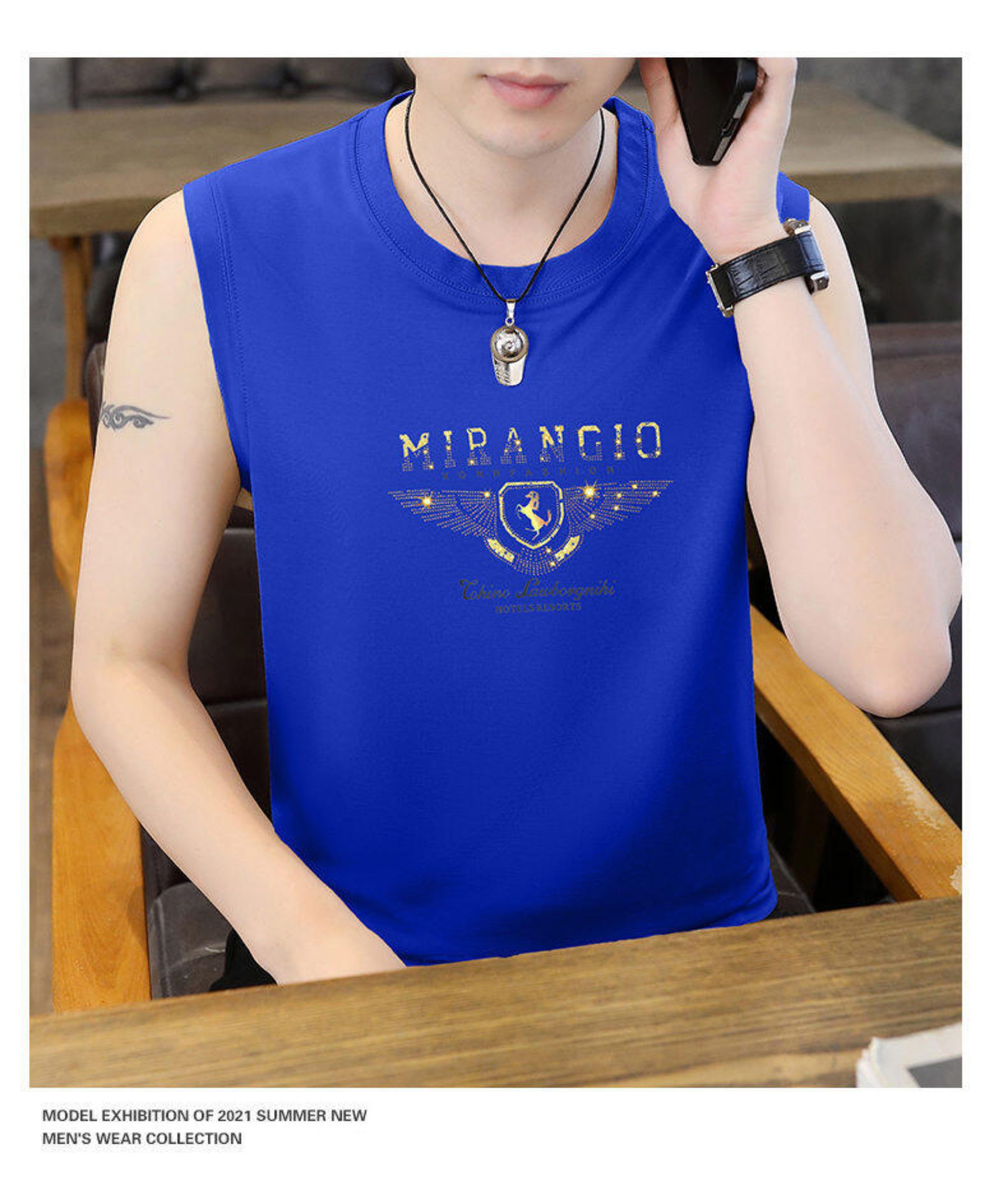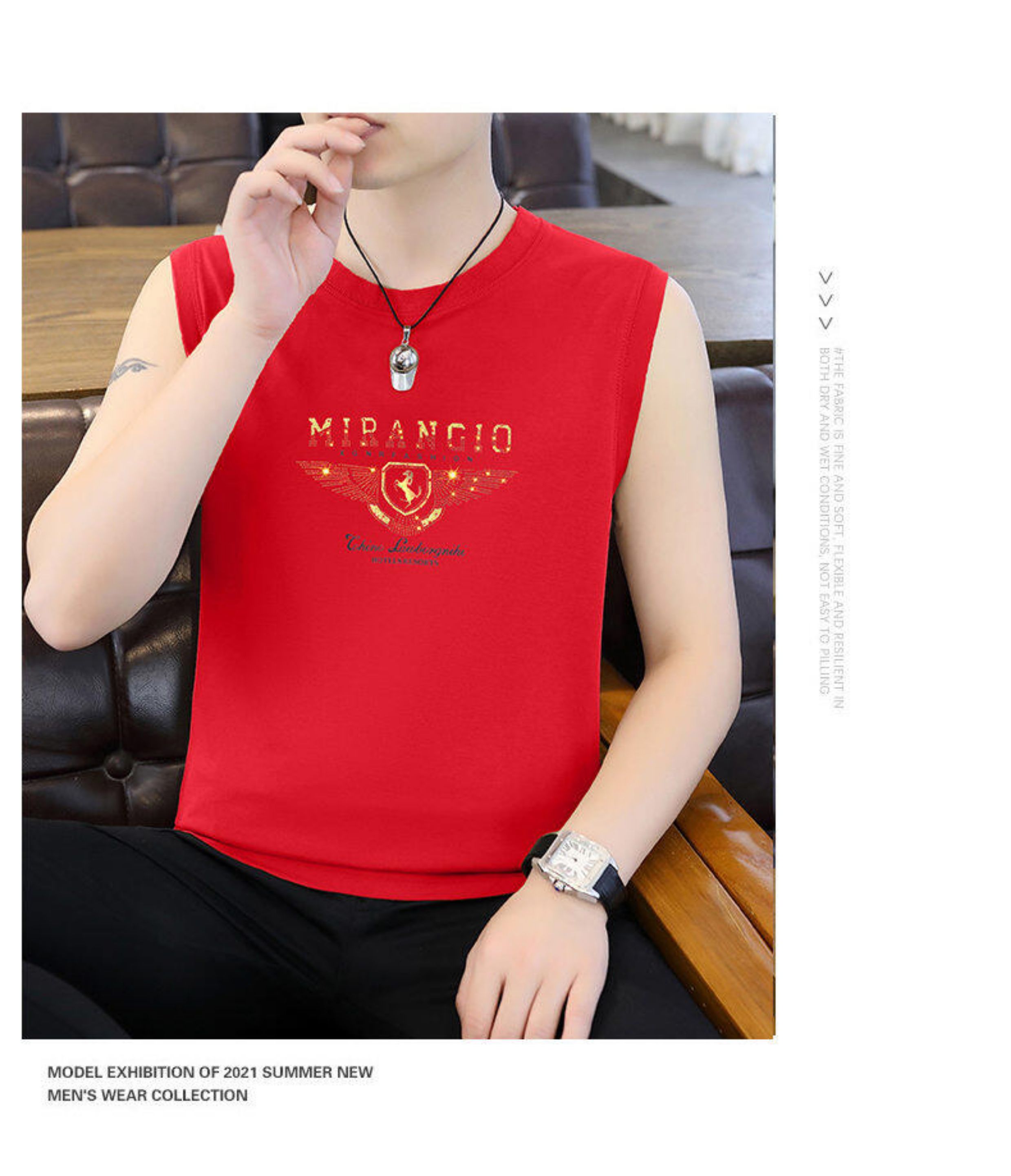 圓領絲光棉燙金透氣背心男夏季潮流白色無袖t恤男款夏裝冰絲坎肩