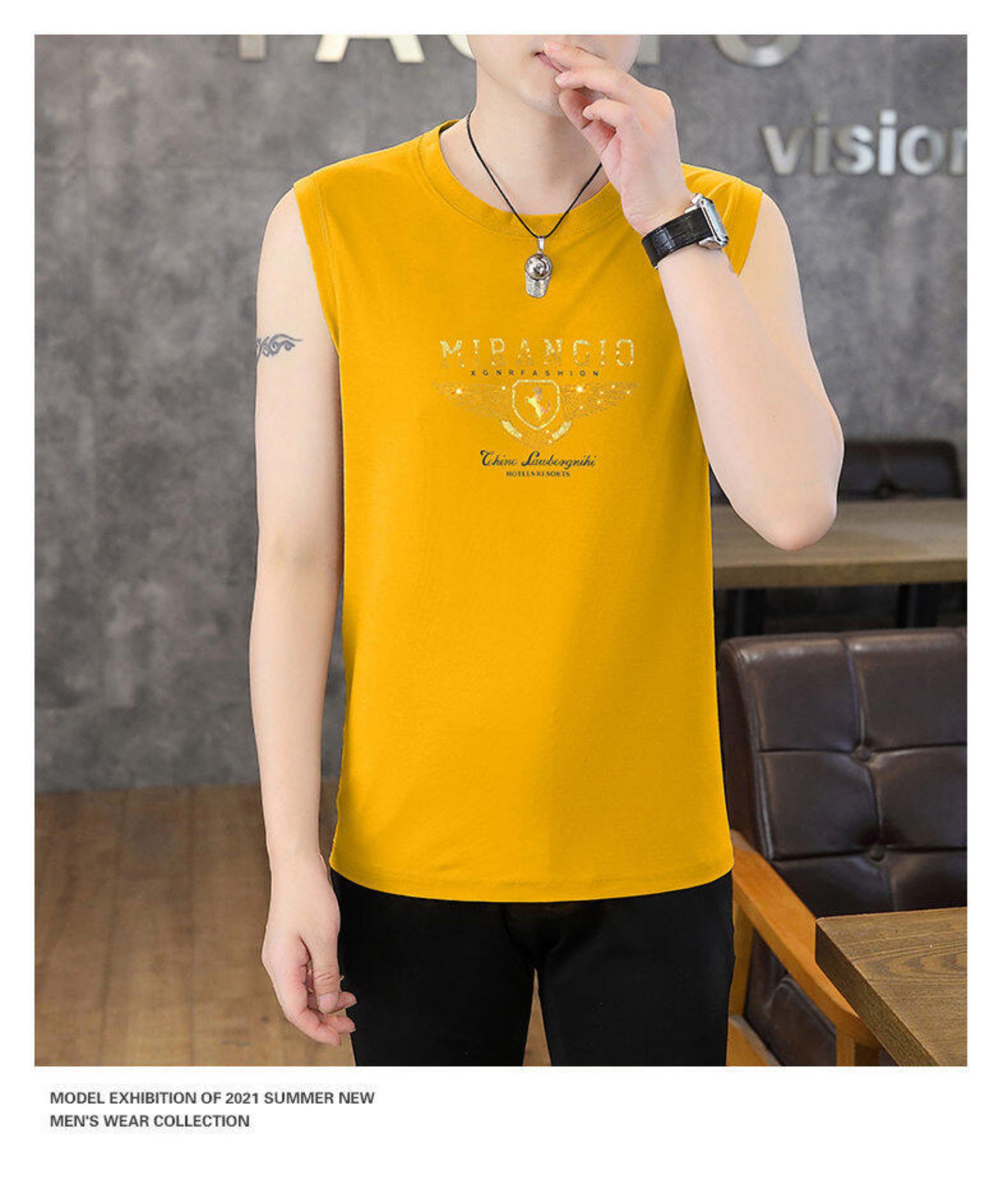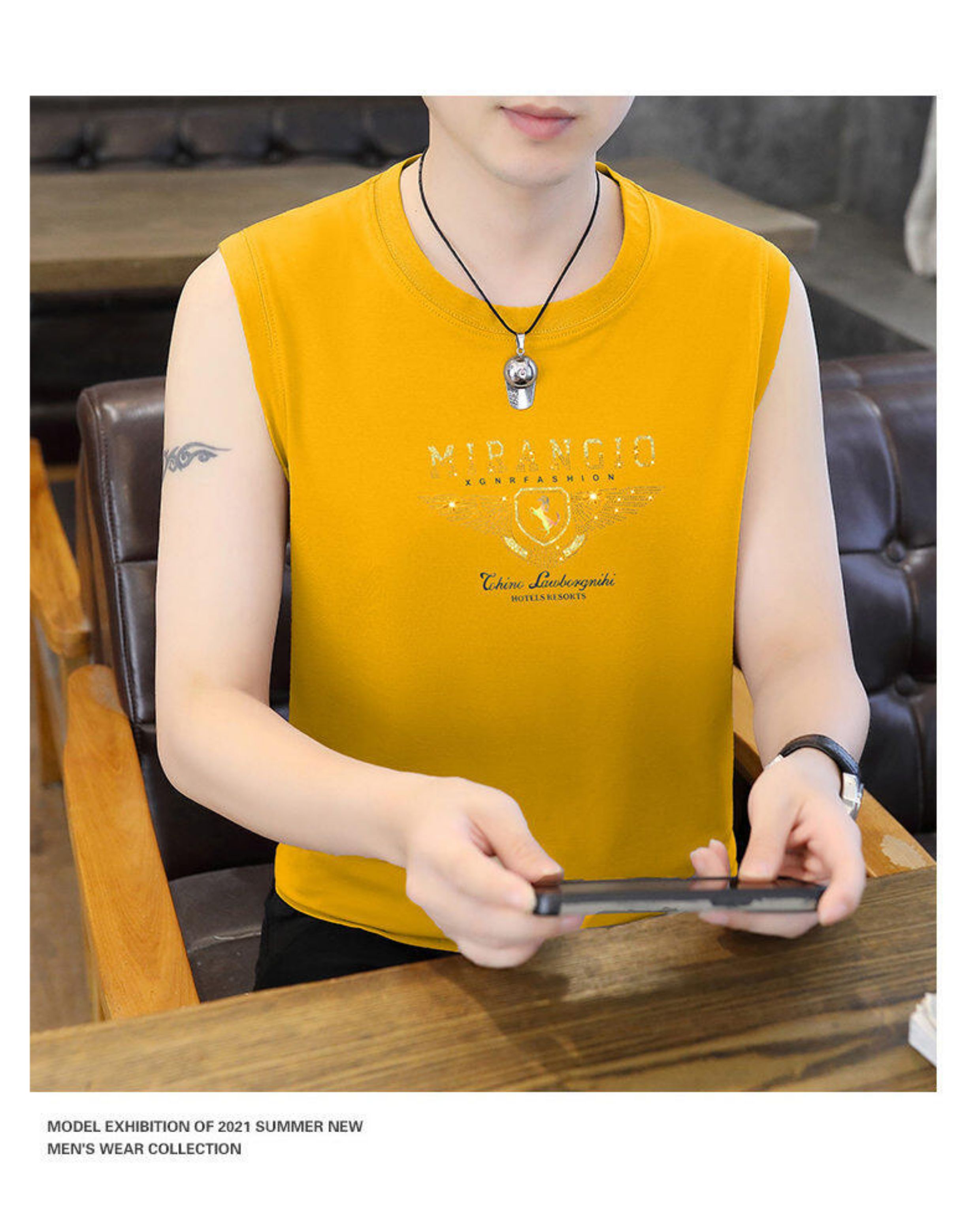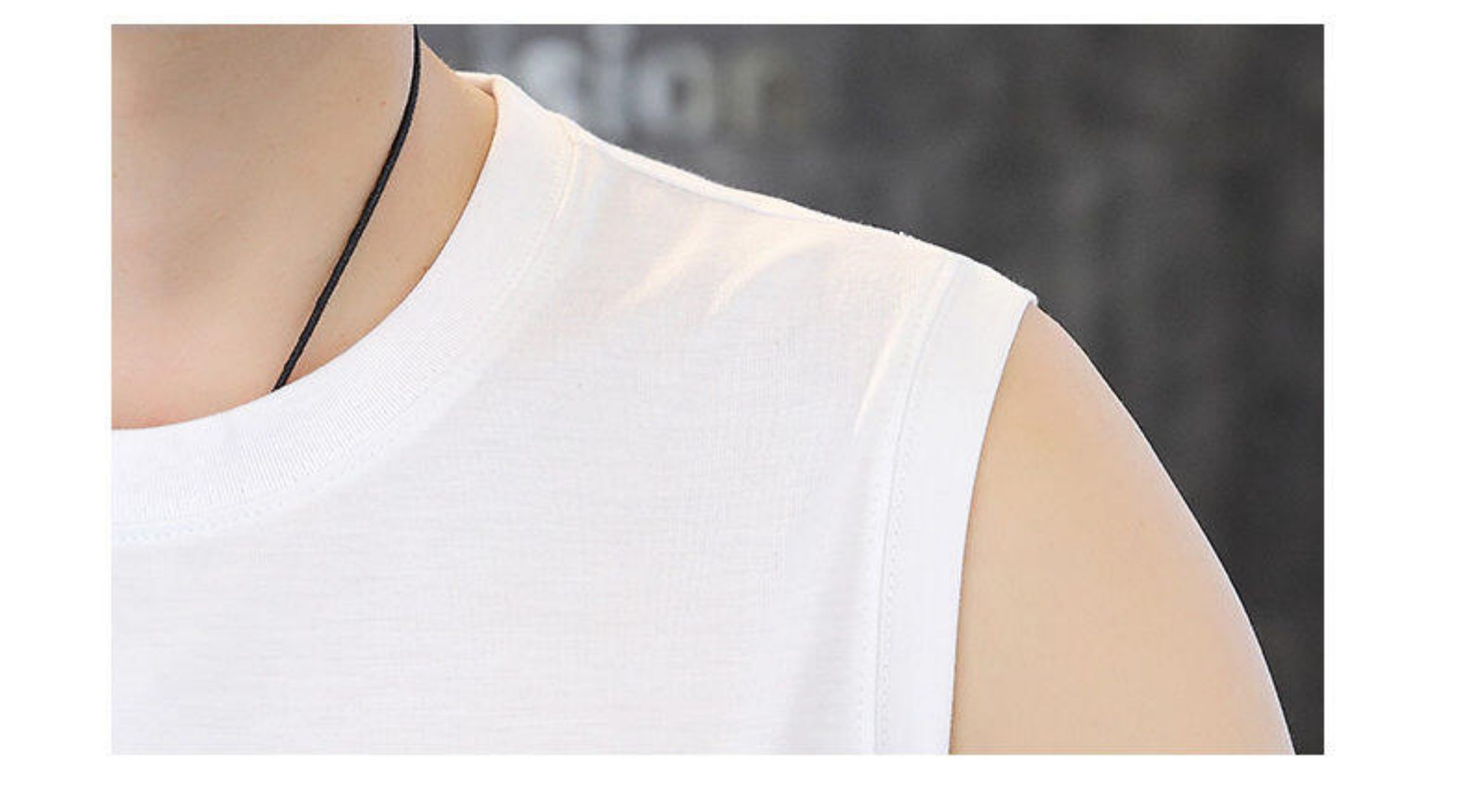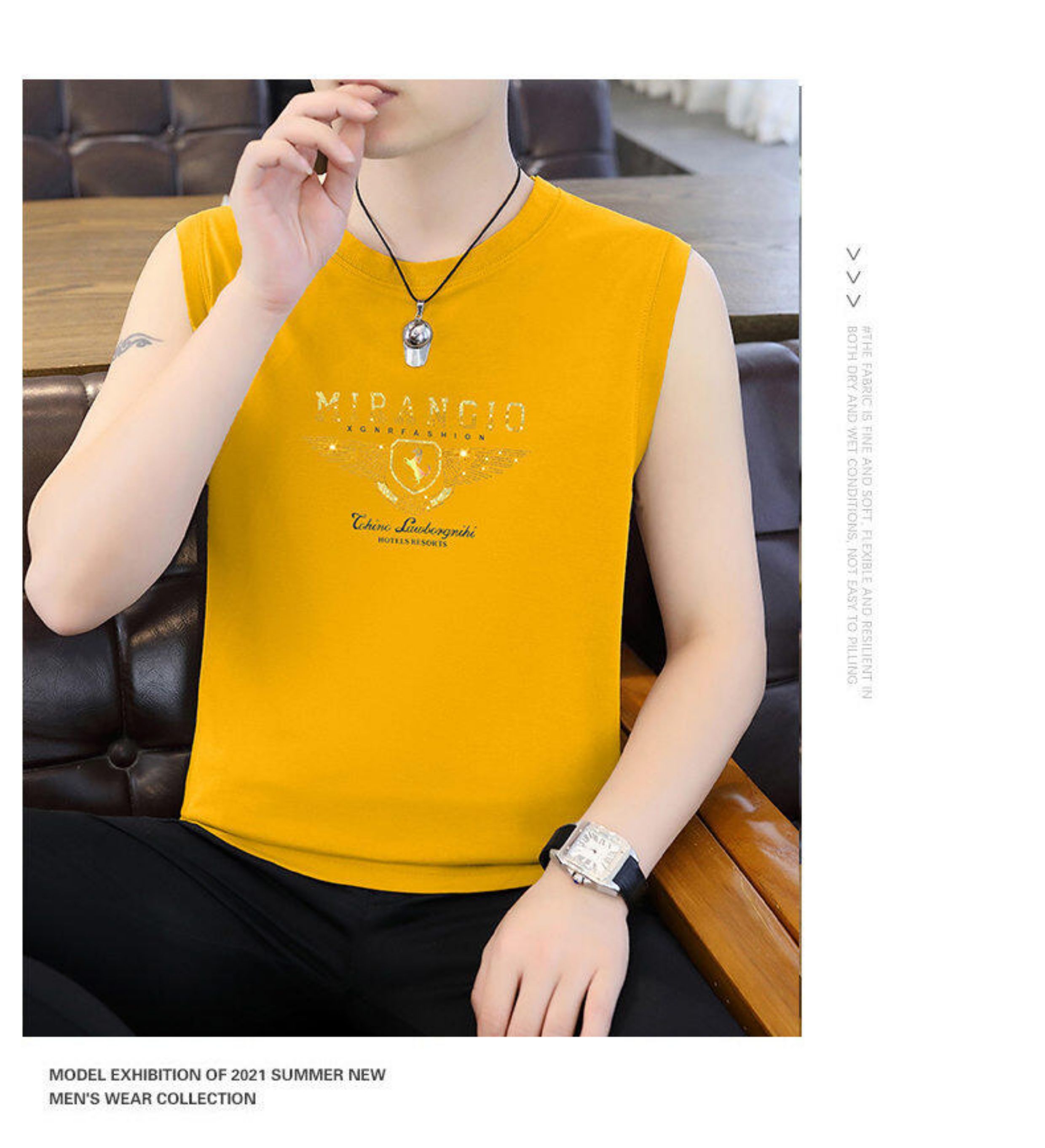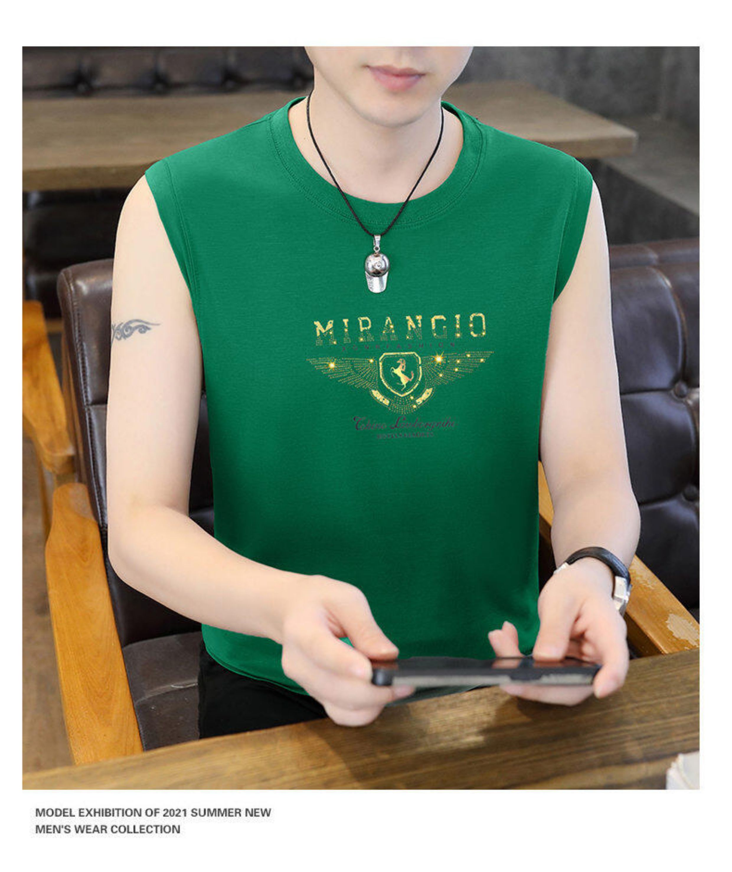 圓領絲光棉燙金透氣背心男夏季潮流白色無袖t恤男款夏裝冰絲坎肩