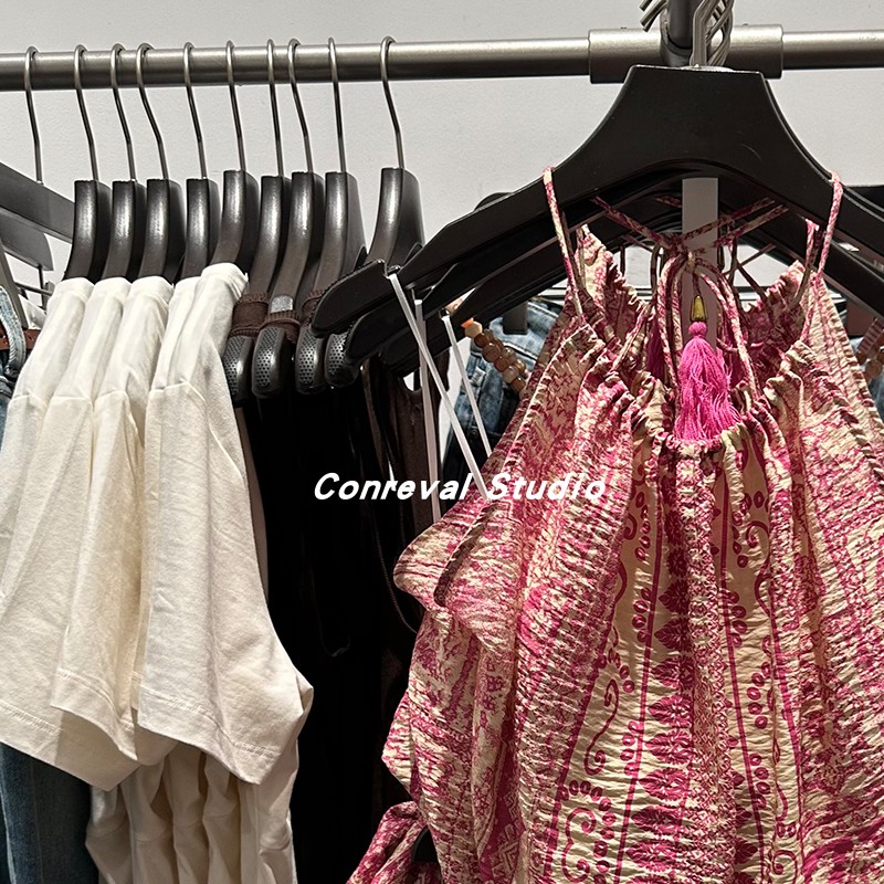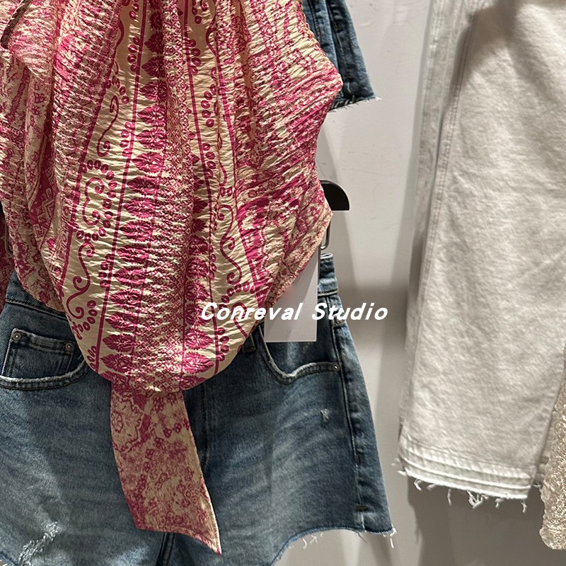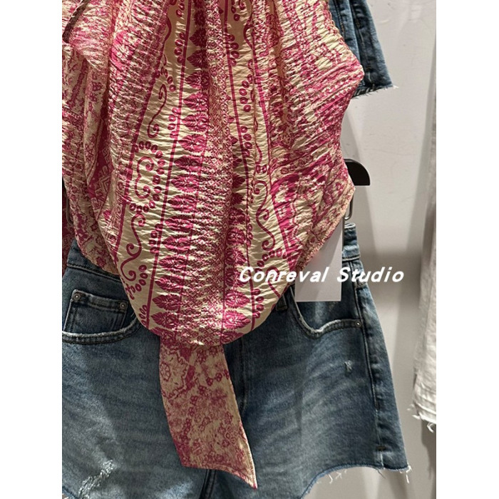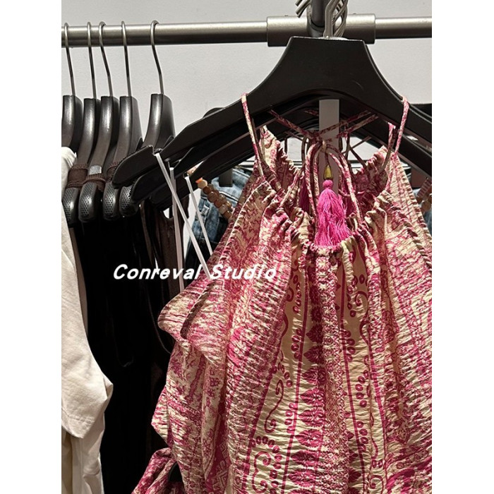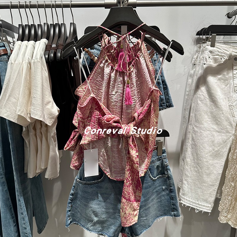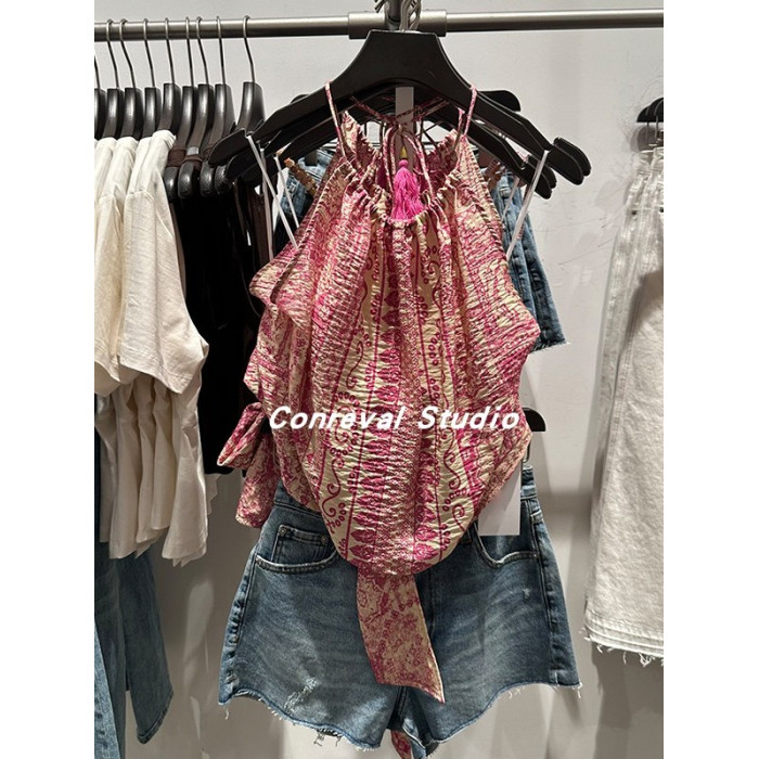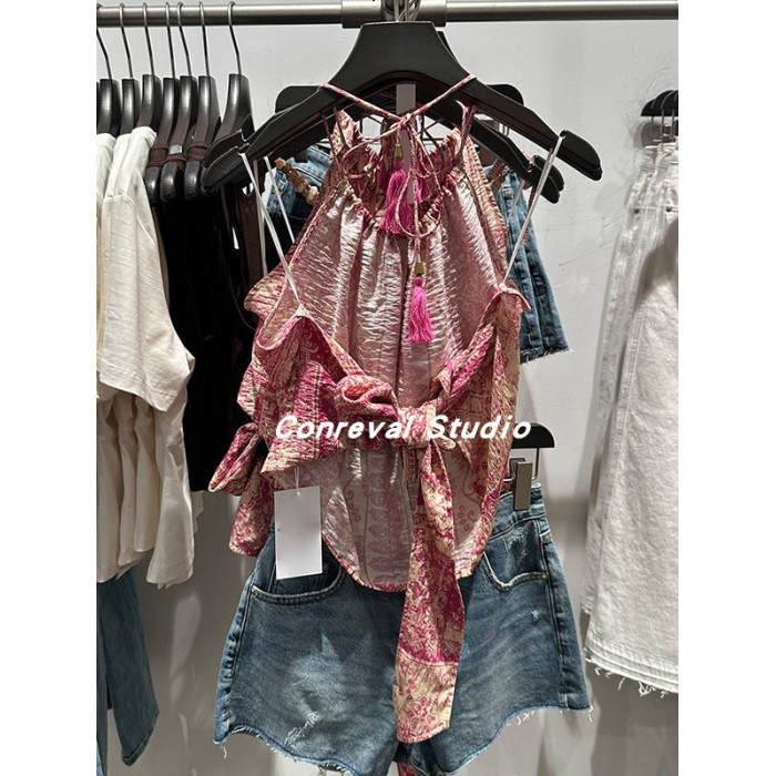 SH&UR2025夏季新款女裝海邊度假風圖案掛脖露背蝴蝶結吊帶衫上衣