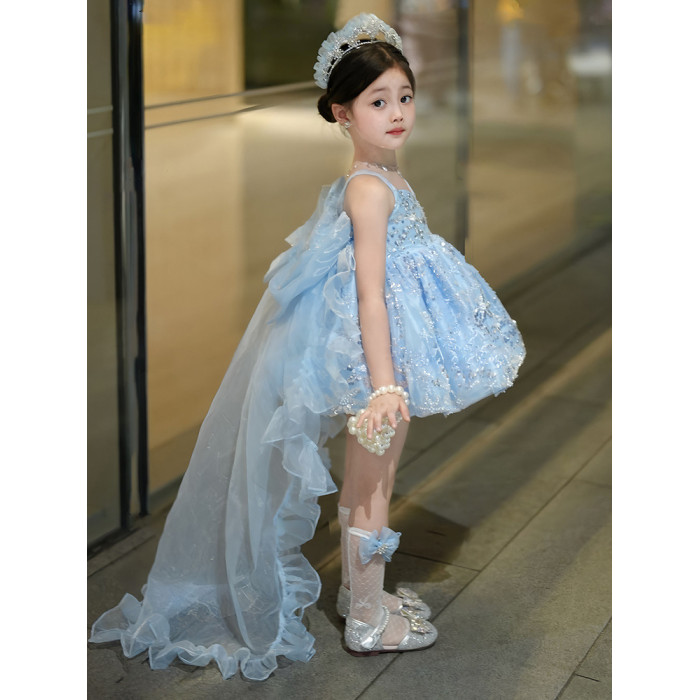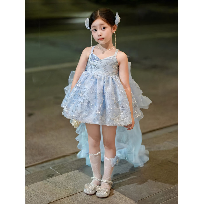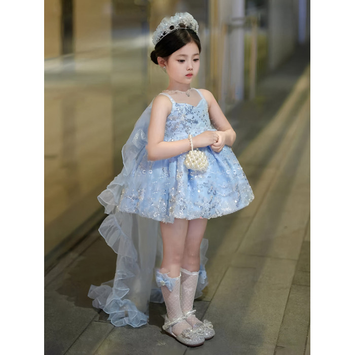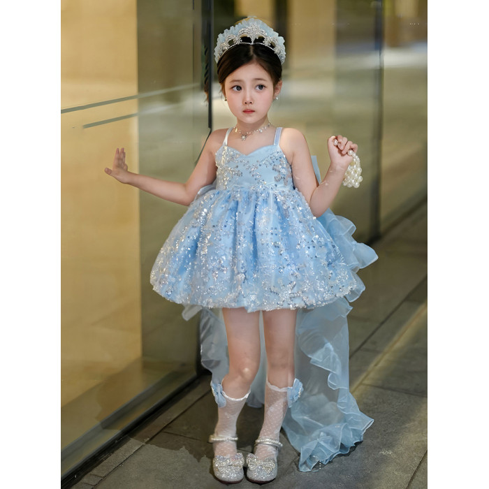 女童冰雪奇緣艾莎公主裙閃亮雪花蓬蓬吊帶裙兒童夏季新款演出禮服
