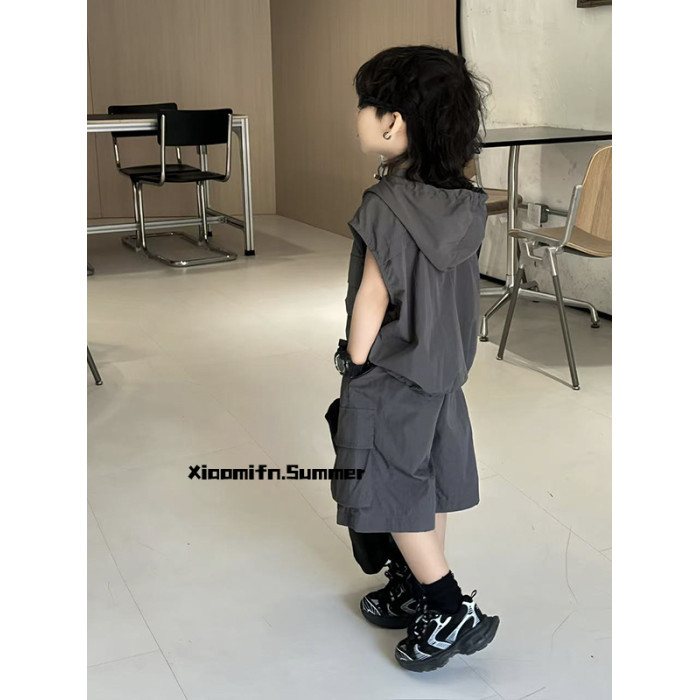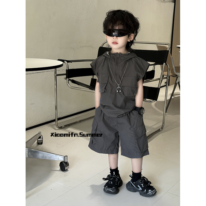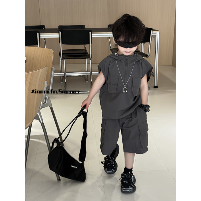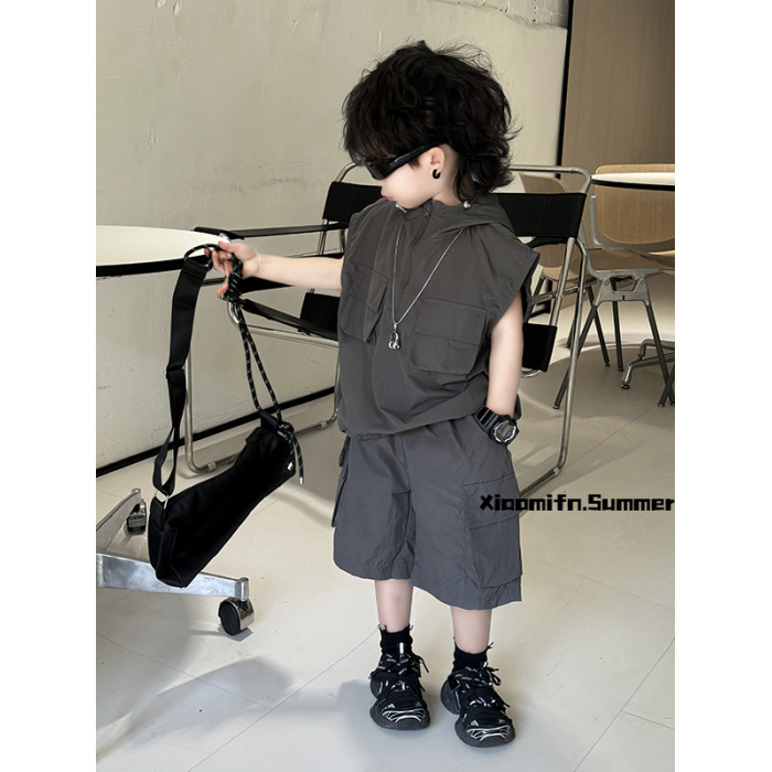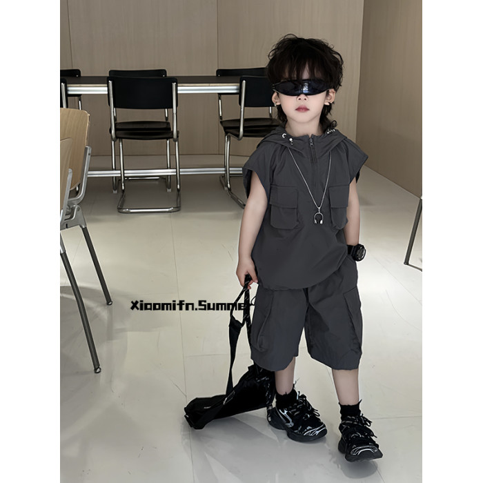 香港BAKUXIA男童短袖套裝夏季中小童痞帥潮酷工裝無袖連帽兩件套