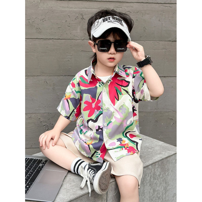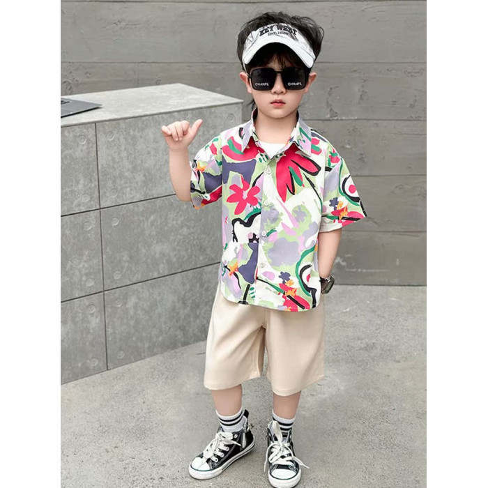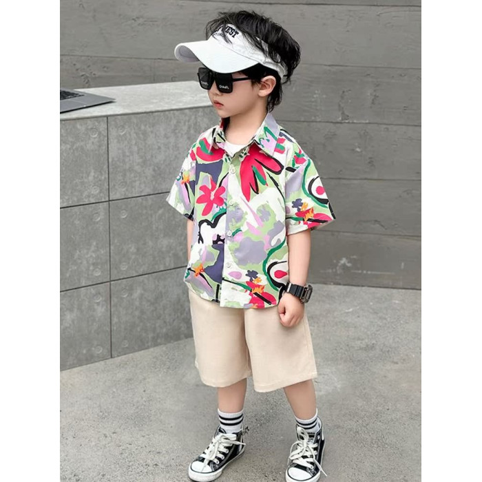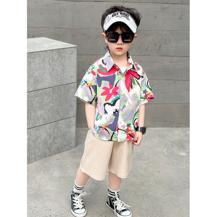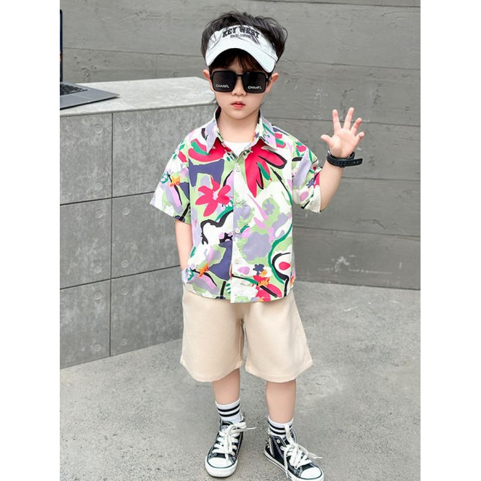 安哼安哼男童夏裝套裝2025新款痞帥兒童夏季薄款短袖襯衫寬松時髦