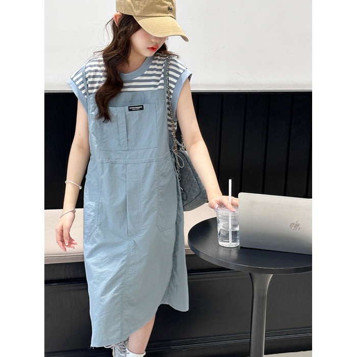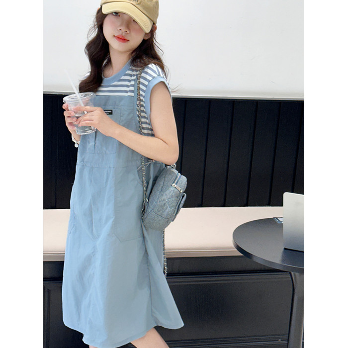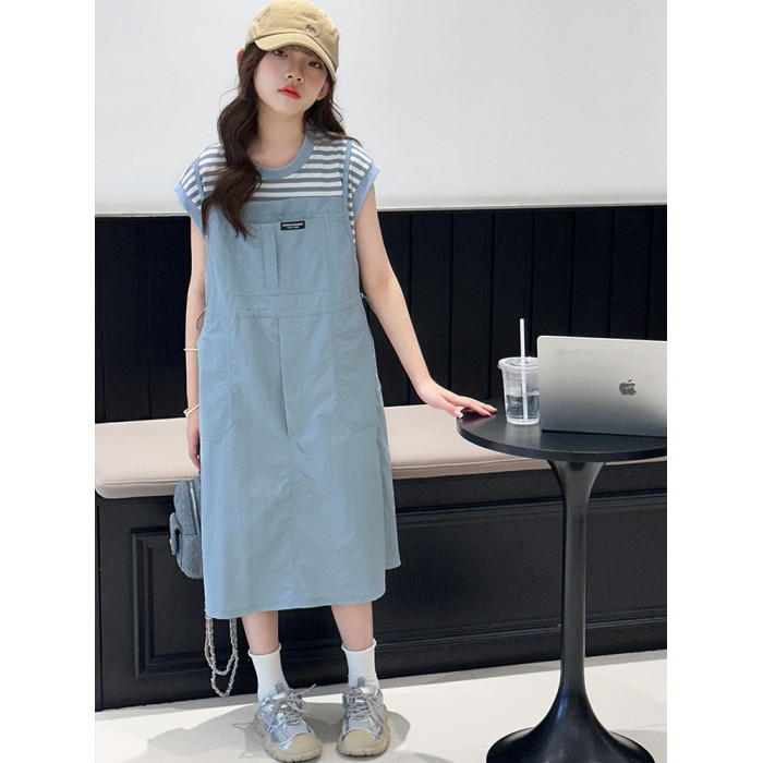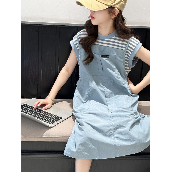女童夏裝連衣裙2025新款洋氣中大童6-12嵗15嵗休閒假兩件條紋裙子