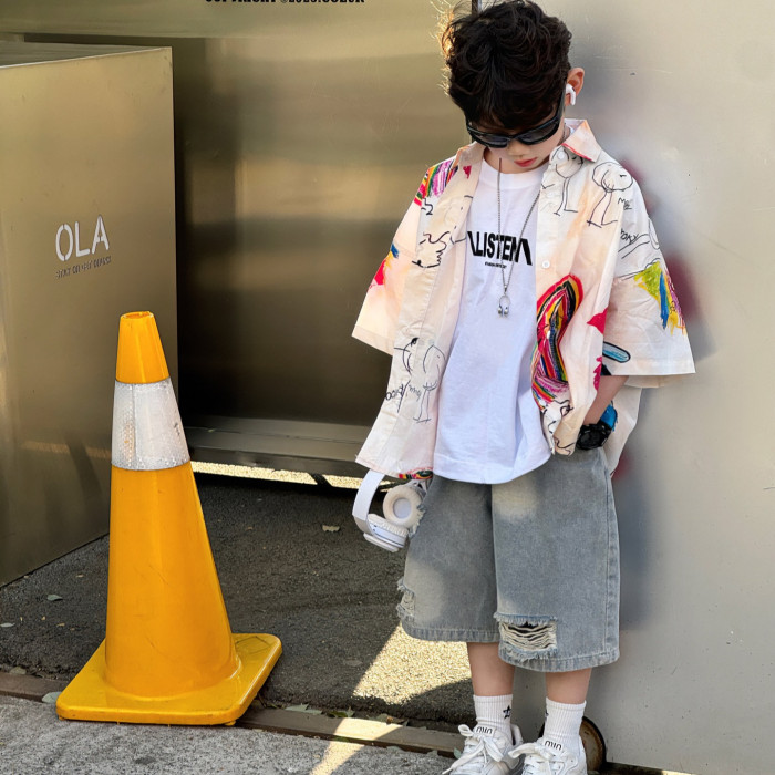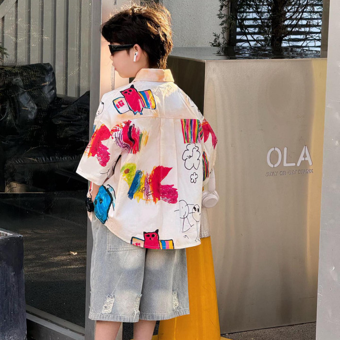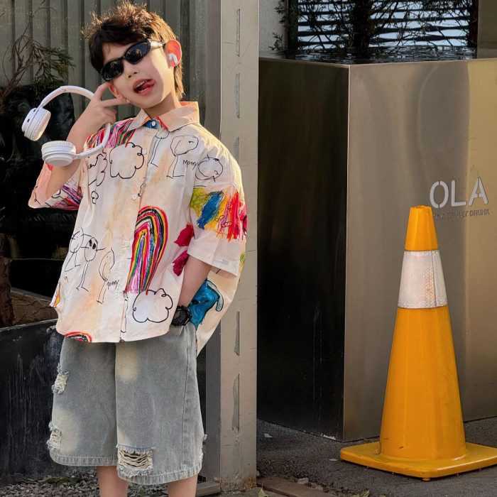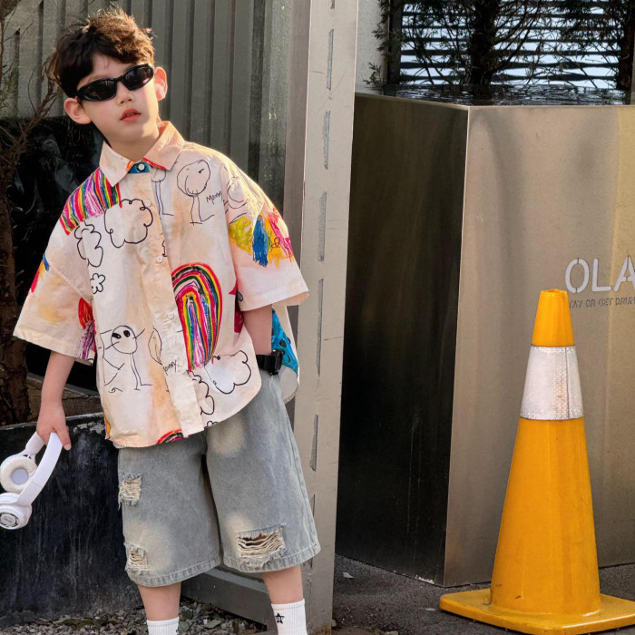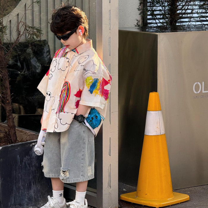 夏季新款韓版男童百搭洋氣時尚透氣花襯衫兒童短袖時髦涼爽上衣