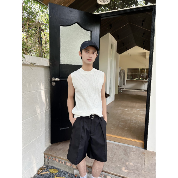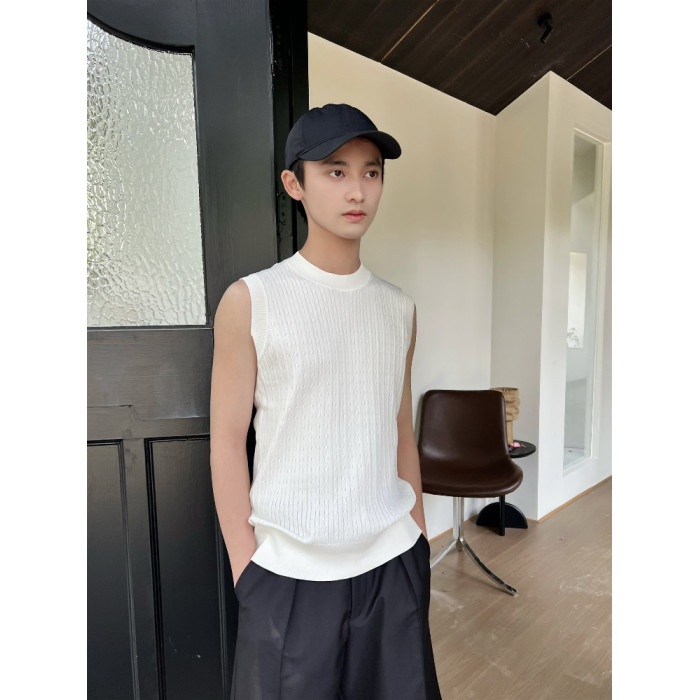 乜Q復古純色紋理老錢風時髦針織背心ins男休閒高級感無袖坎肩上衣