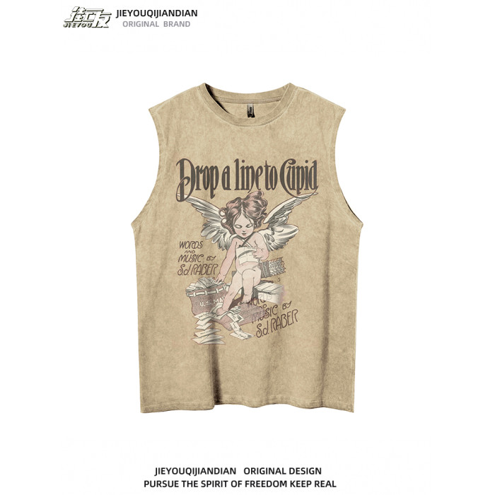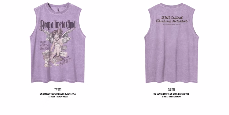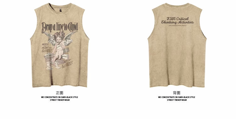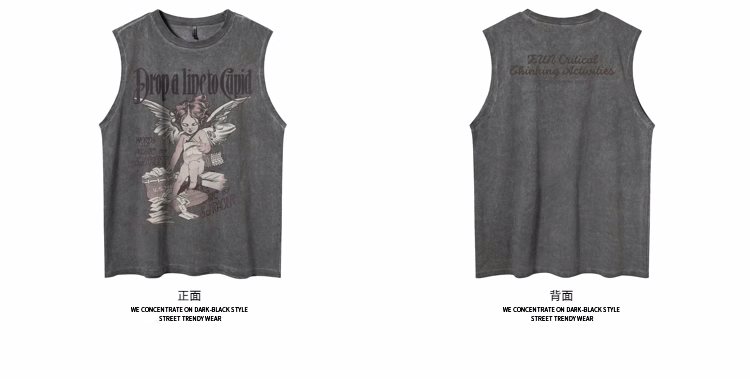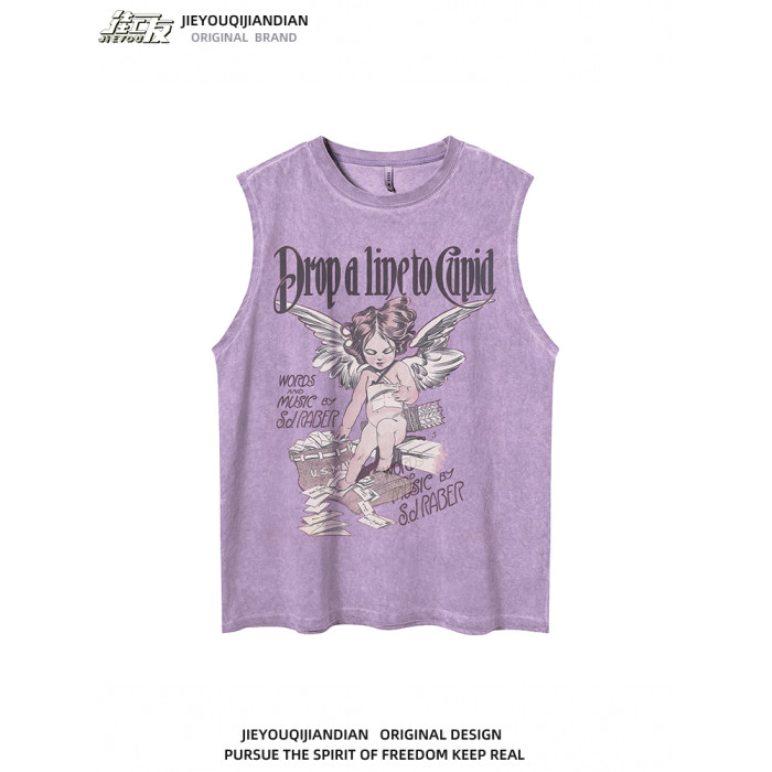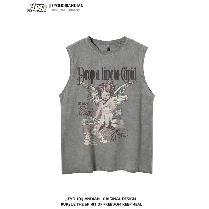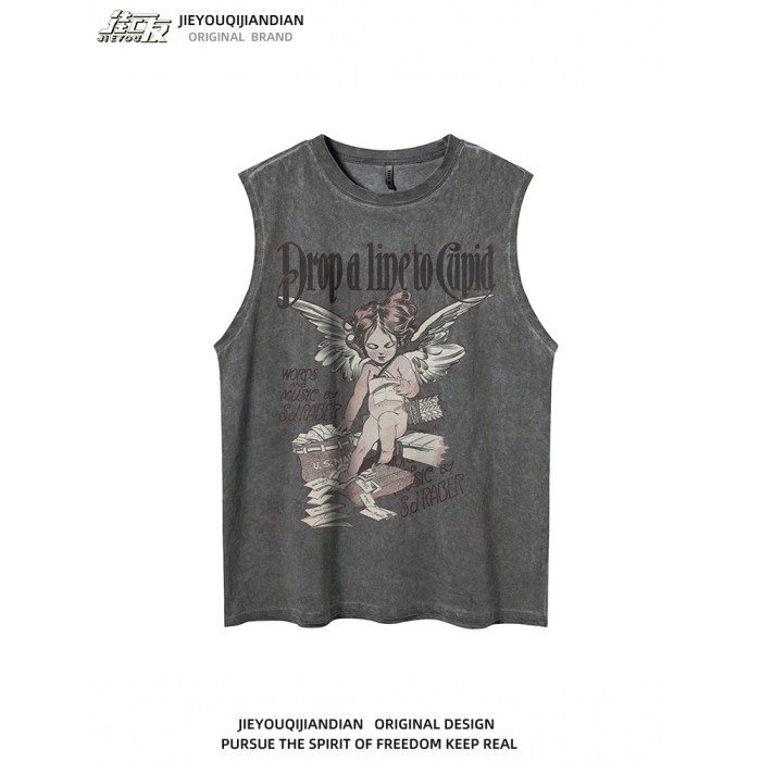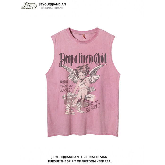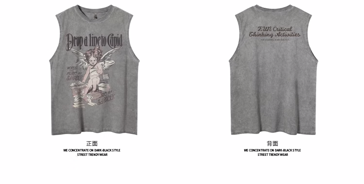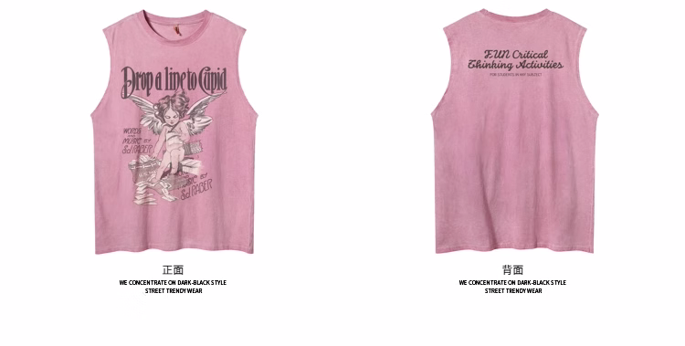歐美復古小天使印花圓領無袖背心男女潮牌純棉寬松休閒情侶坎肩t