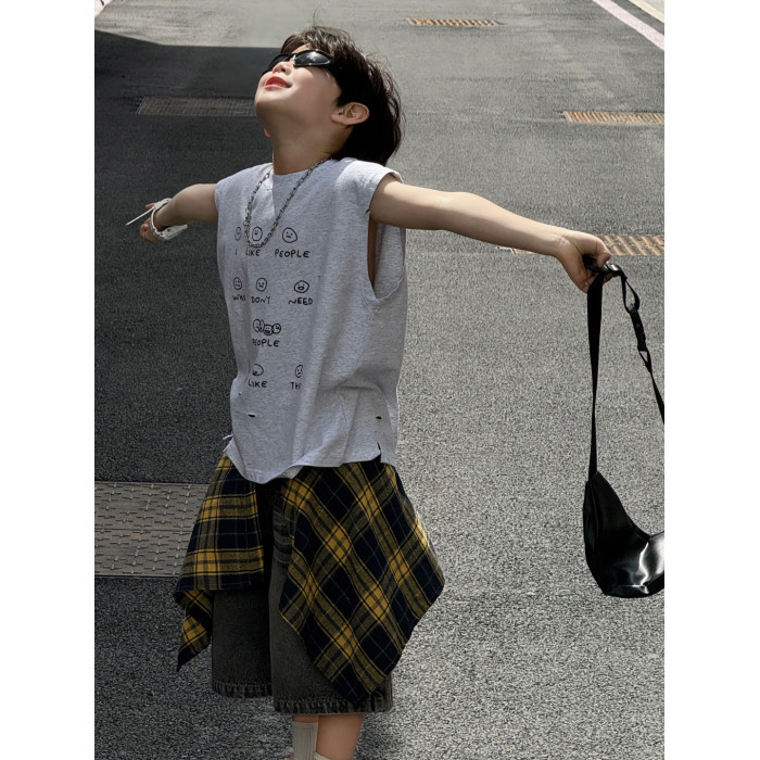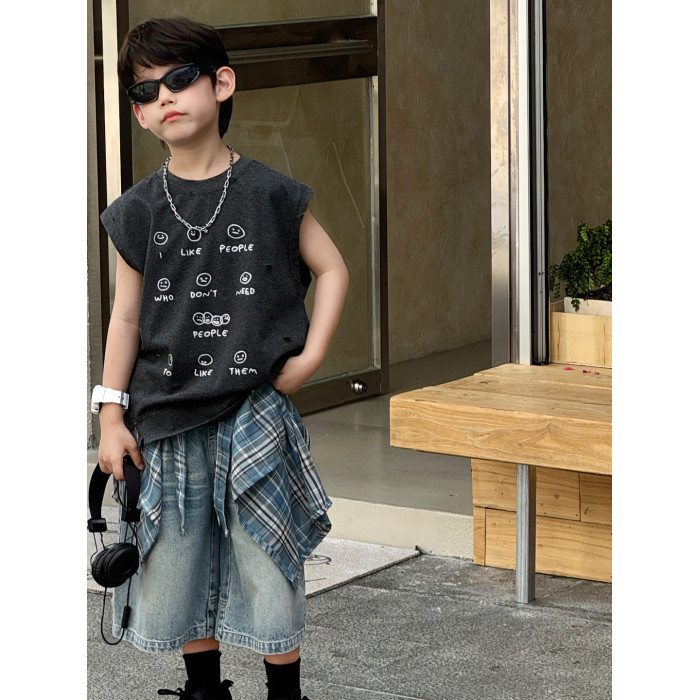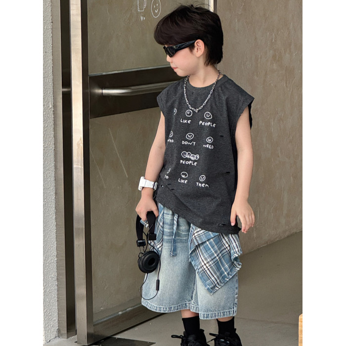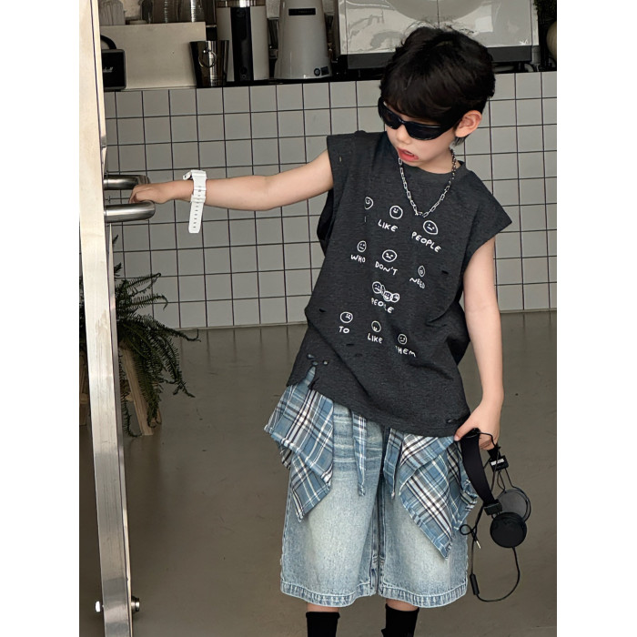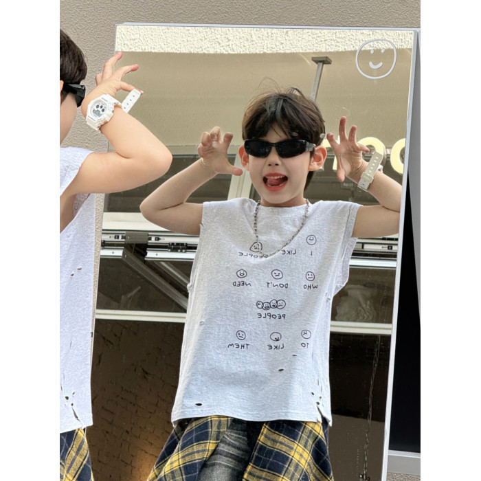 2025夏季新款韓版男童時尚破洞卡通透氣坎肩兒童上衣T恤