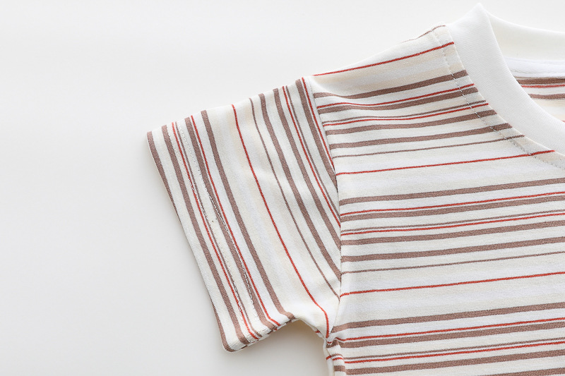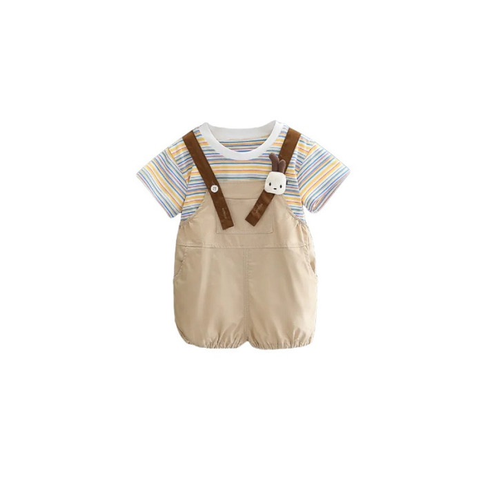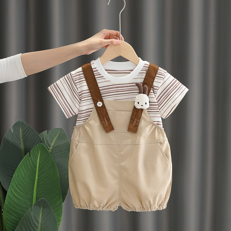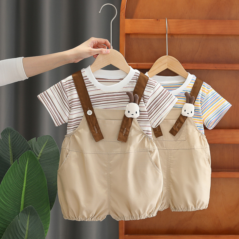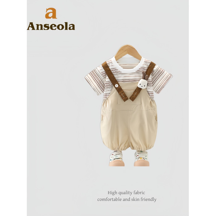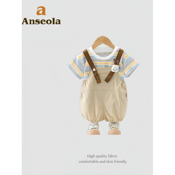 法國anseola夏季男童短袖套裝2025新款寶寶條紋小狗背帶褲兩件套