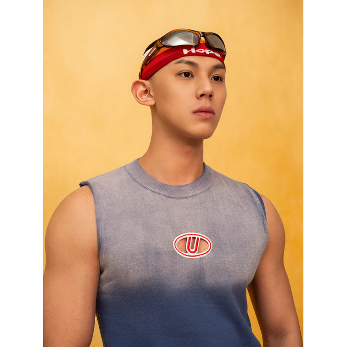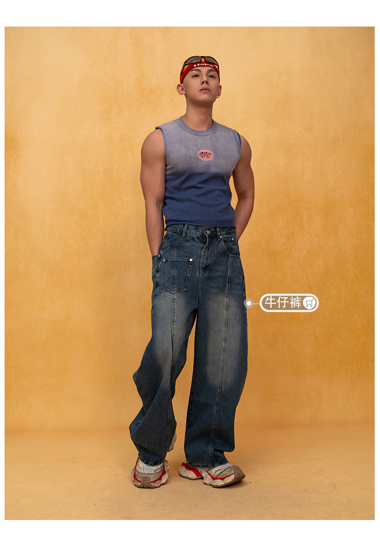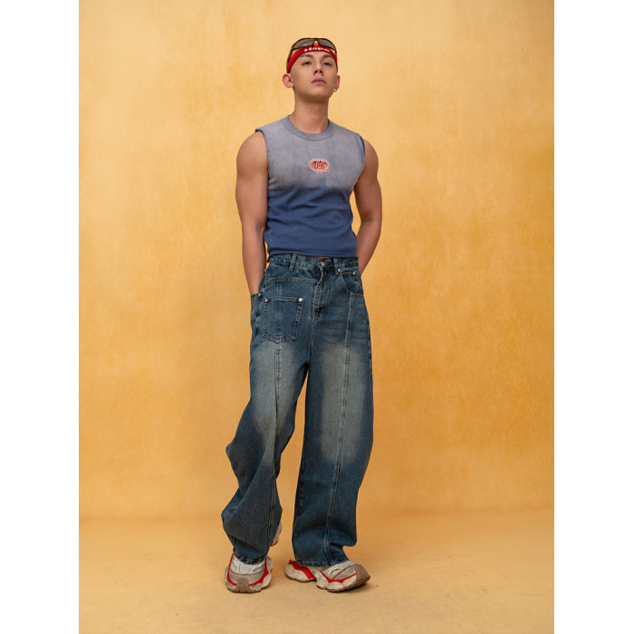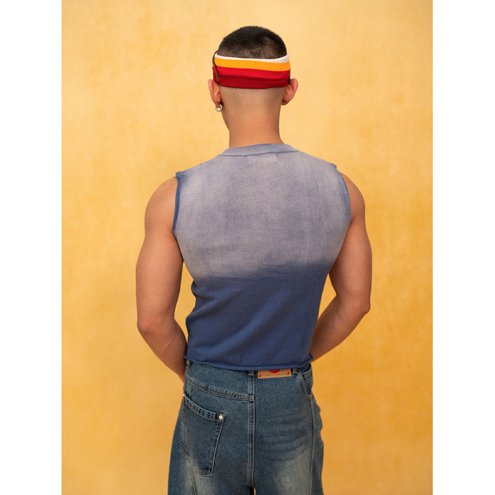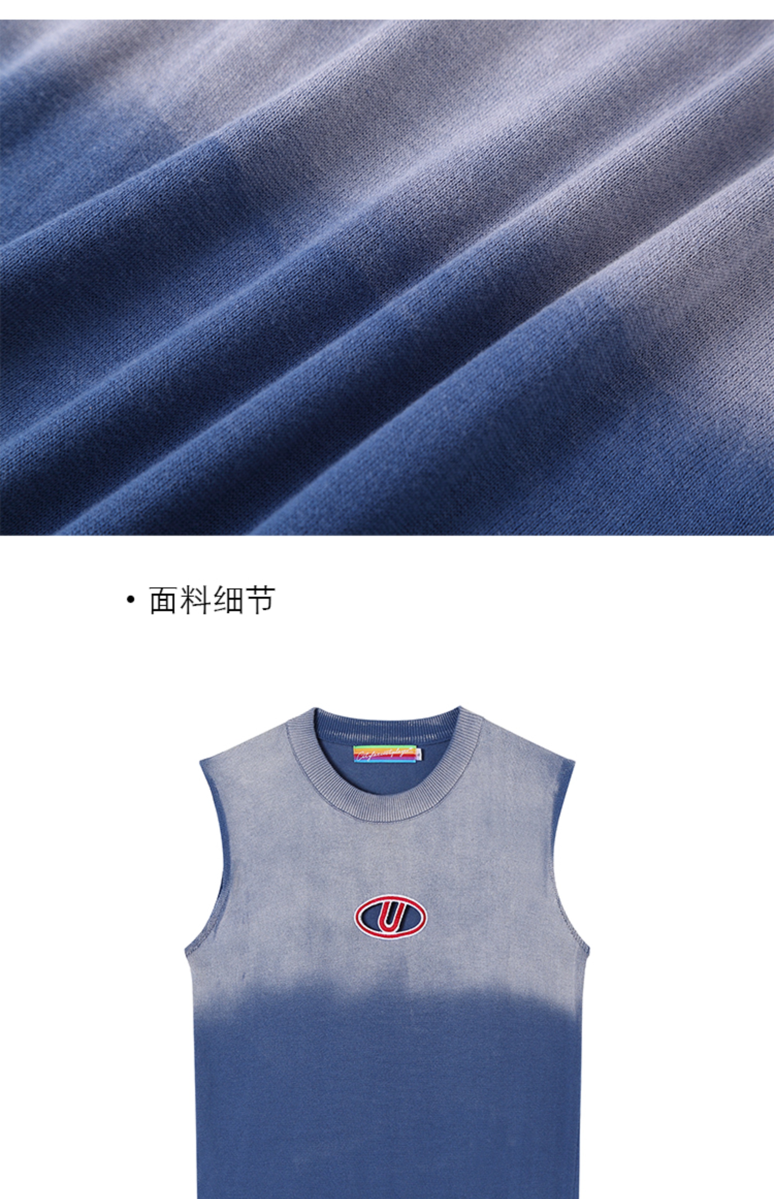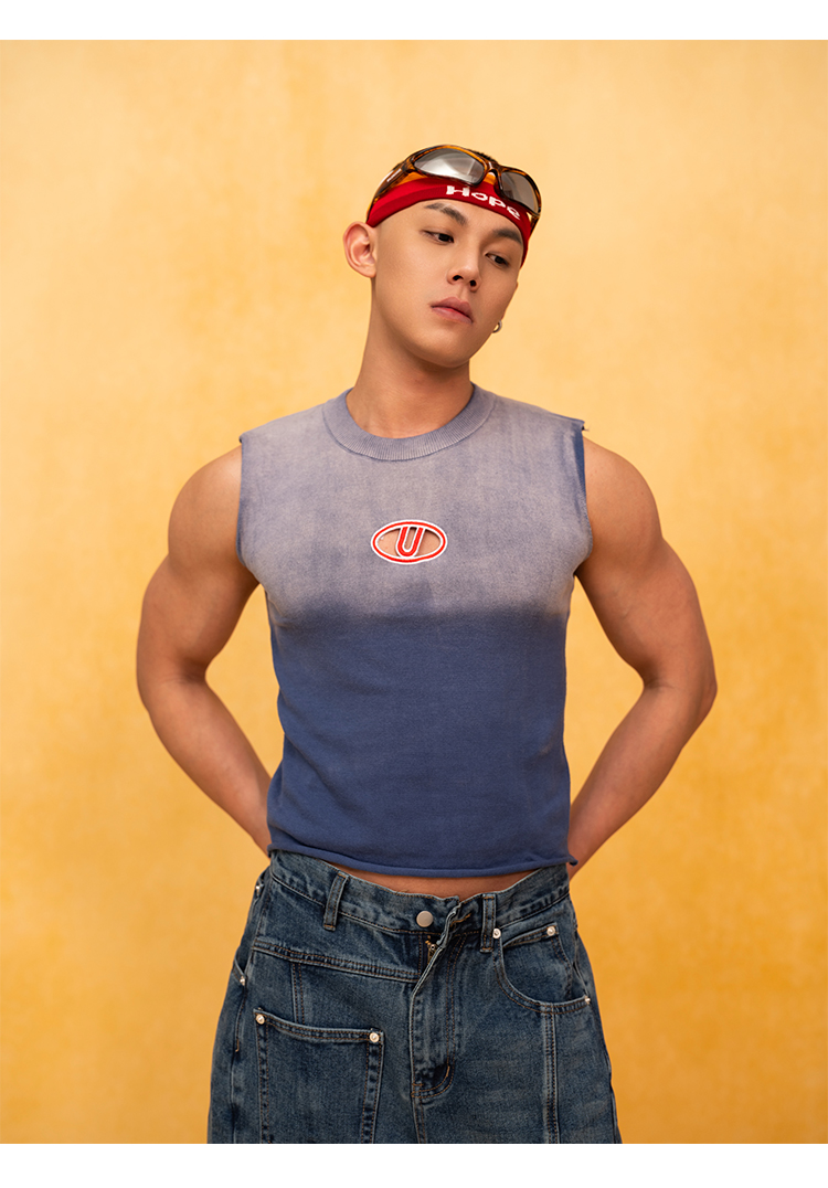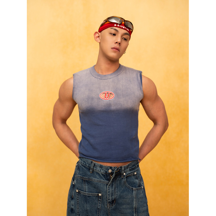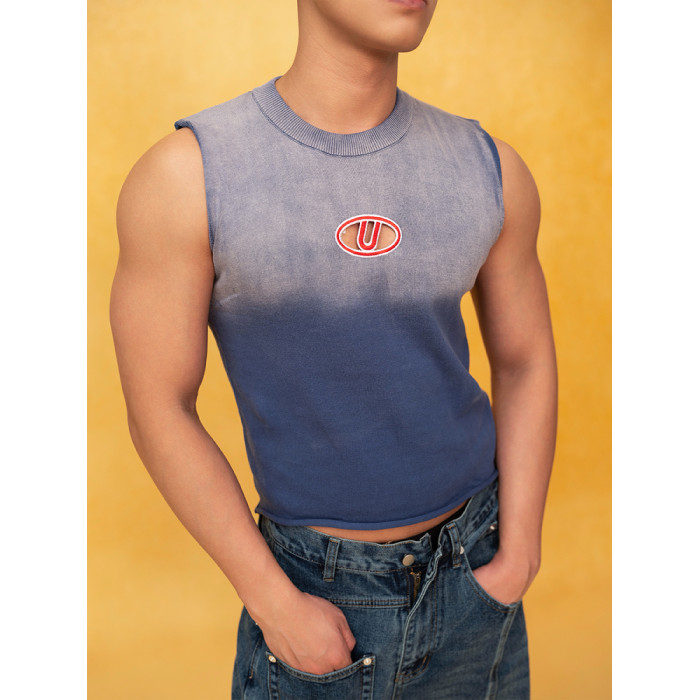 CLP藍色水洗漸變刺綉鏤空無袖短款背心T恤男坎肩修身運動休閒復古