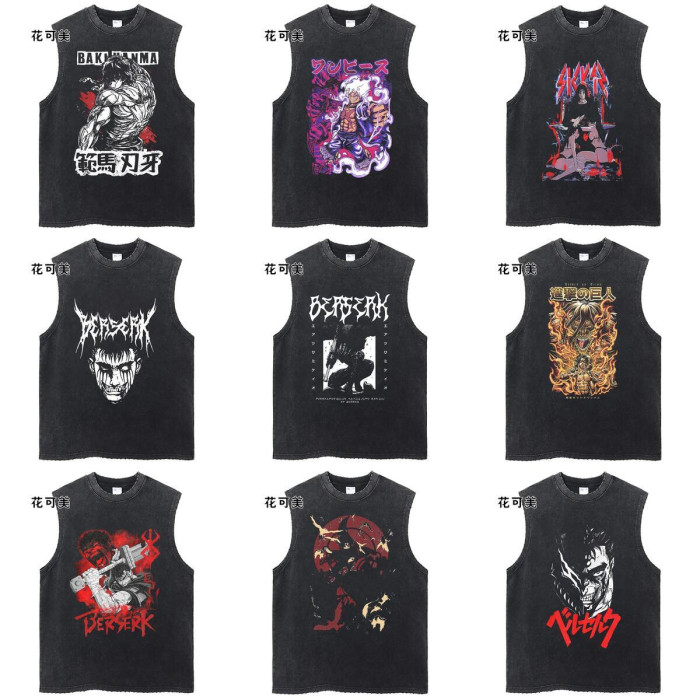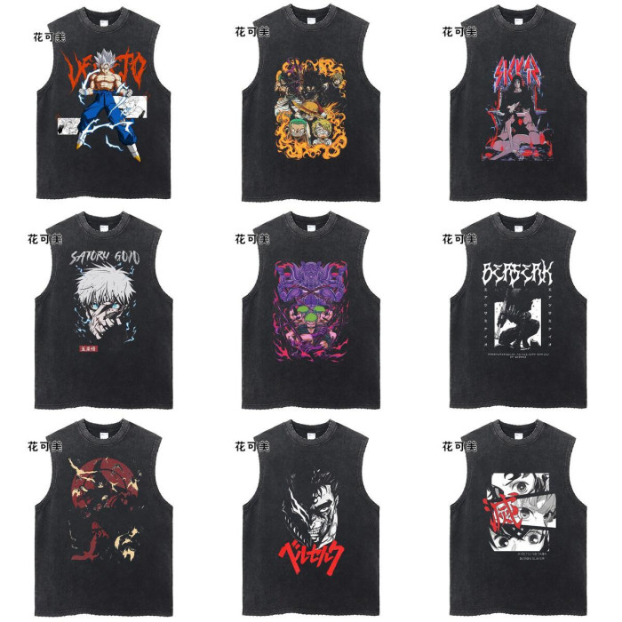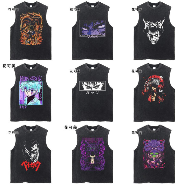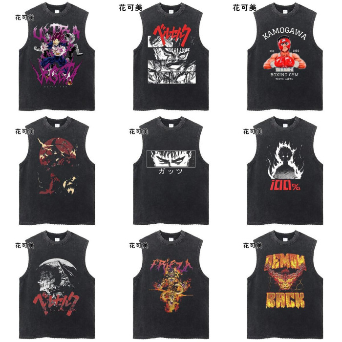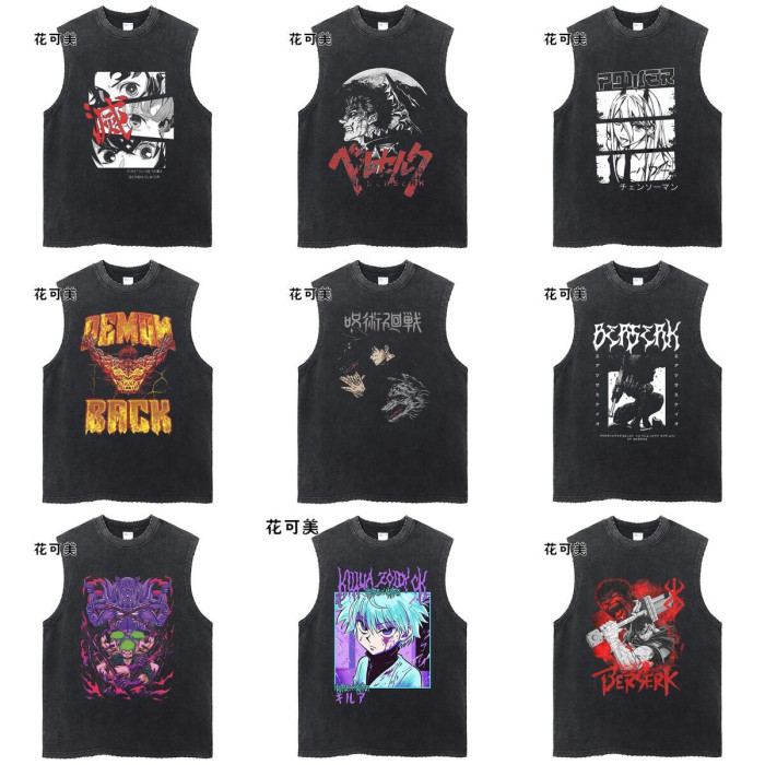 水洗復古潮美式嘻哈動漫落肩寬松浮世繪純棉夏季男士無袖背心做舊