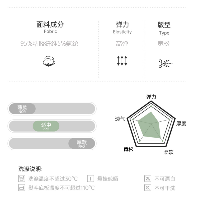 材質成分 粘膠纖維(粘纖)95% 聚氨酯彈性纖維(氨綸)5%