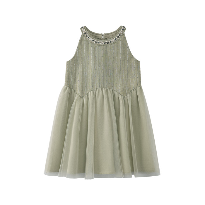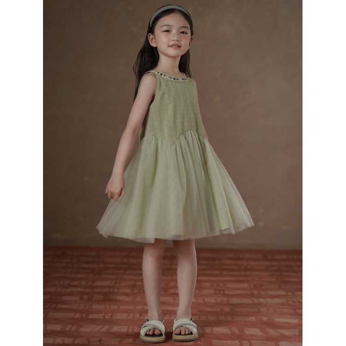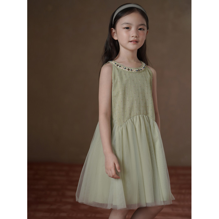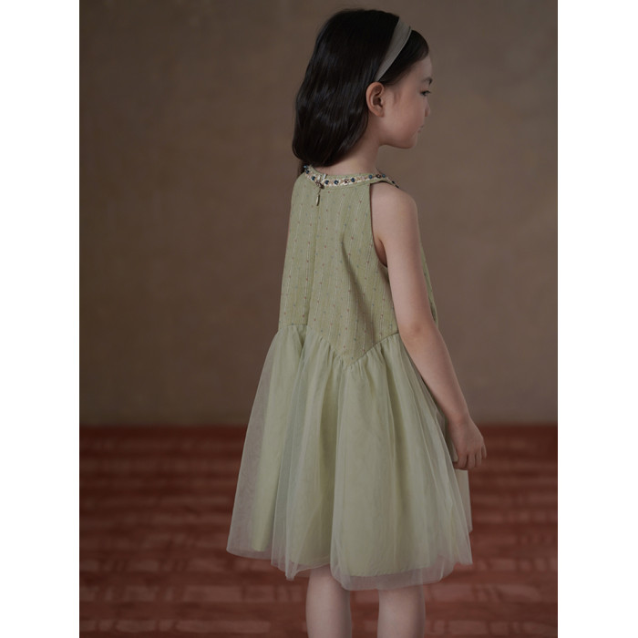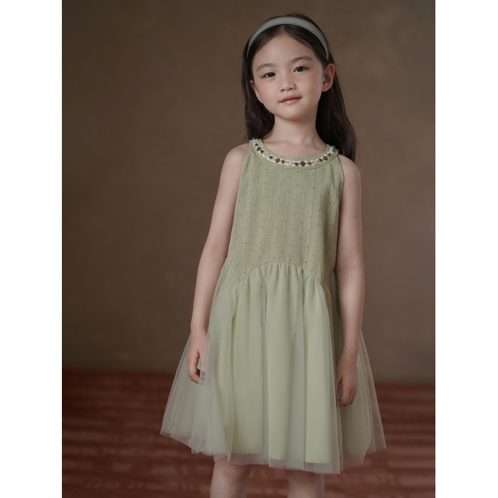 哈齒童裝兒童連衣裙度假風綠色長裙女童拼接紗裙中大童背心裙洋氣