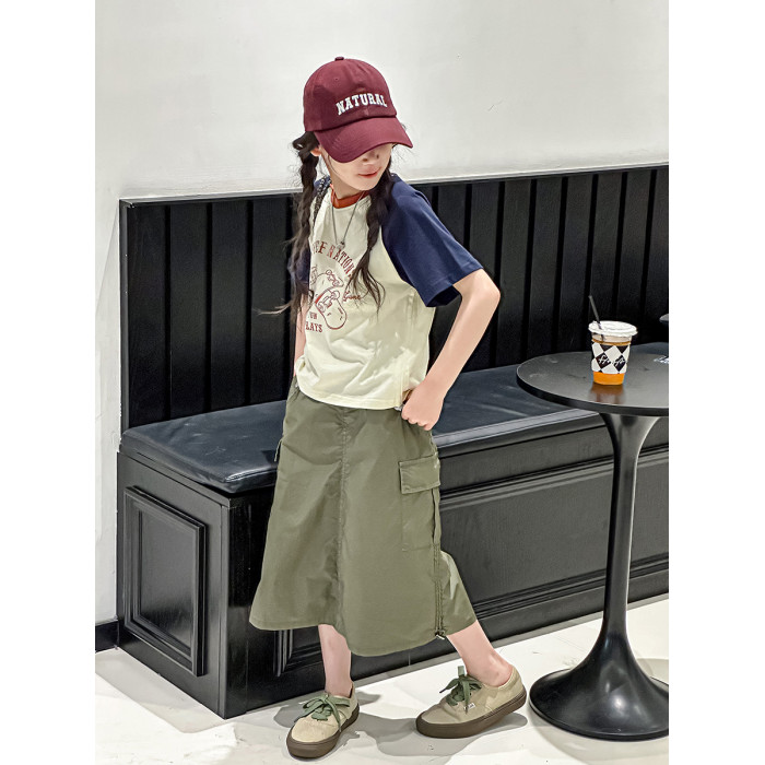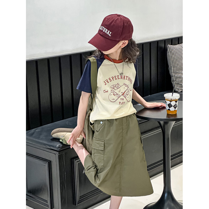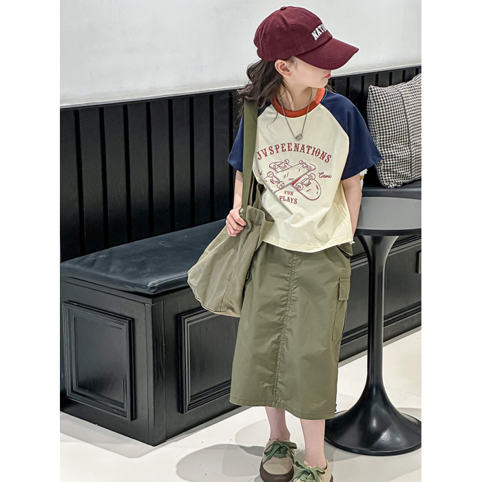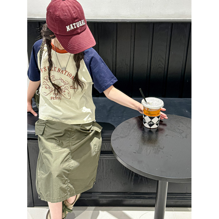 波拉韓童裝女童拼色短袖t恤2025夏季兒童插肩袖T恤小女孩圓領上衣
