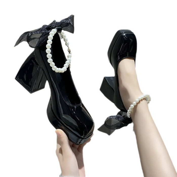 瑪麗珍高跟鞋女2024新款方頭可愛小皮鞋珍珠白色漆皮粗跟單鞋