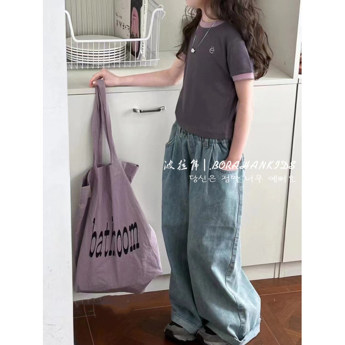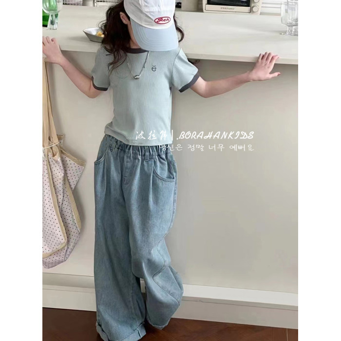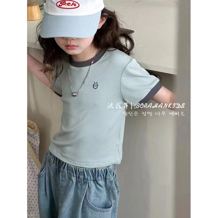 女童短款T恤2025夏新款中大童螺紋修身小t女孩子刺綉百搭短袖童裝