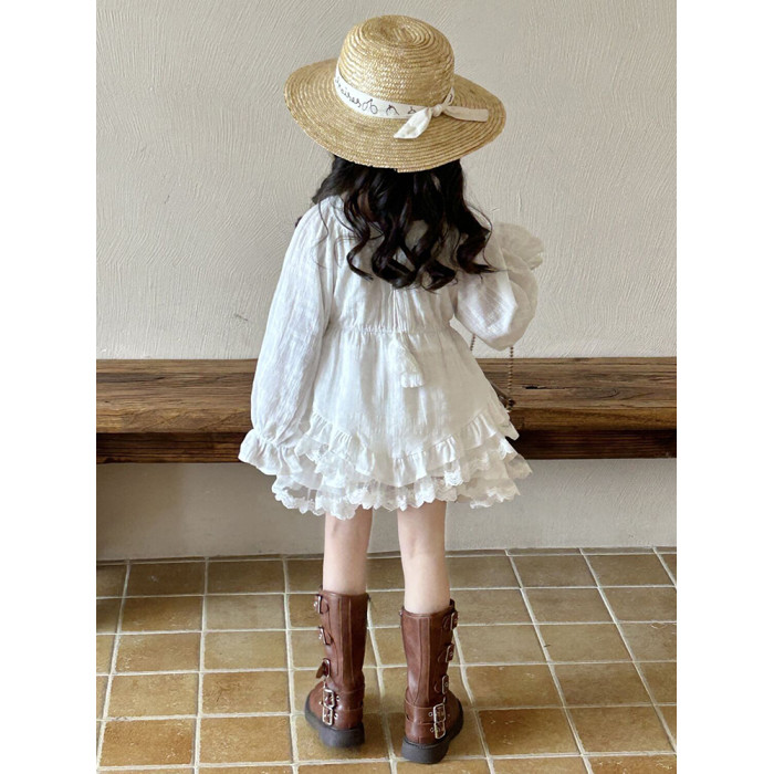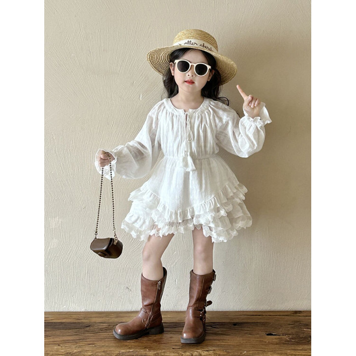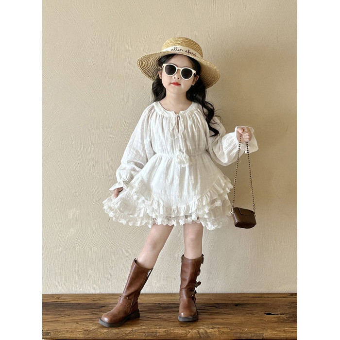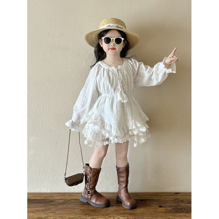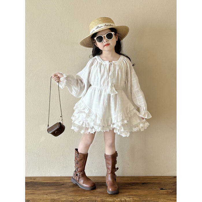 女童春裝2025新款童裝洋氣白色長袖氣質連衣裙不規則蛋糕裙公主裙