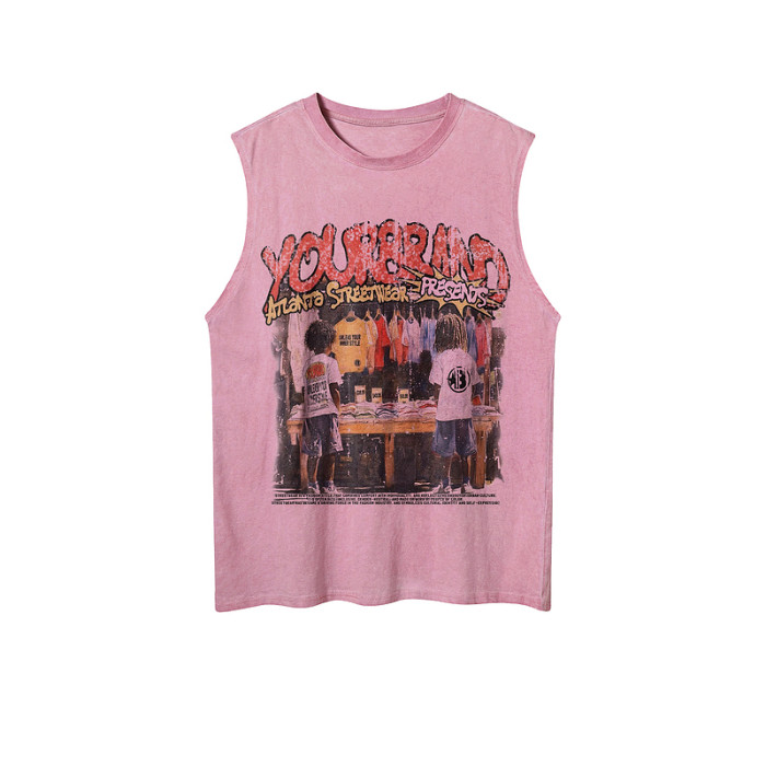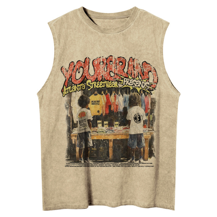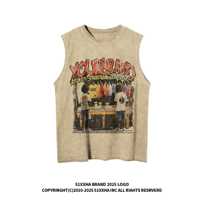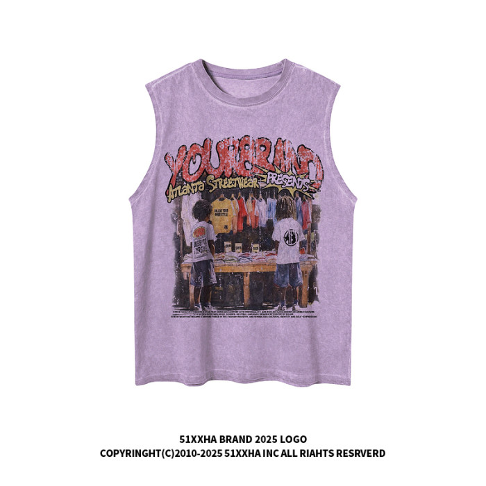 51嘻哈美式街頭做舊印花無袖T恤潮牌夏季寬松籃球運動坎肩背心男