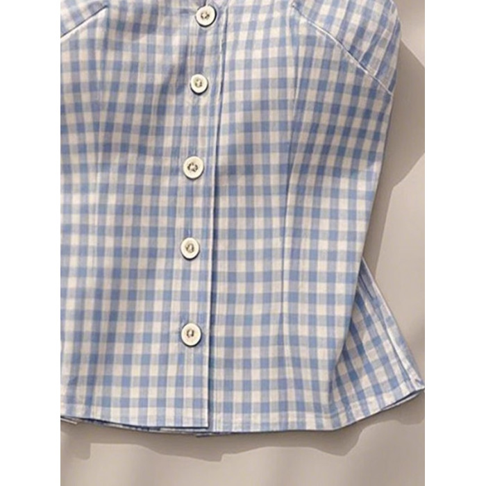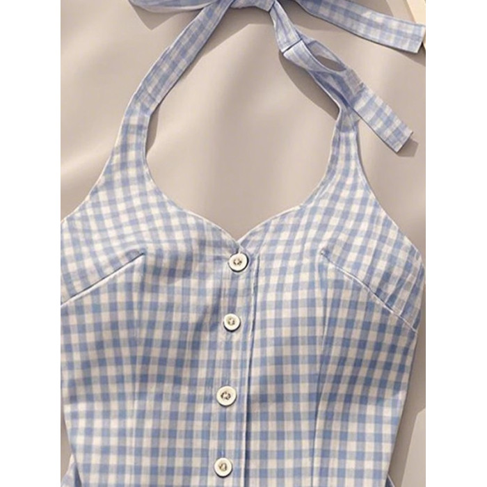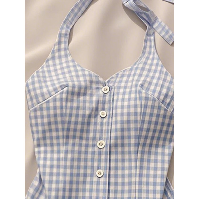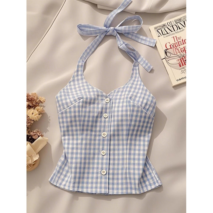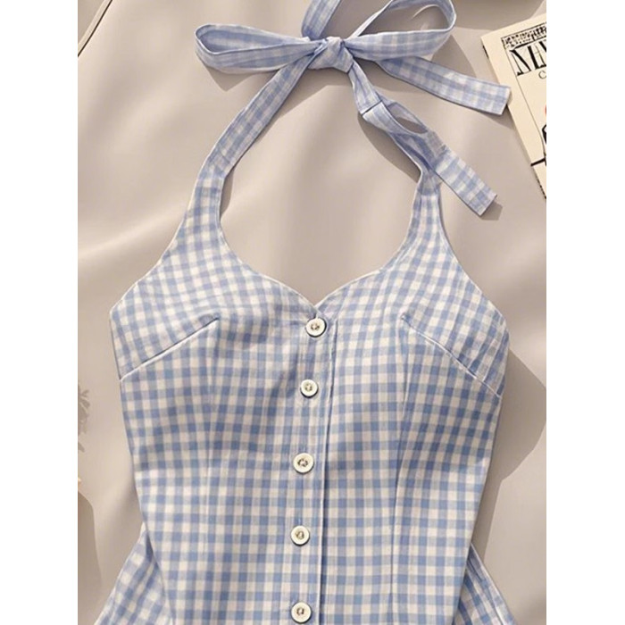 一慄莎子~復古藍色格子掛脖吊帶背心女夏季辣妹蝴蝶結系帶上小衣
