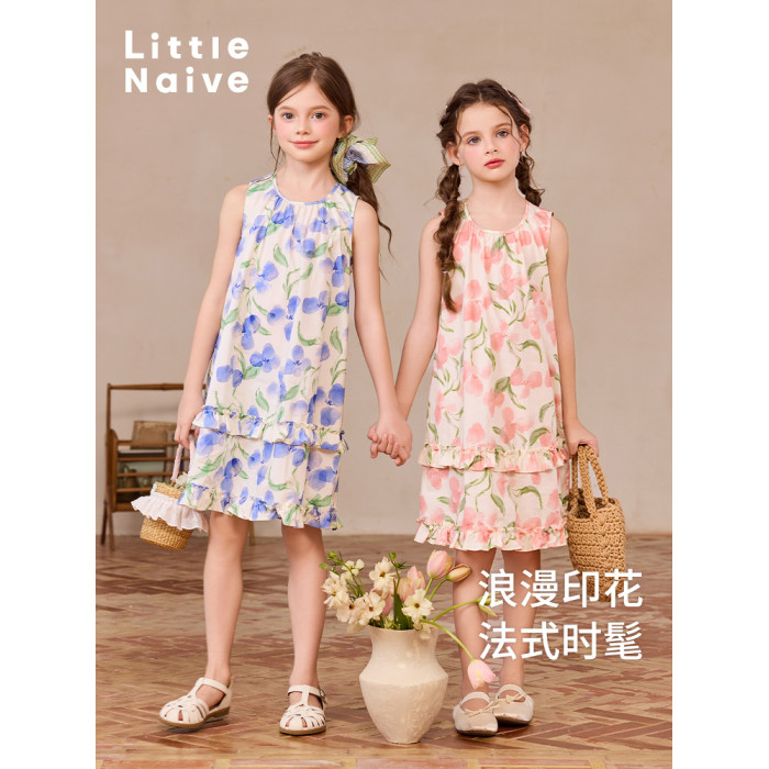Little Naive女童A字連衣裙夏季純棉背心裙兒童荷葉邊浪漫碎花裙