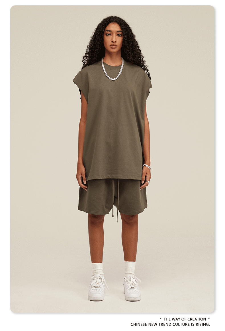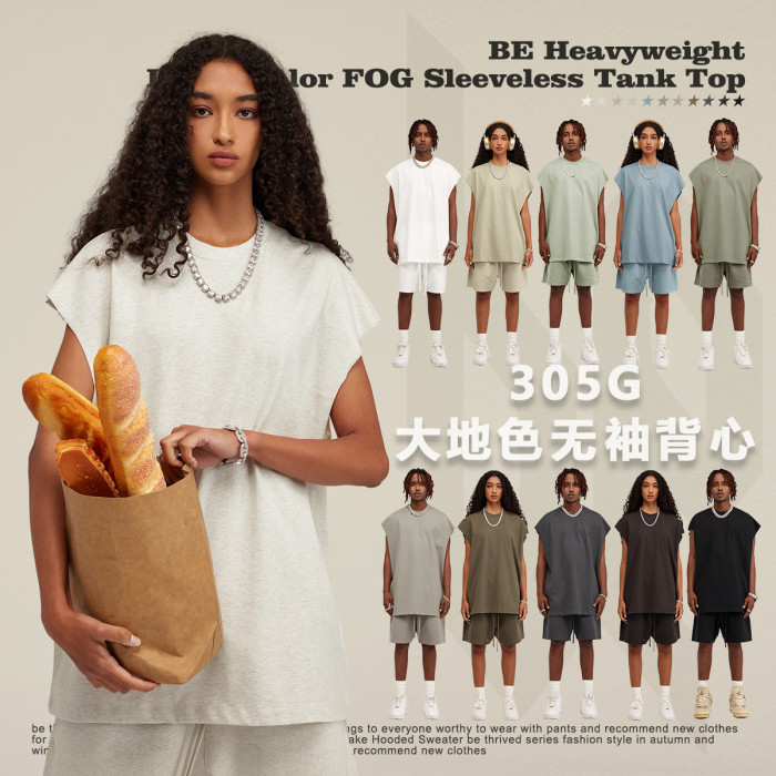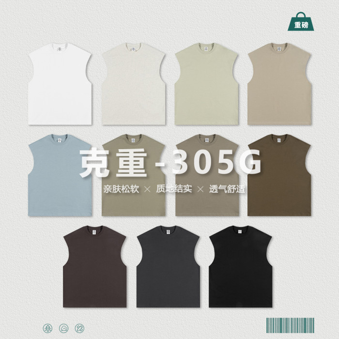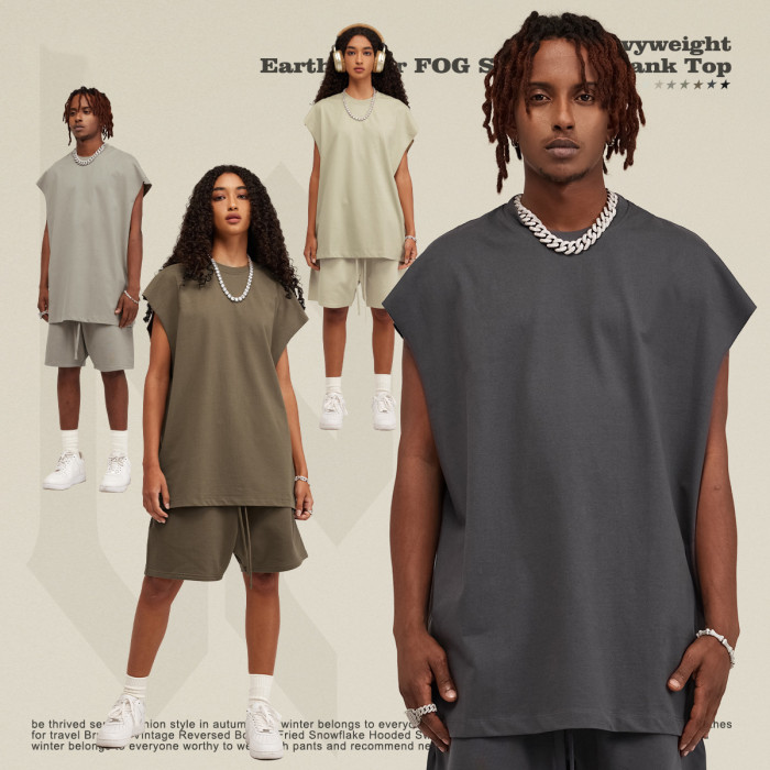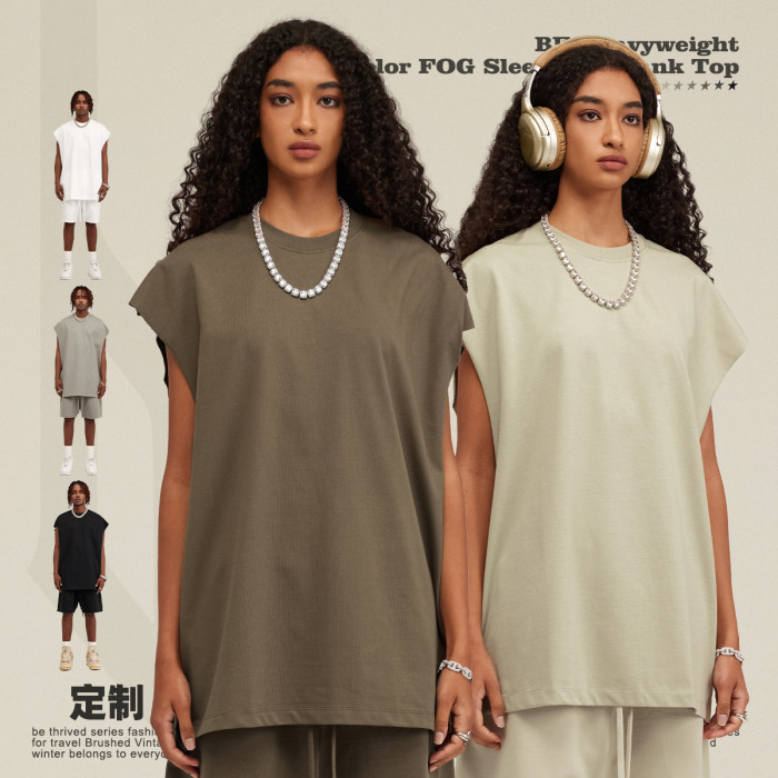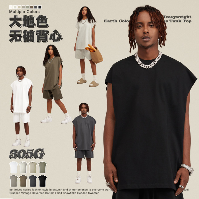 305G美式重磅純棉運動背心無袖男夏純色歐美寬松高街潮牌坎肩T恤