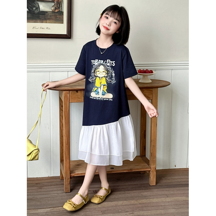 女童夏裝連衣裙2025新款洋氣女孩夏季裙子兒童網紗拼接短袖T恤裙