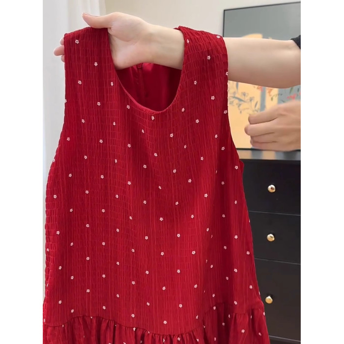 一慄莎子~法式紅色無袖背心波點連衣裙子女夏季新款氣質花苞短裙