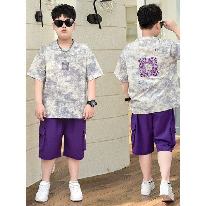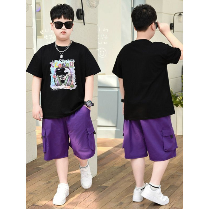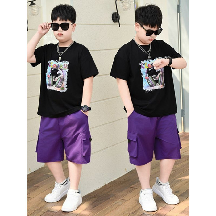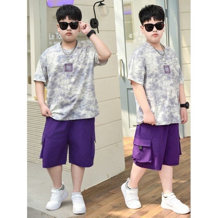 安哼安哼胖男童短袖中褲休閒兩件套寬松大童男孩半袖工裝短褲套裝