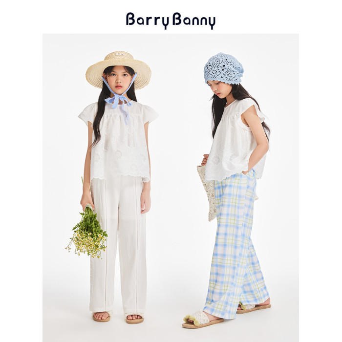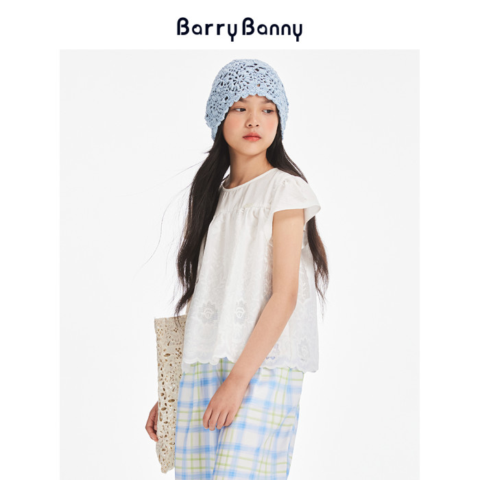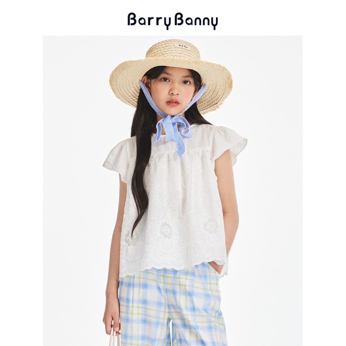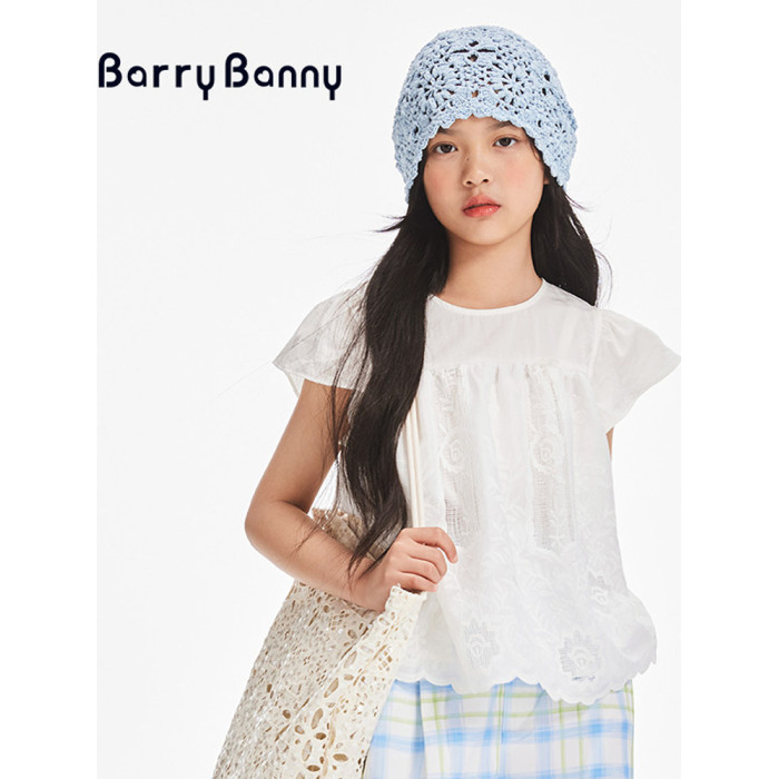 BarryBanny女童蕾絲短袖2025夏季新款兒童小飛袖T恤洋氣寬松上衣