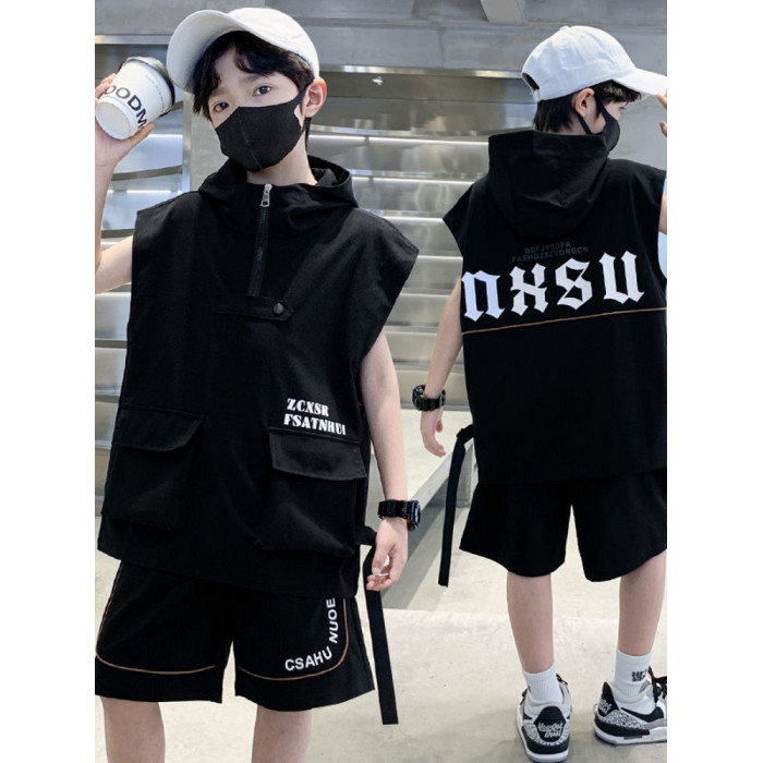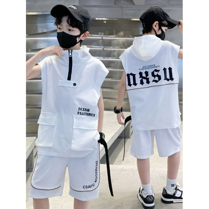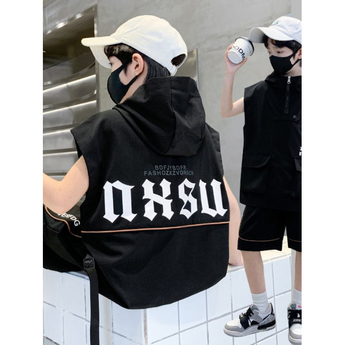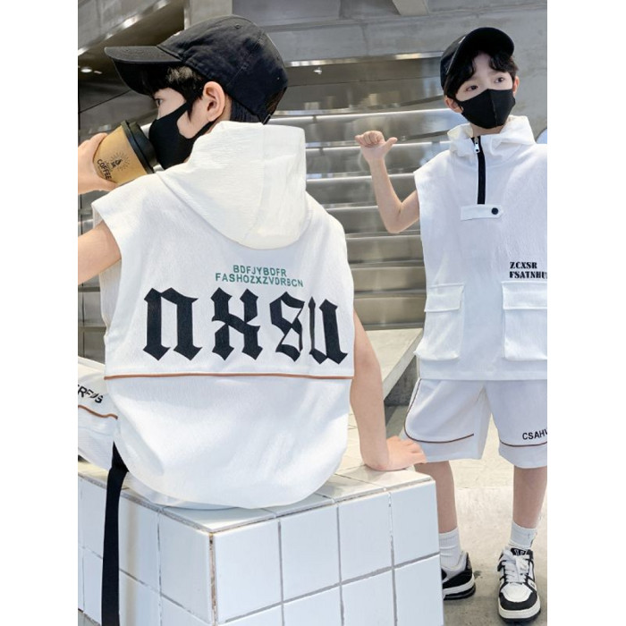 安哼安哼5男童運動連帽背心套裝2025新款夏季兒童帥氣無袖T恤短褲
