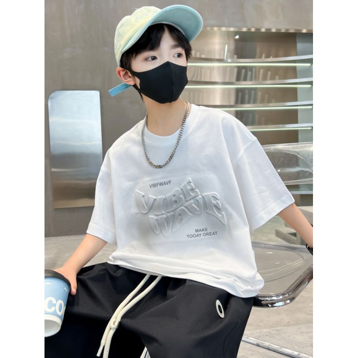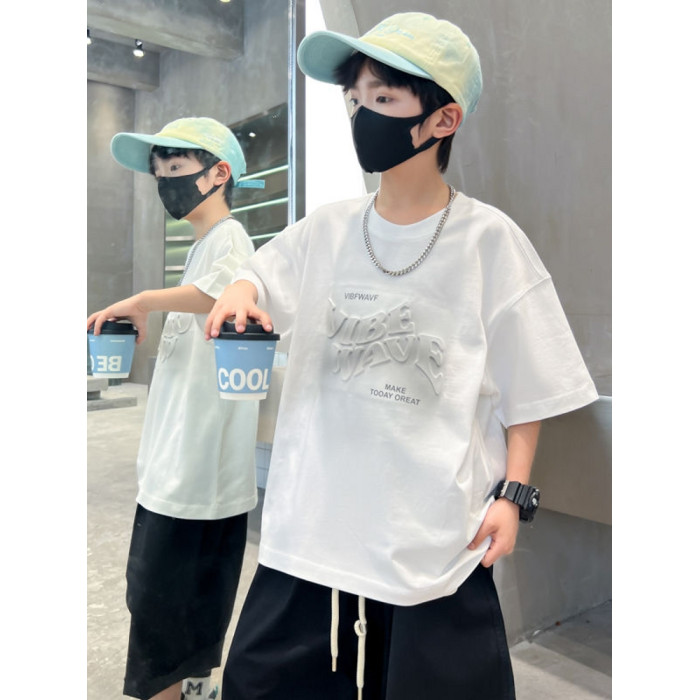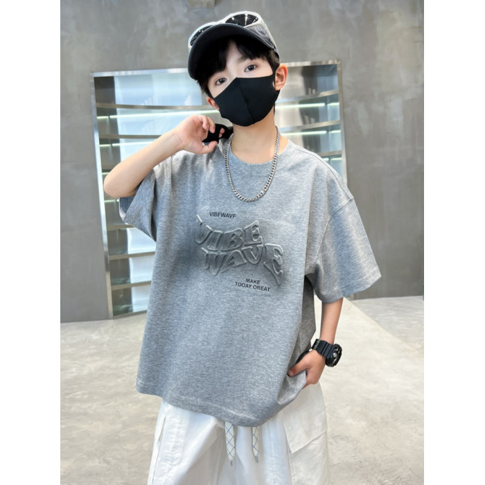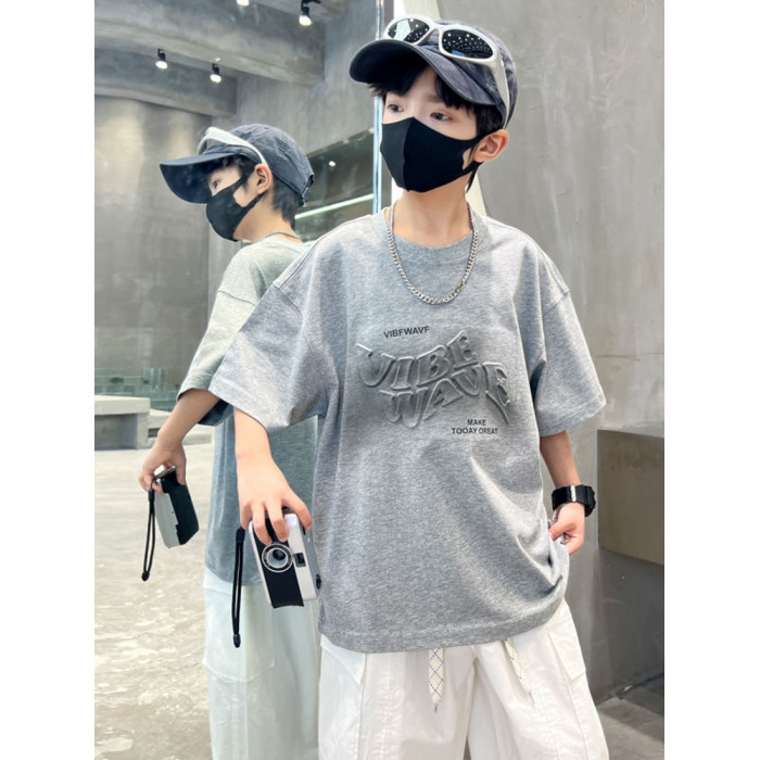 男童壓花短袖T恤2025新款兒童夏裝灰色半袖大童夏季痞帥風上衣潮t