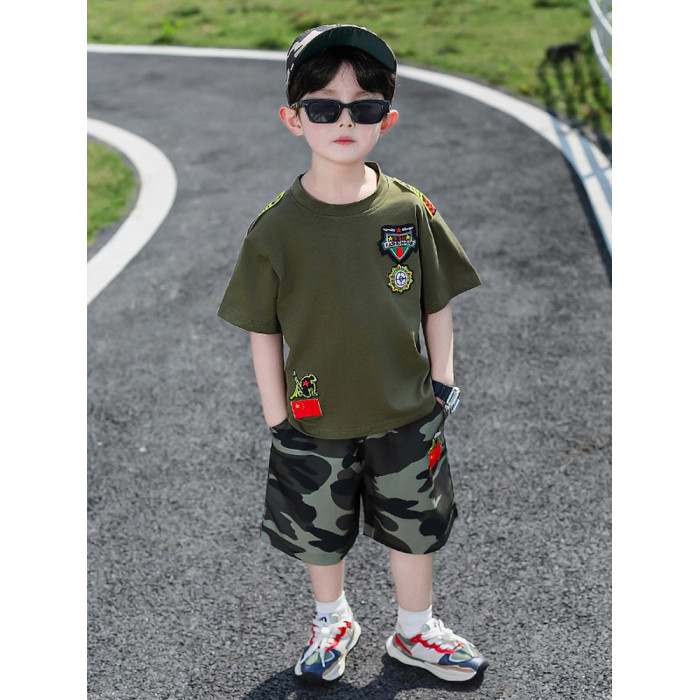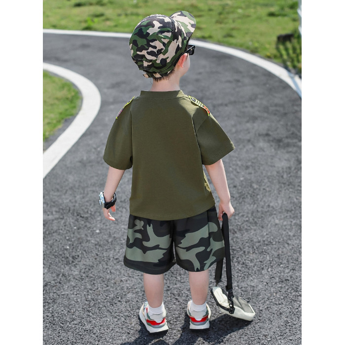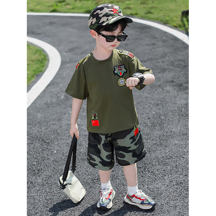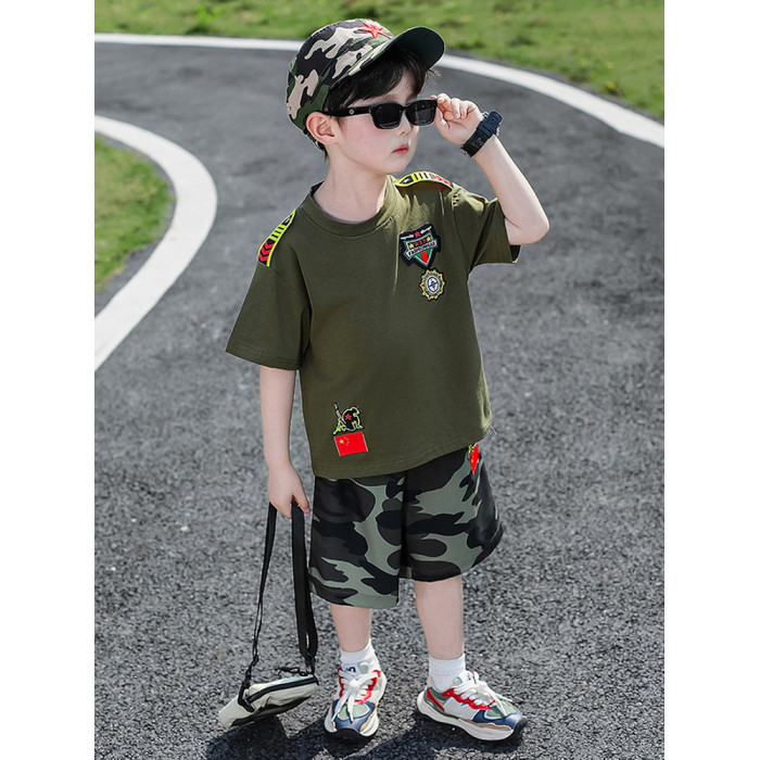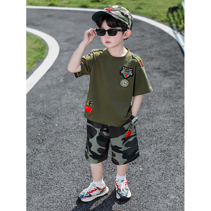 香港BAKUXIA男童短袖迷彩套裝夏裝中大兒童夏令營軍訓衣服兩件套