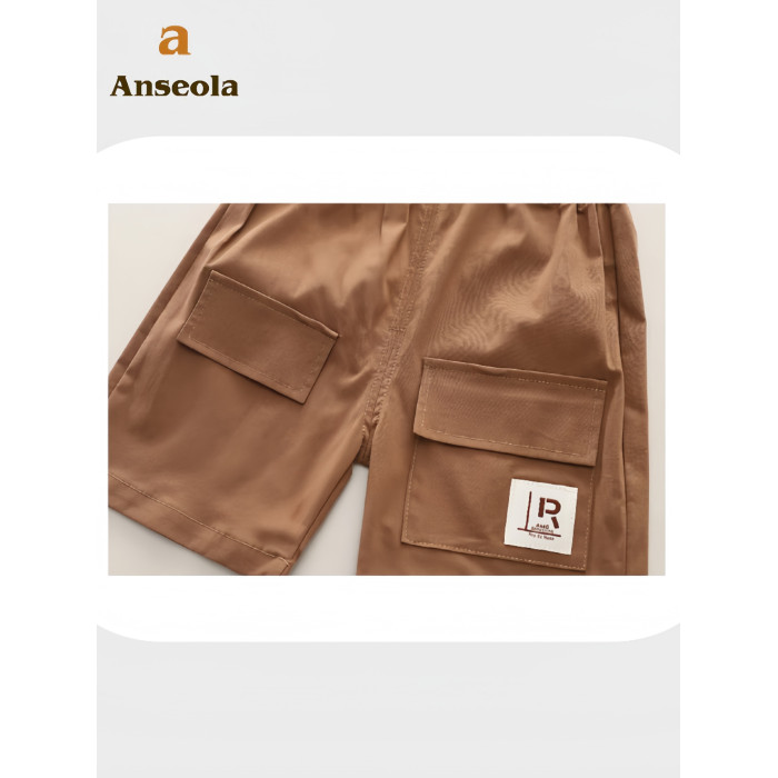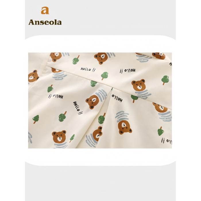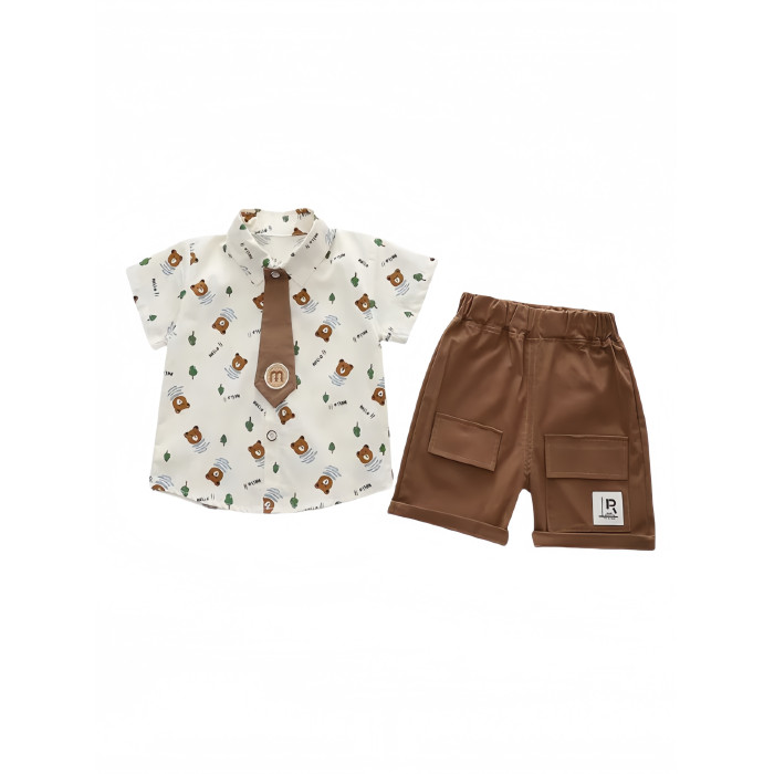 法國anseola夏季男童短款套裝兒童卡通小熊襯衫領帶短褲兩件套