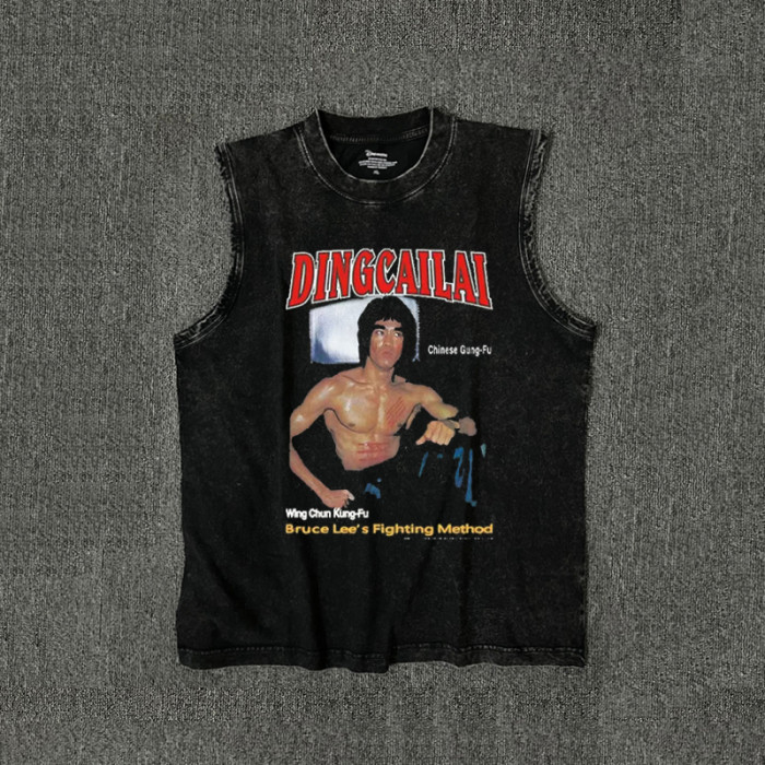 李小龍街頭運動潮流背心嘻哈暗黑復古風做舊洗水美式寬松無袖T恤