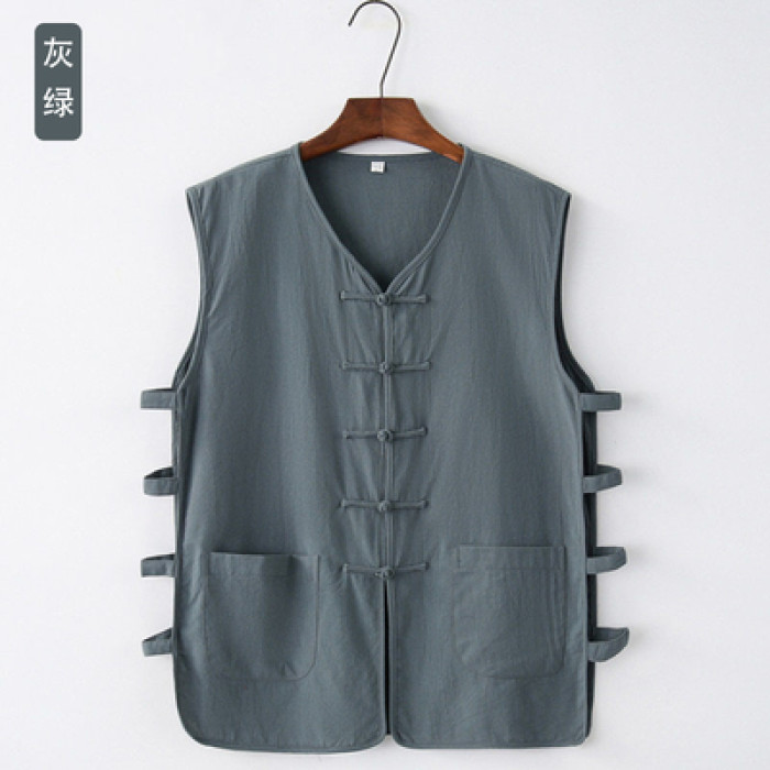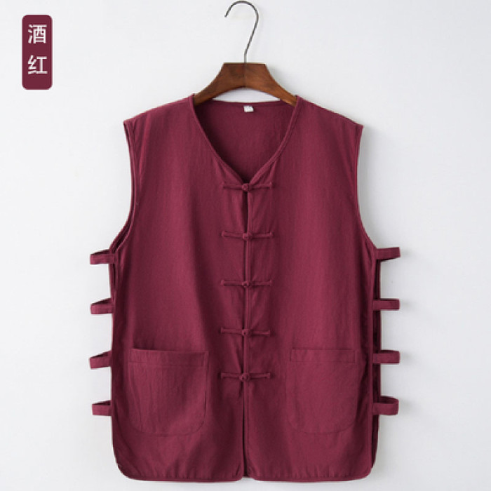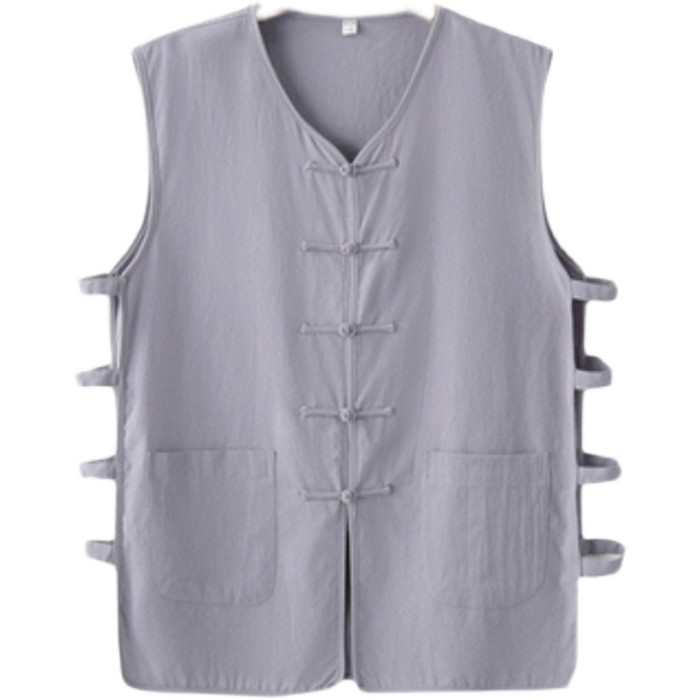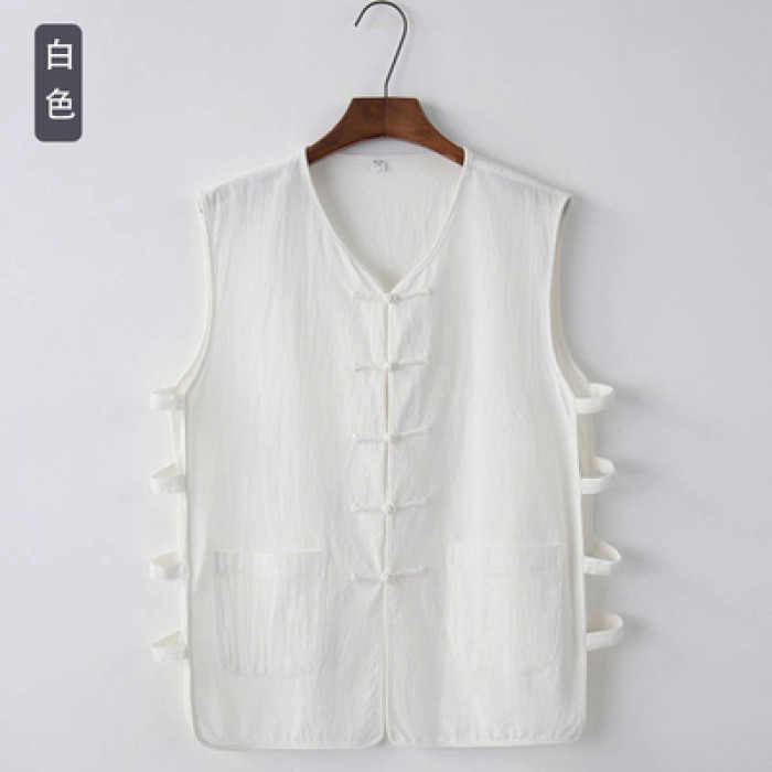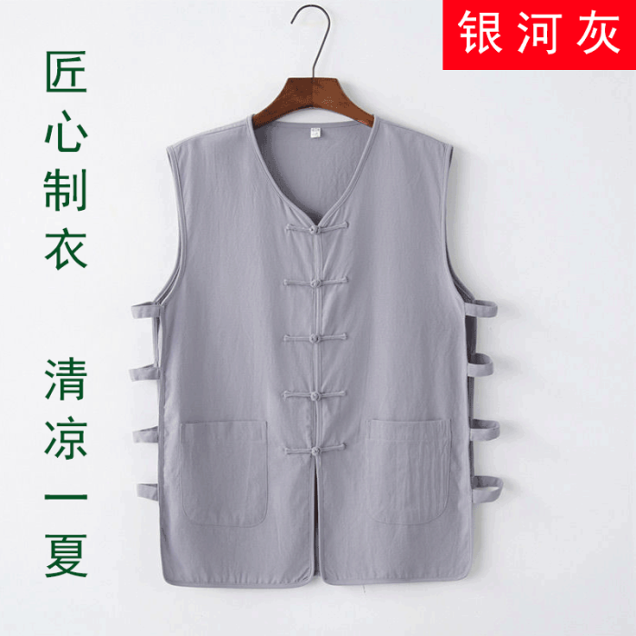 夏季棉麻無領汗衫坎肩馬褂老頭衫背心風唐裝男薄寬松休閒透氣