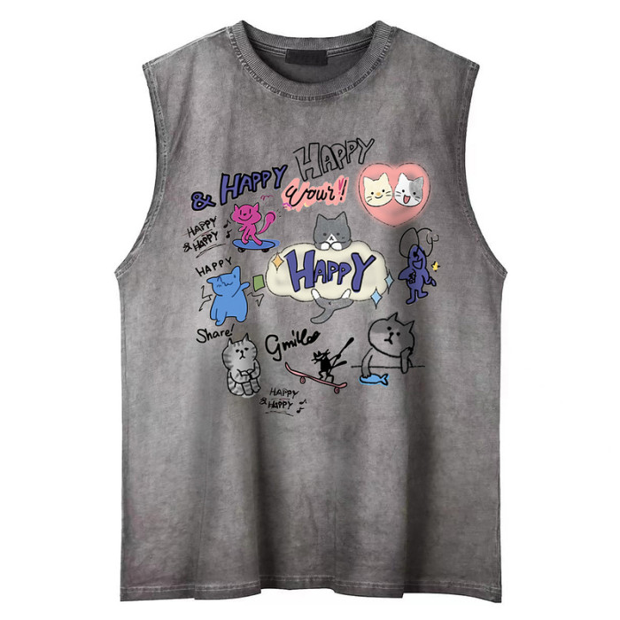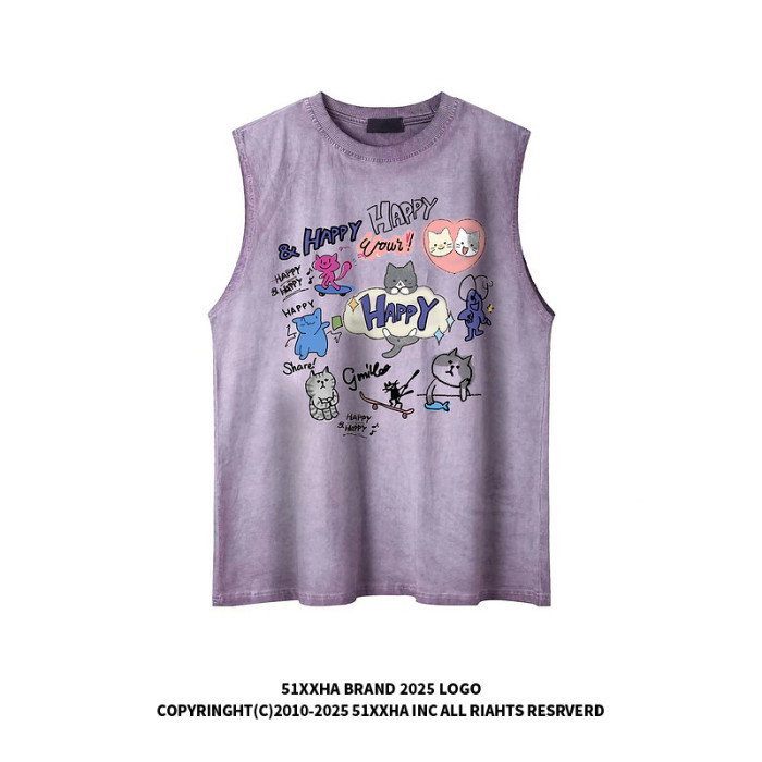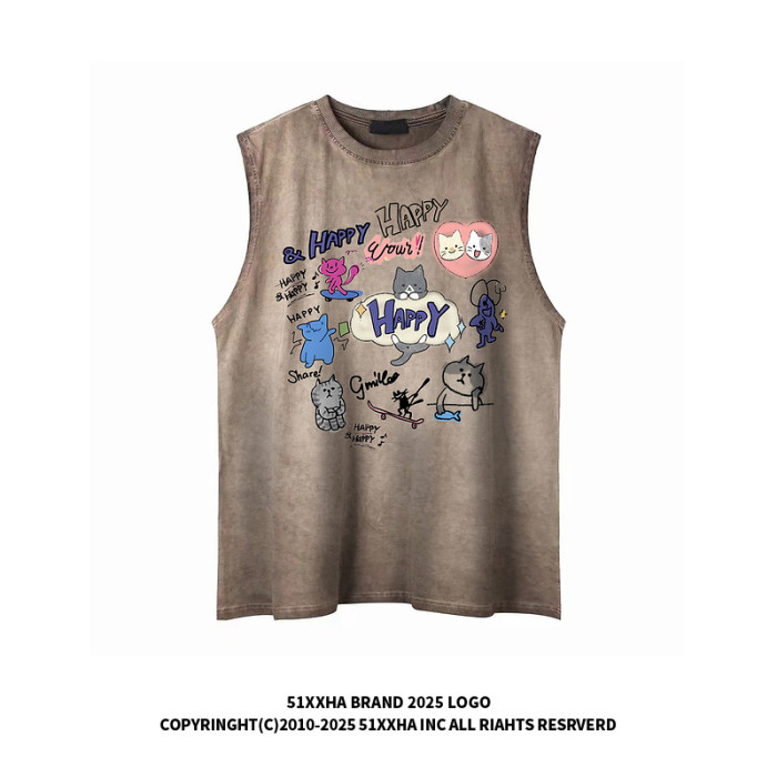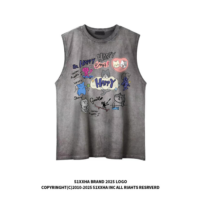 51嘻哈夏季潮牌卡通貓咪印花無袖T恤美式髒洗做舊運動坎肩背心男