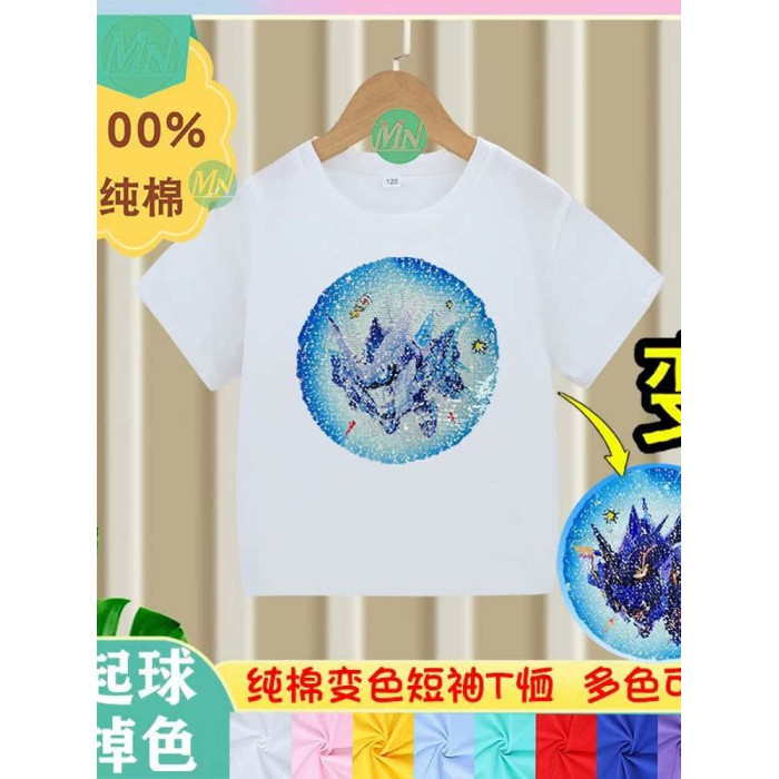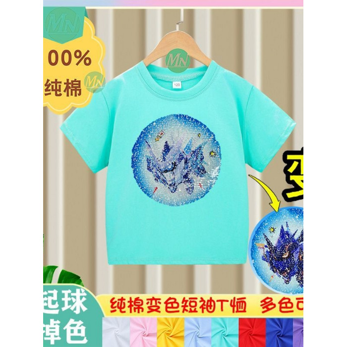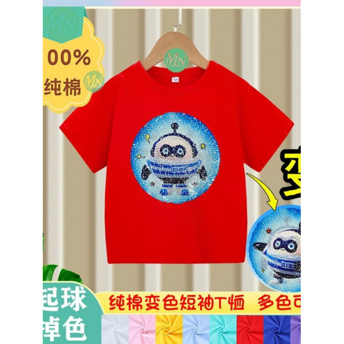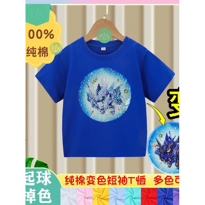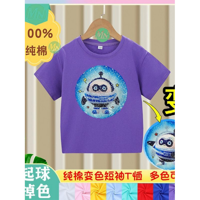 安哼安哼純棉男童短袖t恤夏兒童亮片蛋仔卡通男童女孩上衣可變色