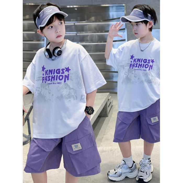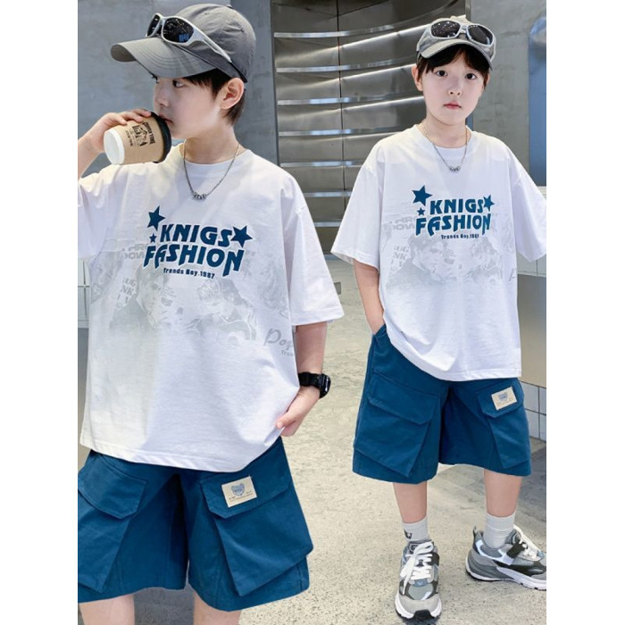 中大童男孩夏裝短袖套裝2025新款兒童裝男童夏季洋氣百搭打底衫潮